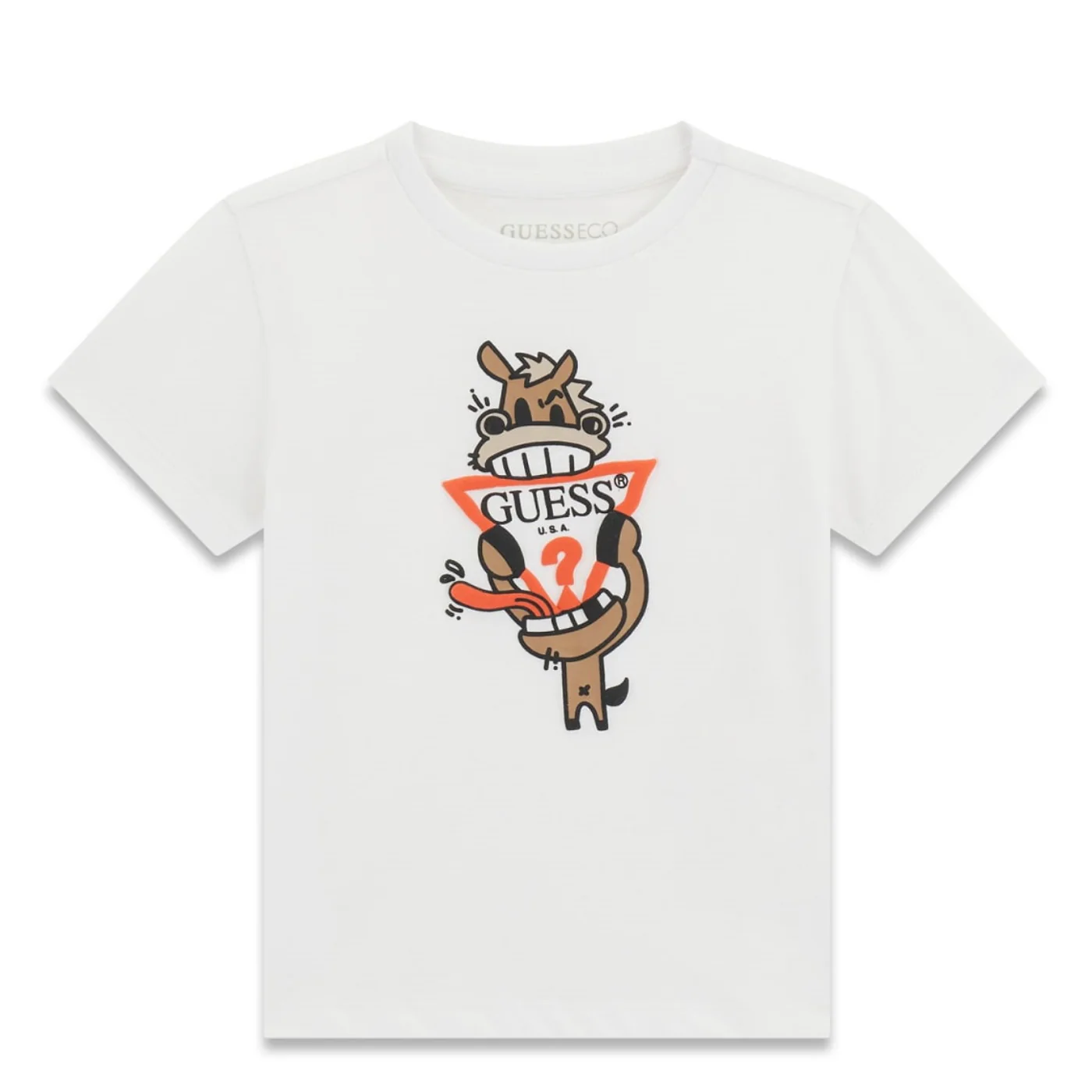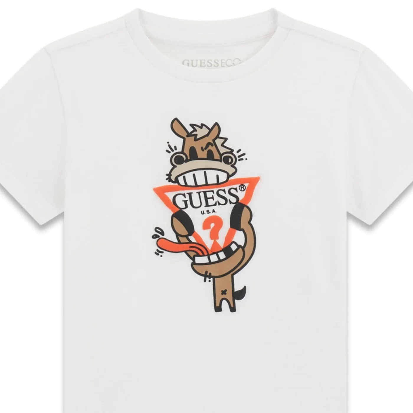 Guess t-shirt girocollo bambino in cotone biancaManiche corte Logo con stampa frontaleComposizione: 100% cotoneMade in IndiaCollezione Primavera Estate Vestibilitร :Taglia Etร