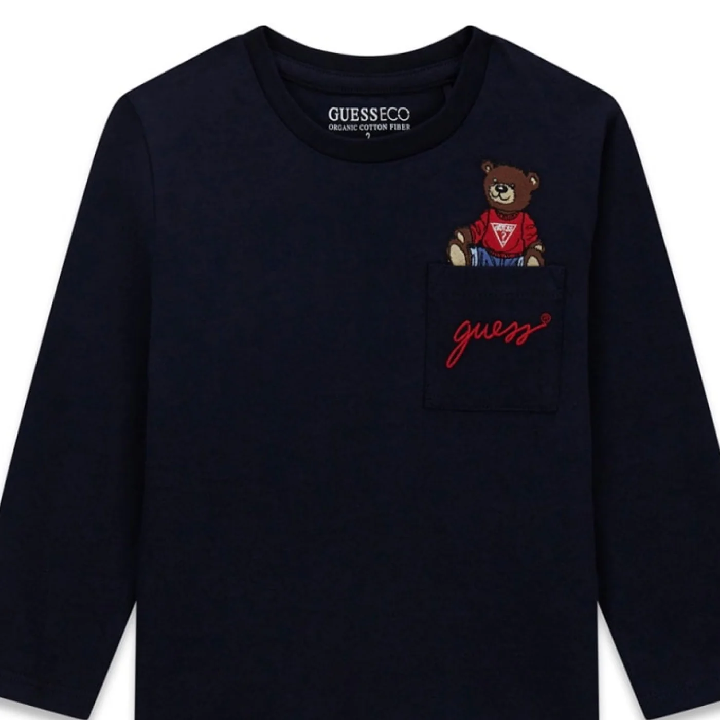 Guess t-shirt girocollo bambino in cotone bluManiche lunghe Ricamo teddy e logo su tasca a toppa lato cuoreComposizione: 100% cotone Made in IndiaCollezione Primavera Estate Vestibilitร :Taglia Etร
