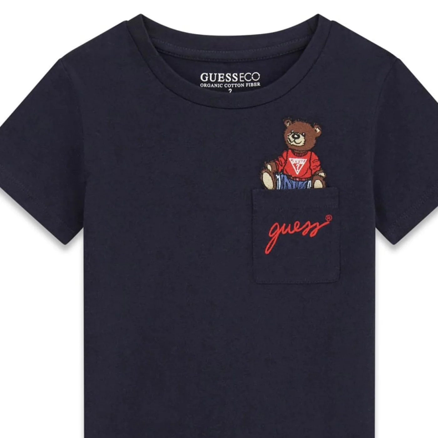 Guess t-shirt girocollo bambino in cotone blu Maniche corte Tasca lato cuore con ricamo teddy e logoComposizione: 100% cotoneMade in IndiaCollezione Primavera Estate Vestibilitร :Taglia Etร