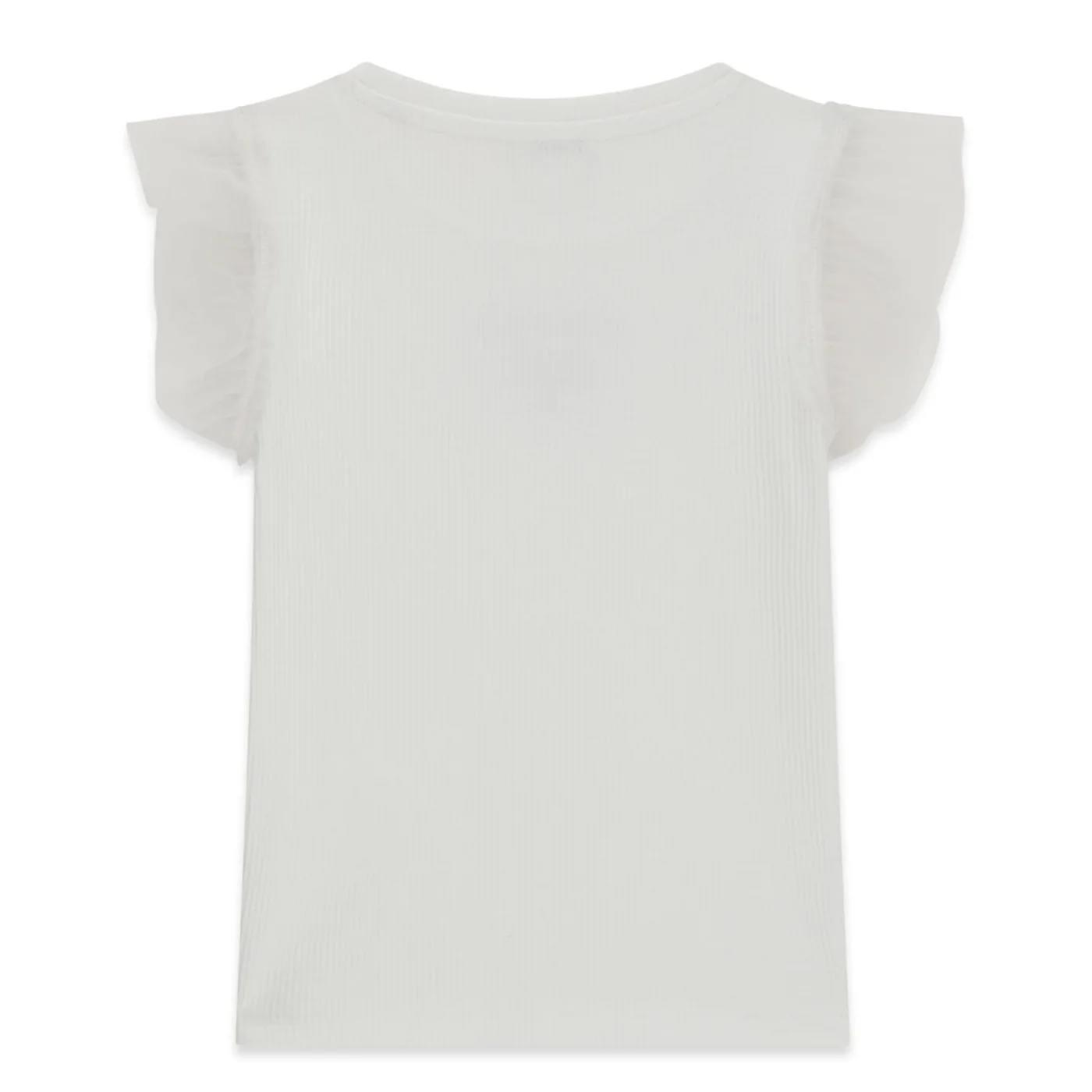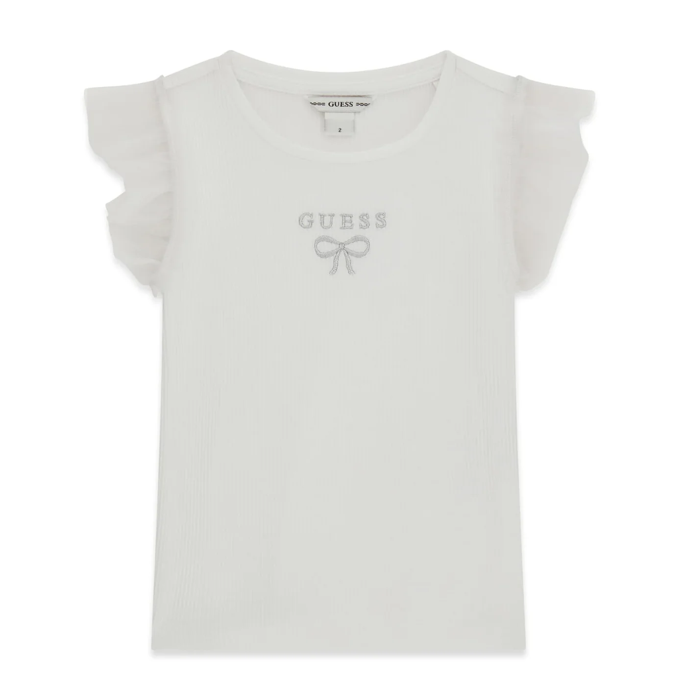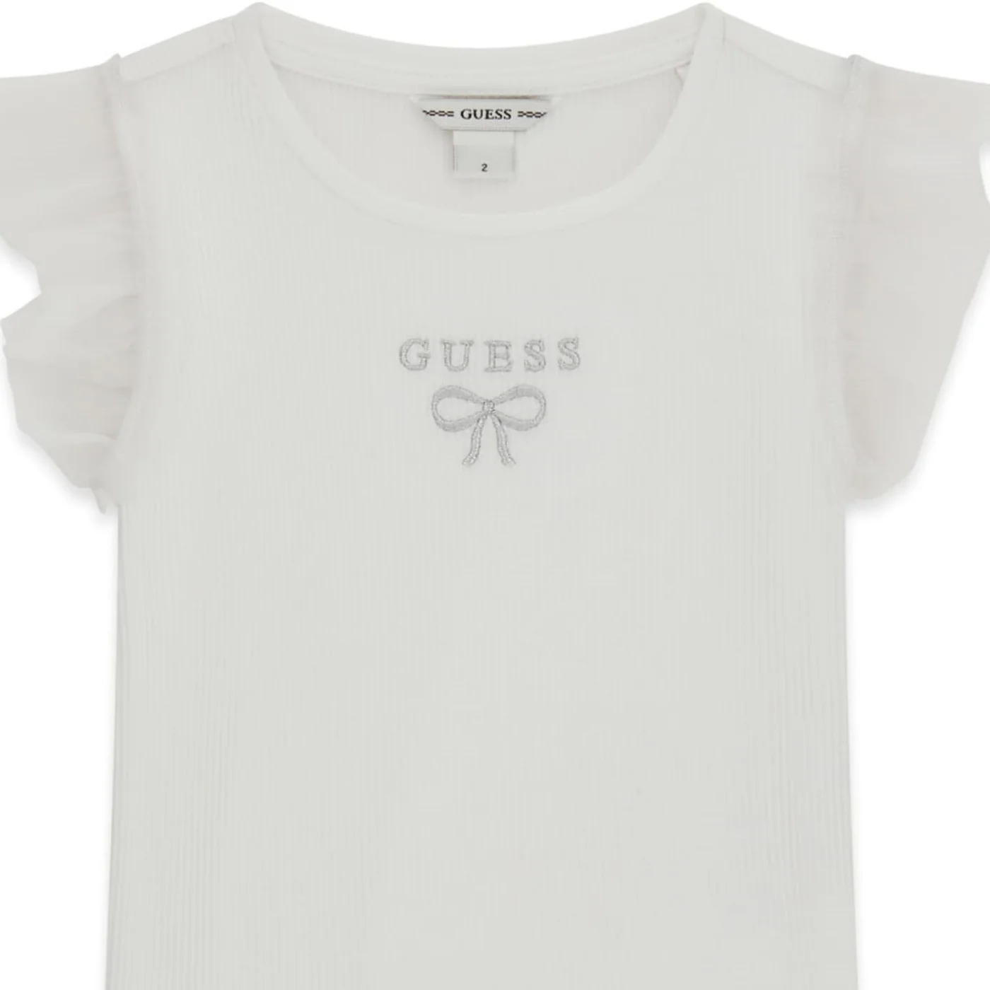 Guess t-shirt girocollo neonata a costine bianca Maniche con tulle Logo in strass frontaliComposizione: 95% cotone 5% eladstanMade in IndiaCollezione primavera Estate Vestibilitร :Taglia Etร