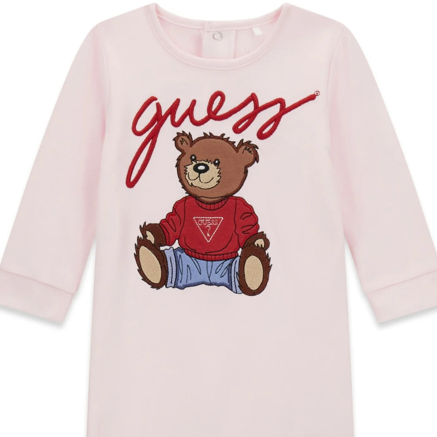 Guess tutina girocollo neonata in filo di cotone rosaManiche lunghe Ricamo teddy con logo frontale Chiusura entrogamba e sul retro con bottoni a pressioneComposizione: 100% cotoneMade in CinaCollezione Primavera Estate Vestibilitร :Taglia Etร