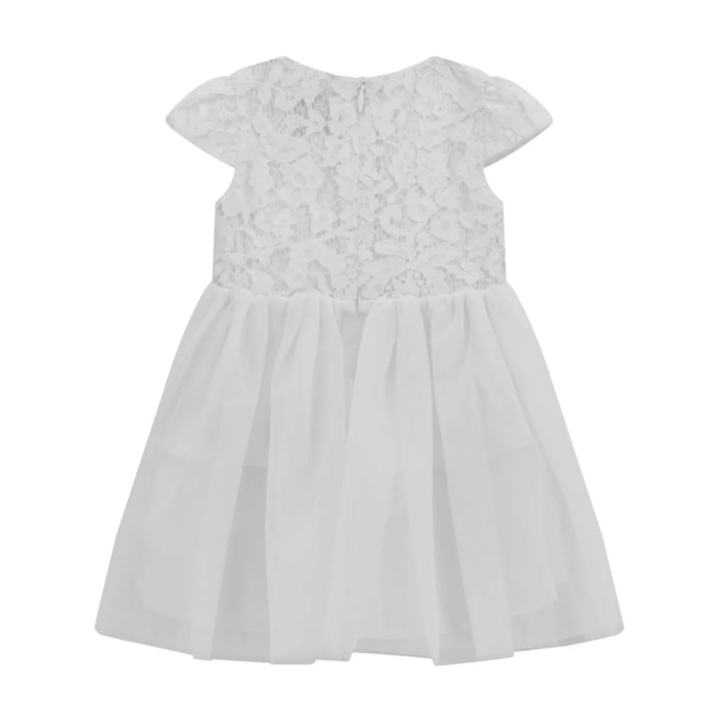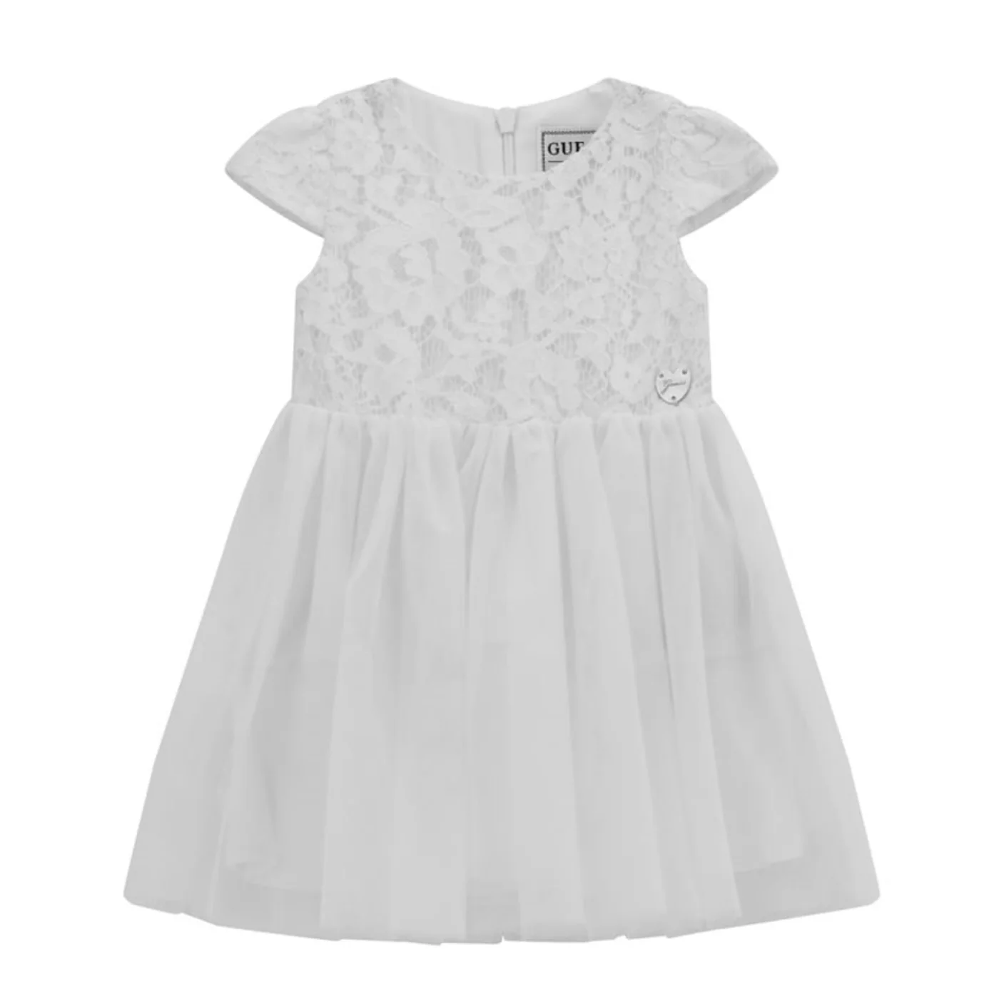 Guess vestito girocollo bambina in misto viscosa bianco Maniche corte Parte superiore in pizzo Fondo in tulle Patch logo in metallo sul lato vita Chiusura sul retro con cerniera Coulotte elasticaComposizione: 40% cotone 30% poliammide 30% viscosaMade in CinaCollezione Primavera Estate Vestibilitร :Taglia Etร