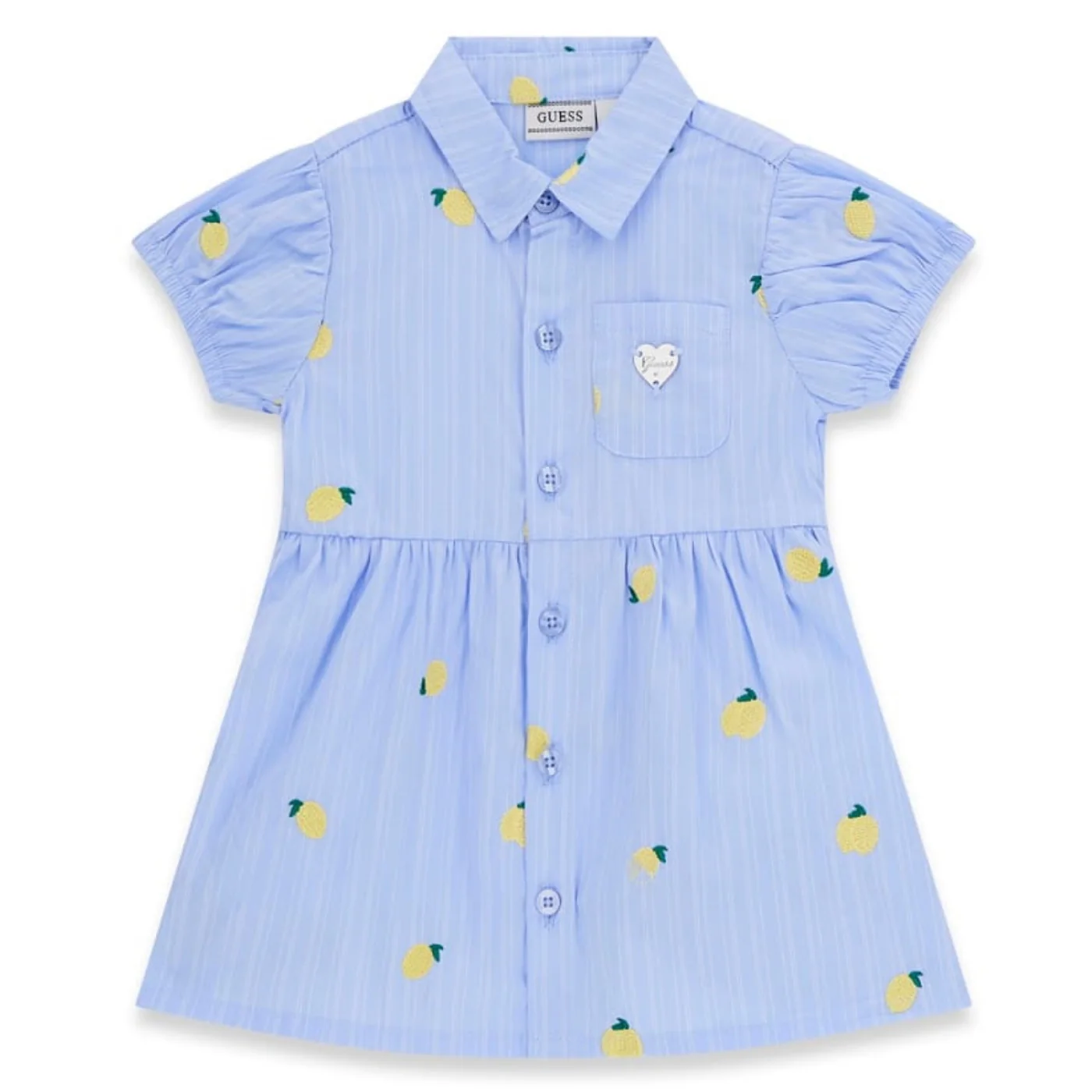 Guess vestito con coulotte neonata in cotone celeste a righe bianco Collo a camicia Maniche corte Chiusura centrale con bottoni Ricami limoni all overPatch logo in metallo su tasca a toppa lato cuoreCoulotte elasticaComposizione: 100% cotone Made in CinaCollezione Primavera Estate Vestibilitร :Taglia Etร
