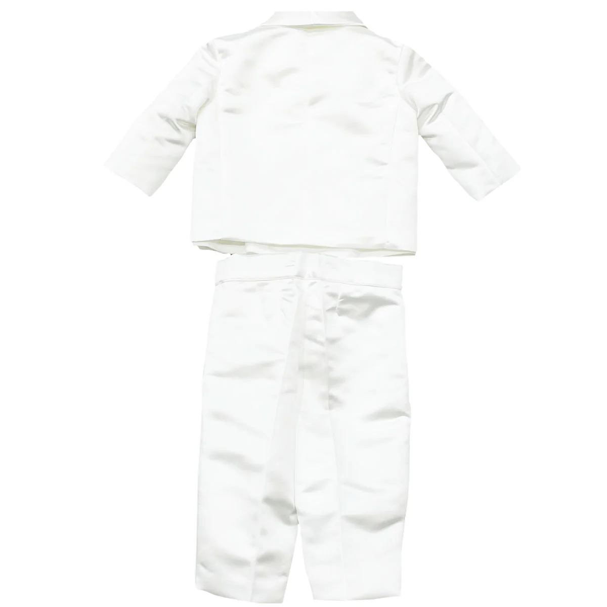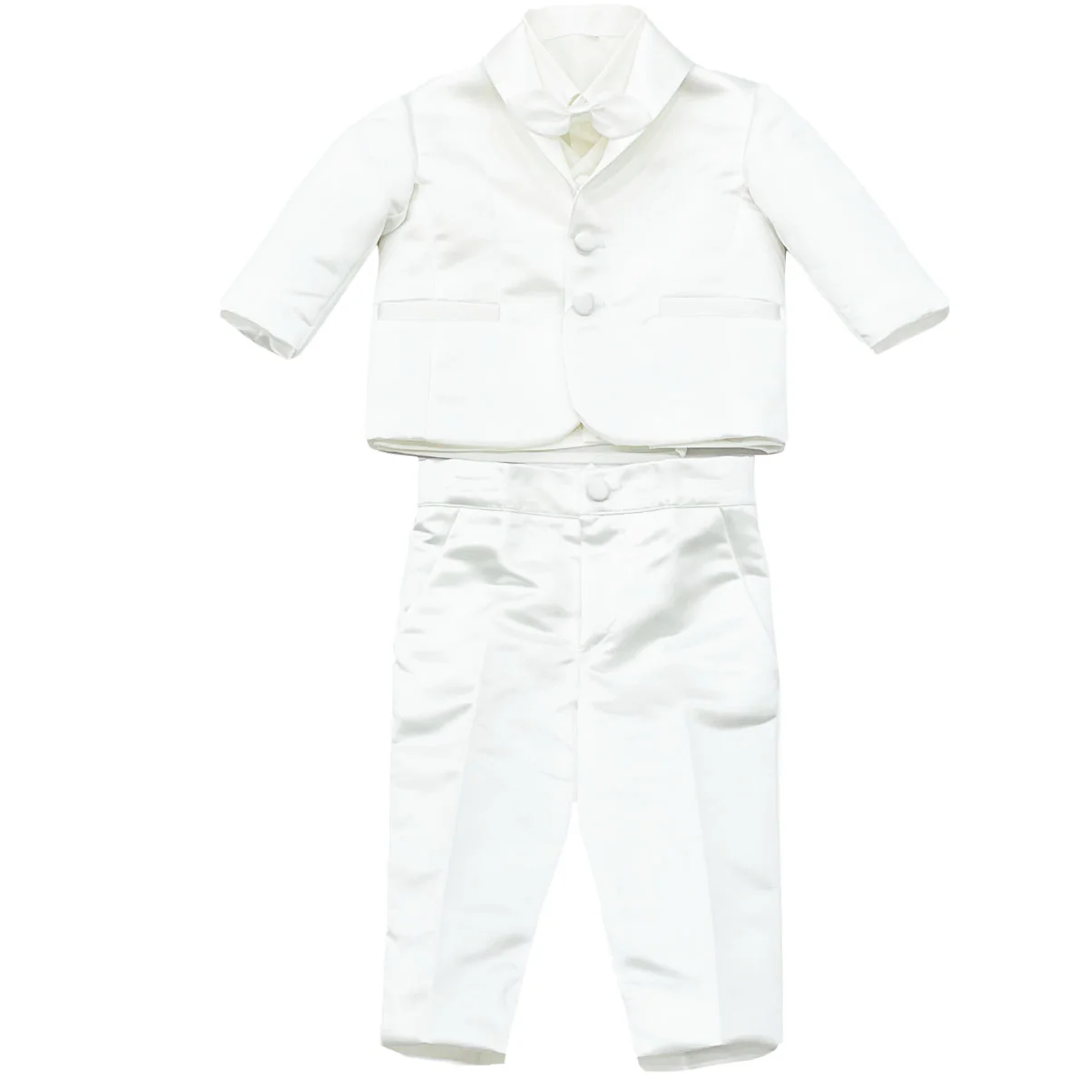 Isabel & Martinez completo 5 pezzi cerimonia neonato biancoGiacca collo revers a specchio Camicia maniche lunghe con papillon removibilePanciotto Pantalone con bottone e zipComposizione: 100% poliestere Fodera: 65% poliestere 35% cotoneMade in ItalyCollezione continuativa Vestibilitร :Taglia Etร