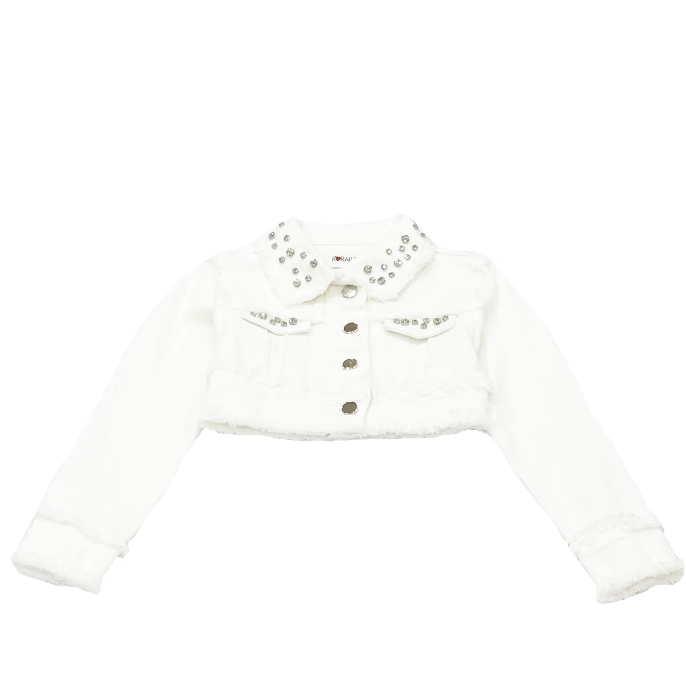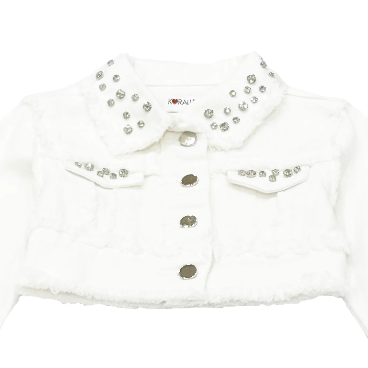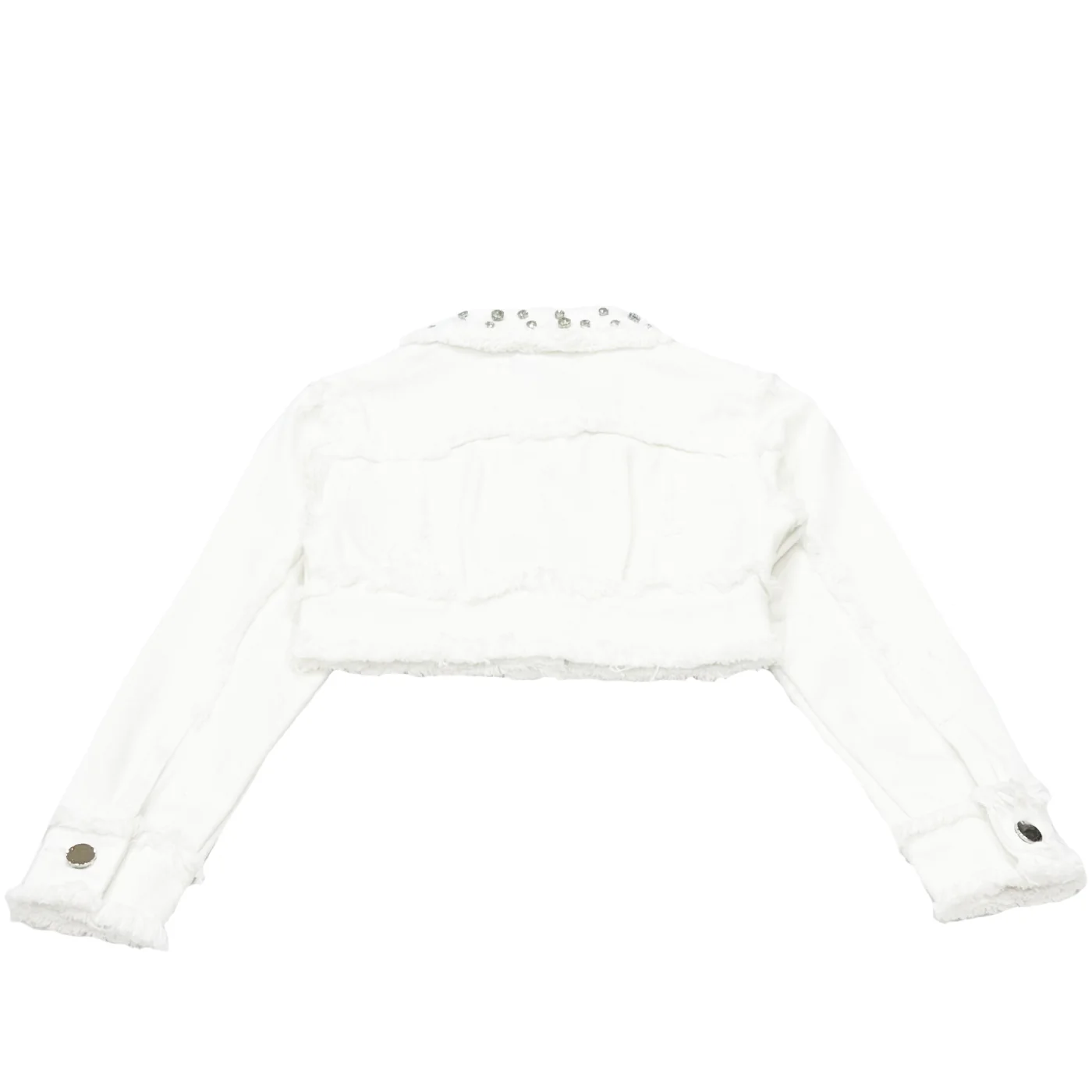 Koralline giubbino bambina in cotone bianco Collo a camicia Chiusuara con bottoni frontali Tasche frontali con patta Dettagli strass Composizione: 100% cotoneMade in CinaCollezione Primavera Estate Vestibilitร :Taglia Etร