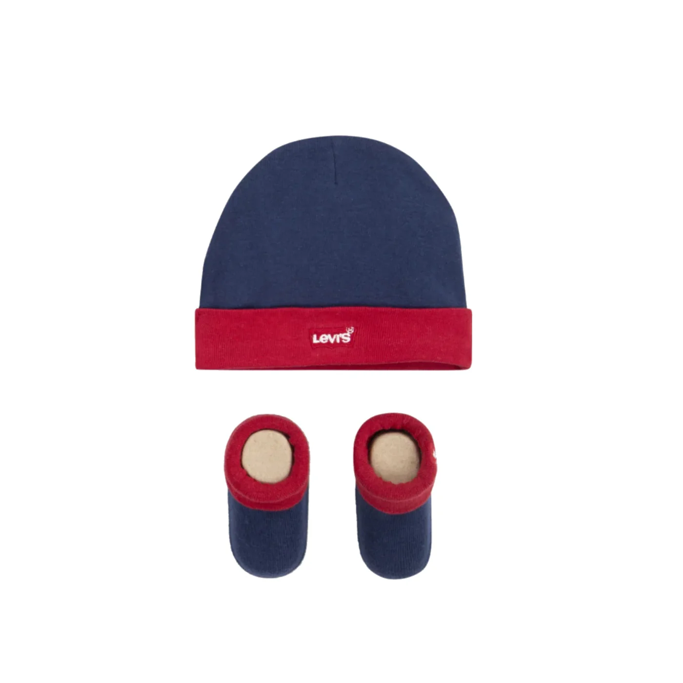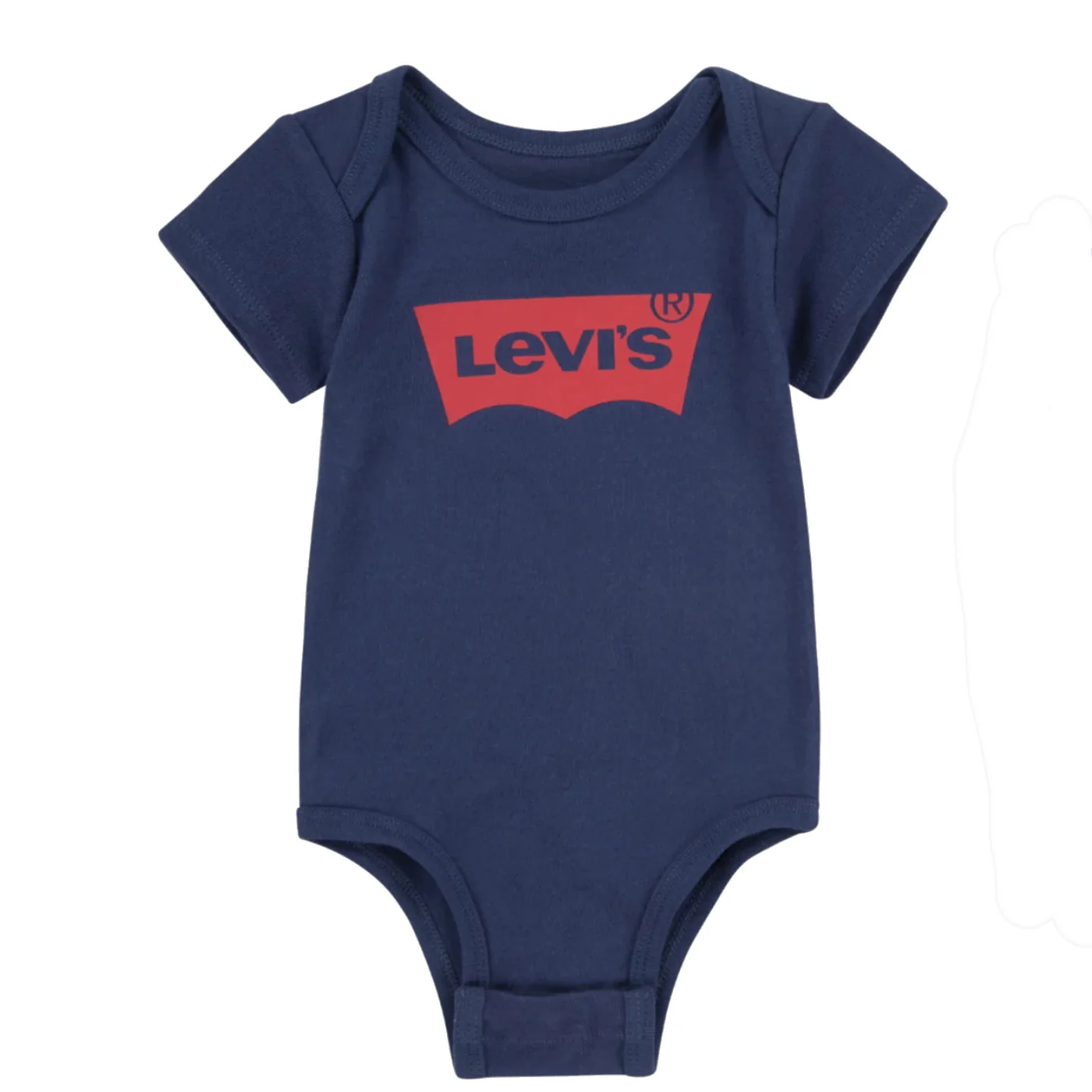 Levi’s set tre pezzi neonato in cotone bluBody scollo america Maniche corte Logo frontale Chiusura entrogamba con bottoni a pressione Cappello con logo Babbucce con logoComposizione: 100% cotoneMade in CinaCollezione Primavera Estate Vestibilitร :Taglia Etร