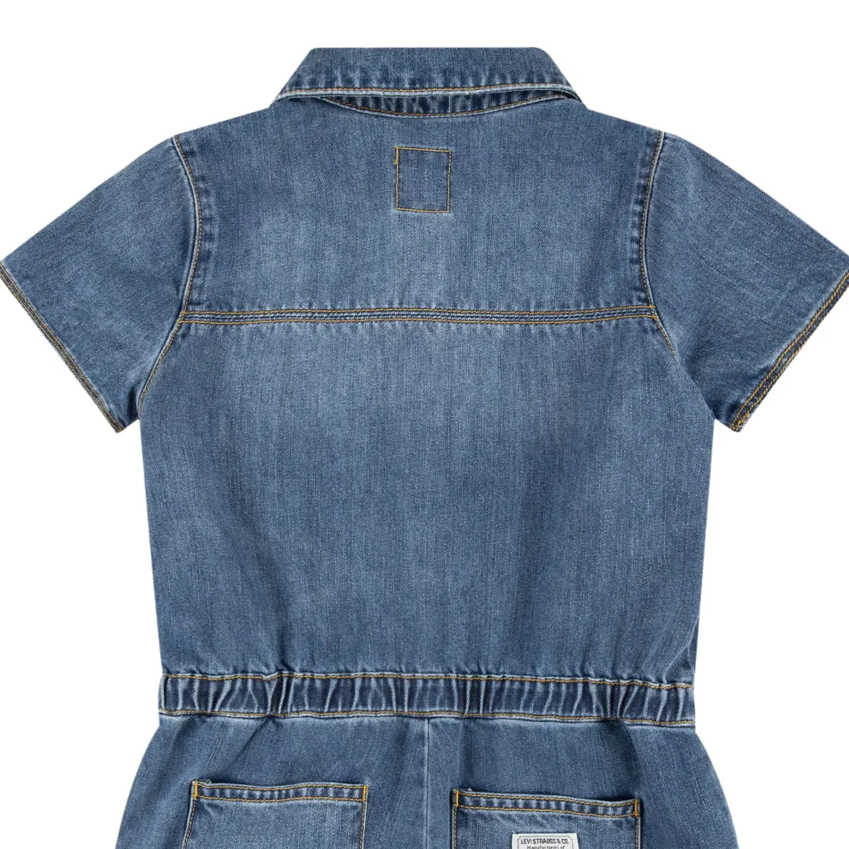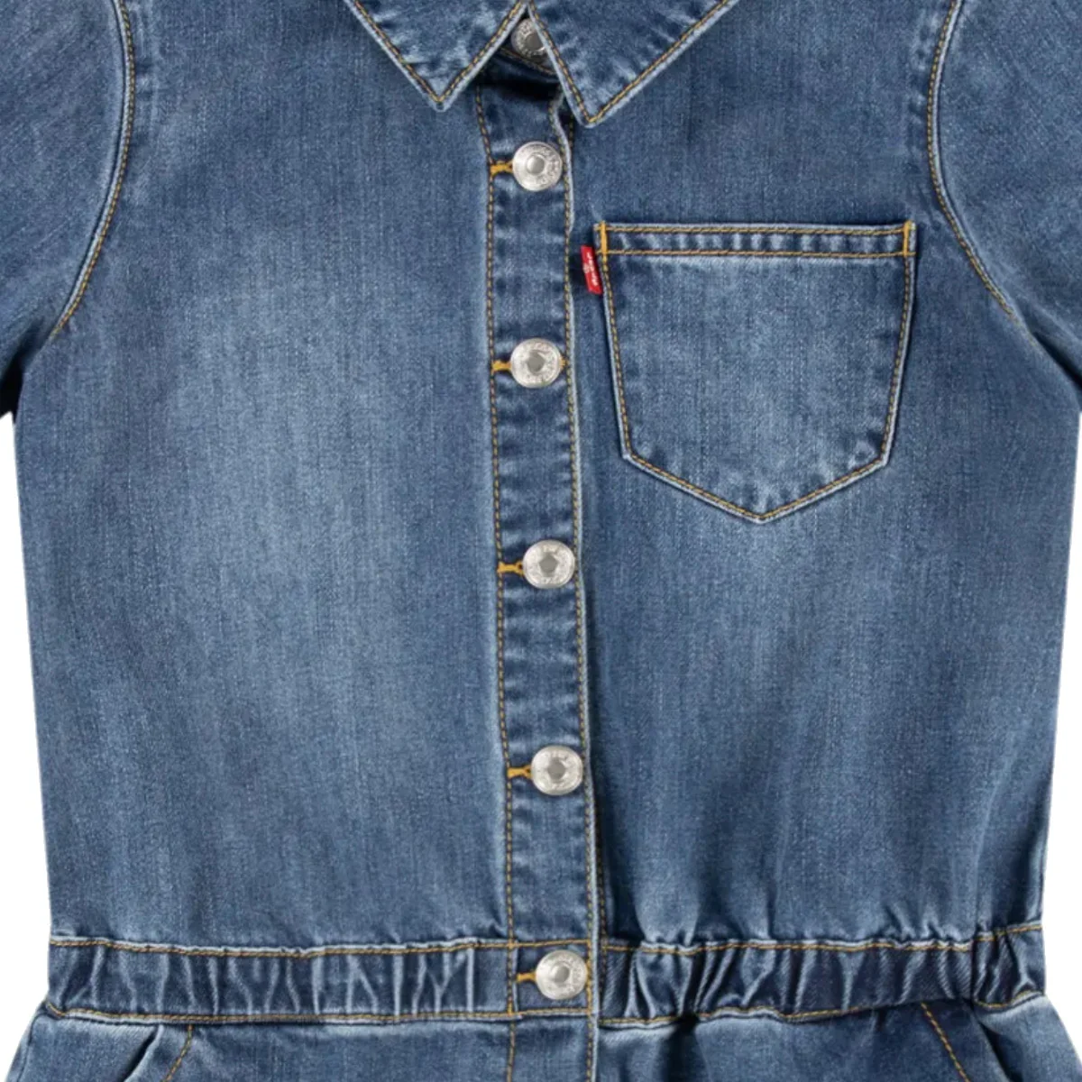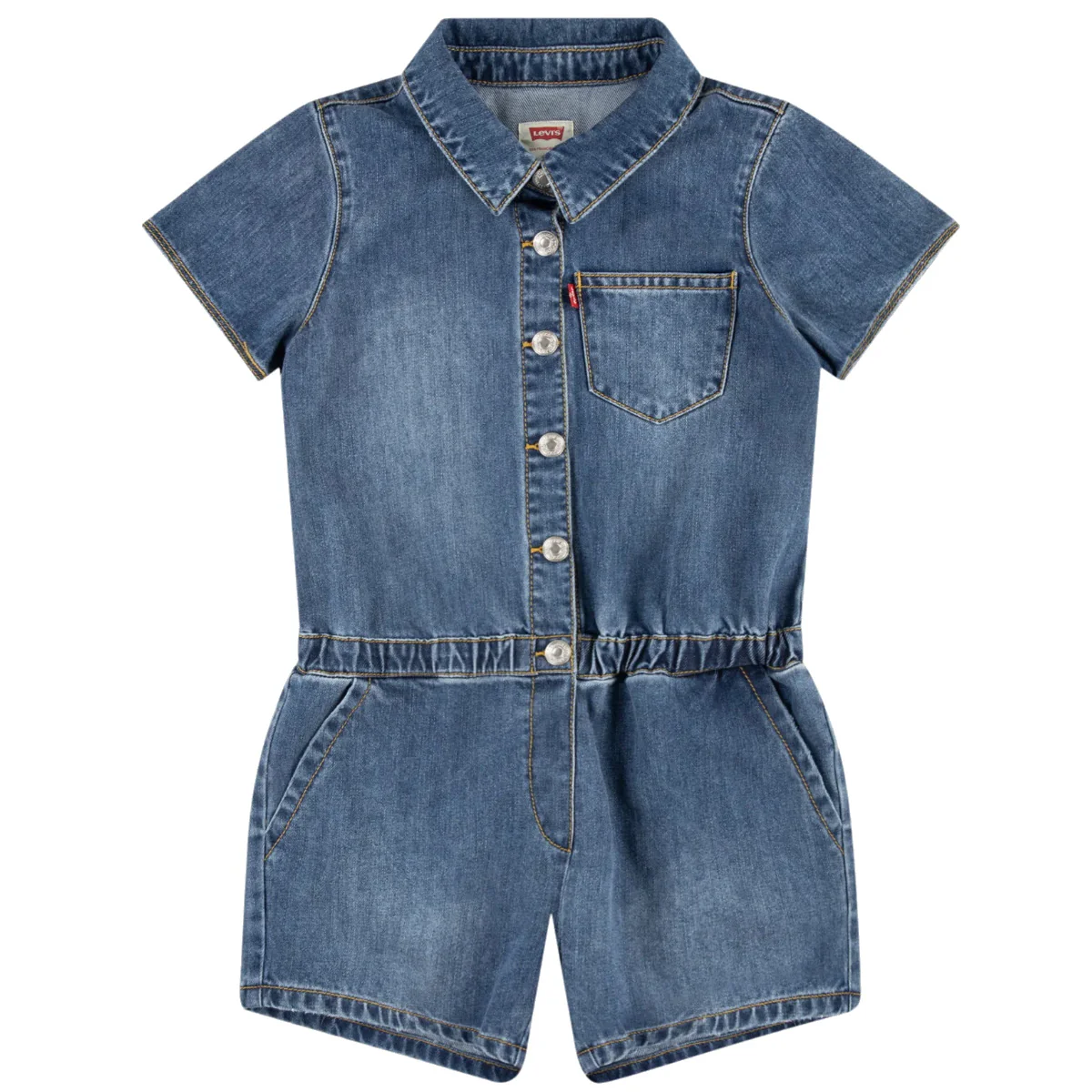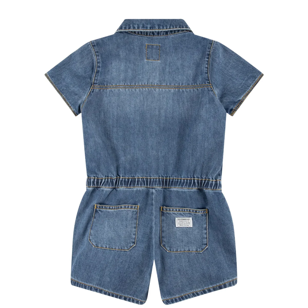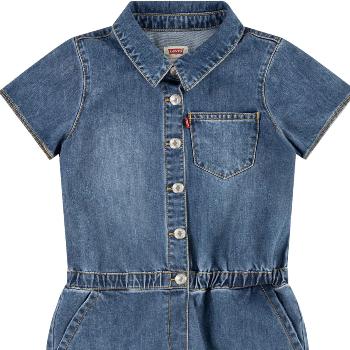 Levi’s tuta shorts baby blu Denin in cotone Maniche corte Chiusura centrale con bottoni a pressione logatiTascha a toppa lato cuore Tasche America eElastico in vita Tasche a toppa posterioriComposizione: 100% cotoneMade in CinaCollezione Primavera Estate Vestibilitร :Taglia Etร