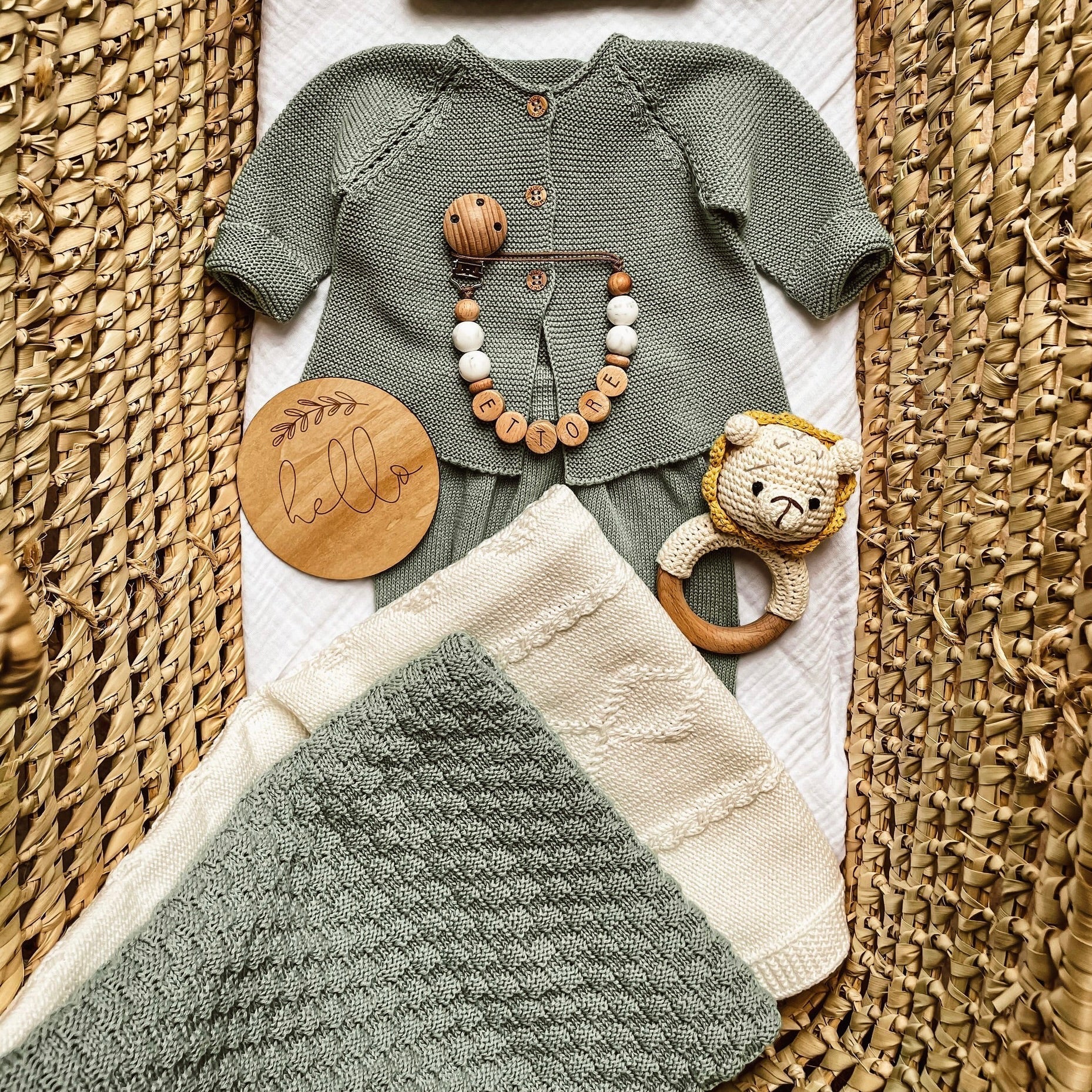 Completino รจ composto da 1 cardigan con bottoni in legno sul davanti e 1 paio di pantaloni con piedini ed รจ realizzato senza cuciture interne, senza causare irritazioni al bambino.