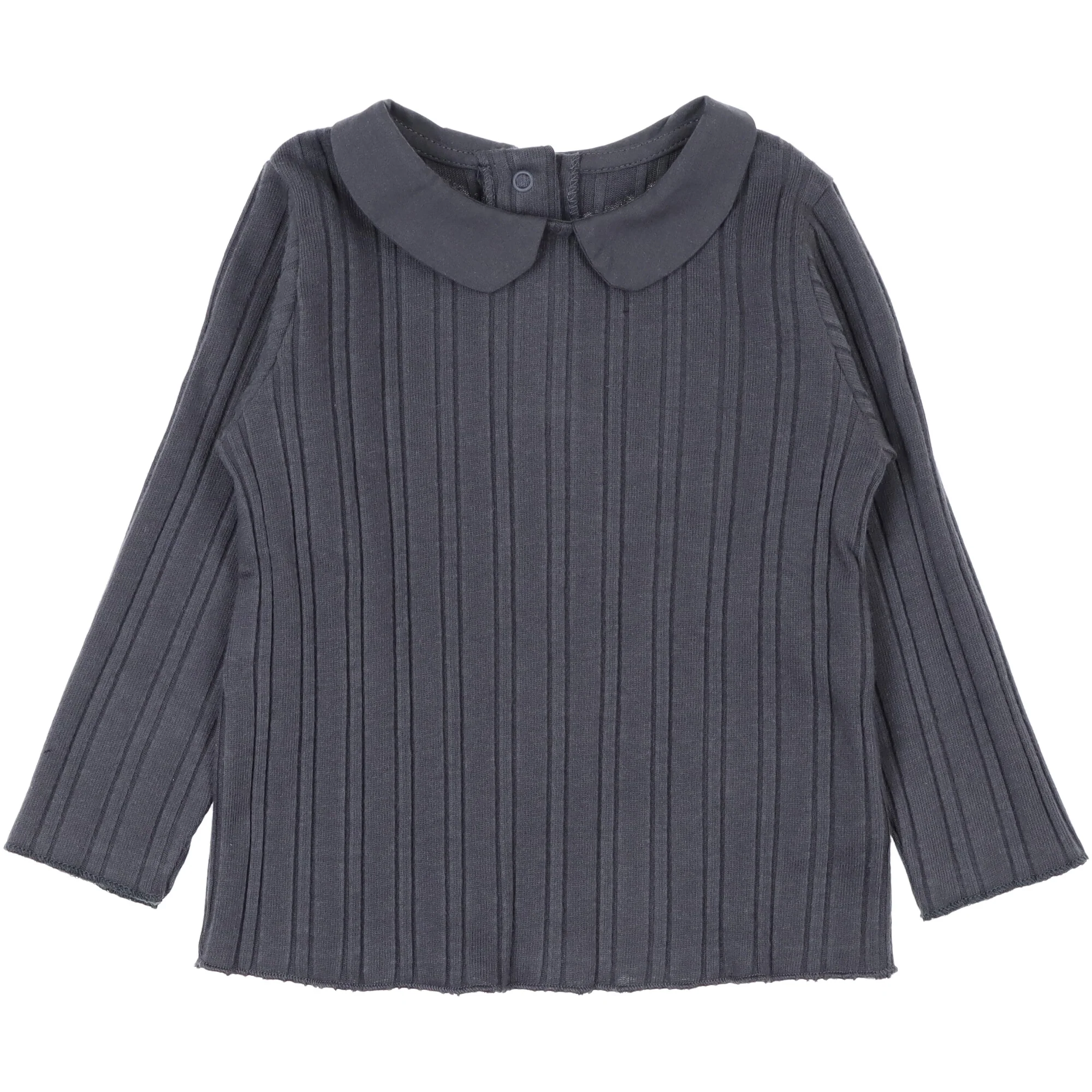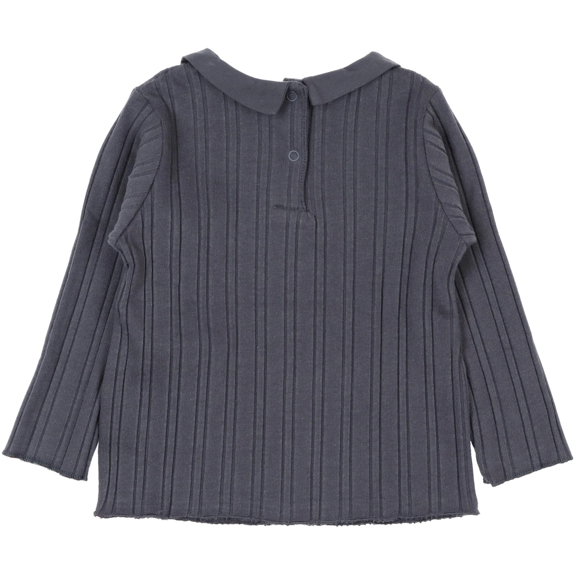 Tshirt in maglina di cotone biologico e cotone riciclato, manica lunga e collo rotondo, con applicazione di colletto in tessuto e un’apertura sulla schiena con bottoni a pressione in metallo senza nichel.