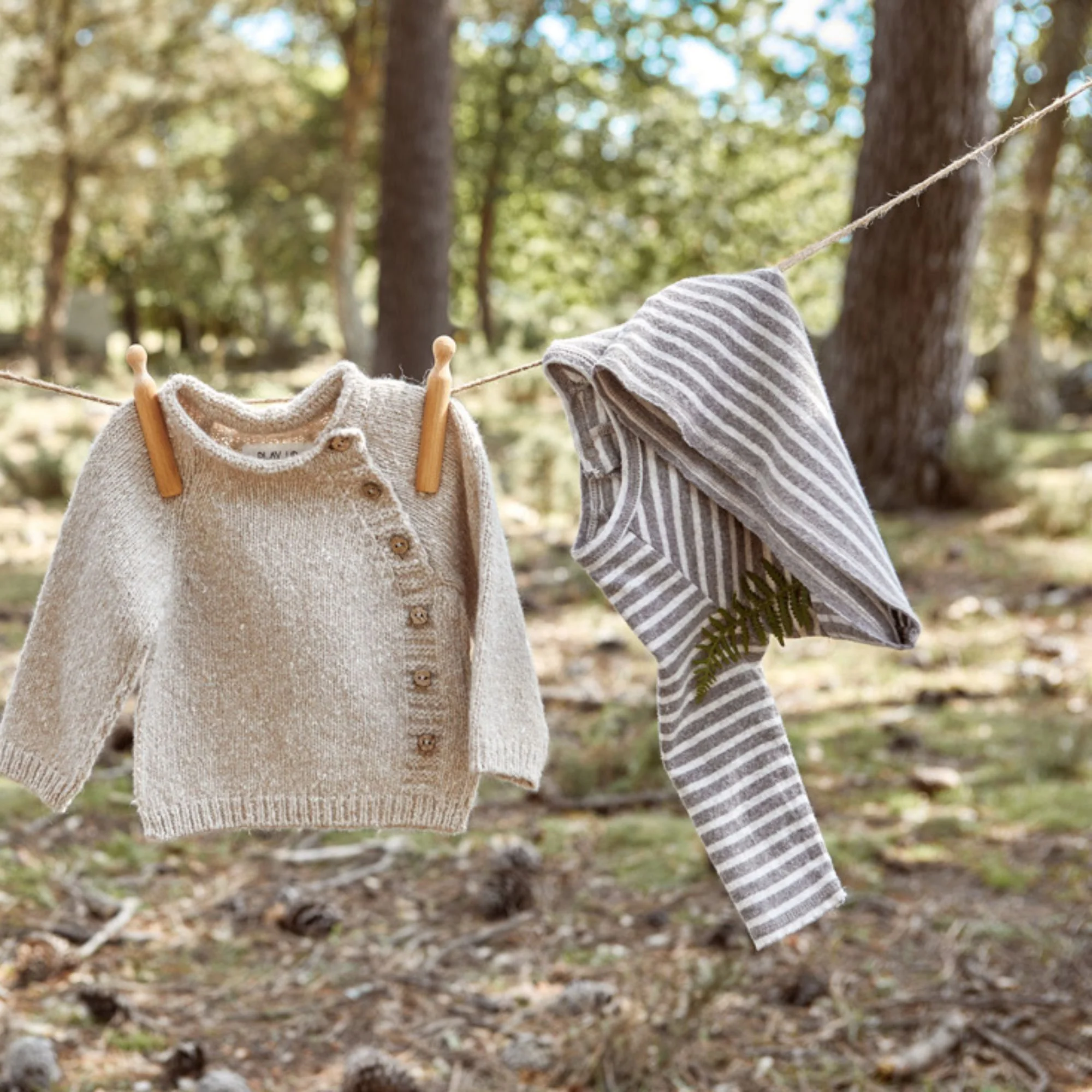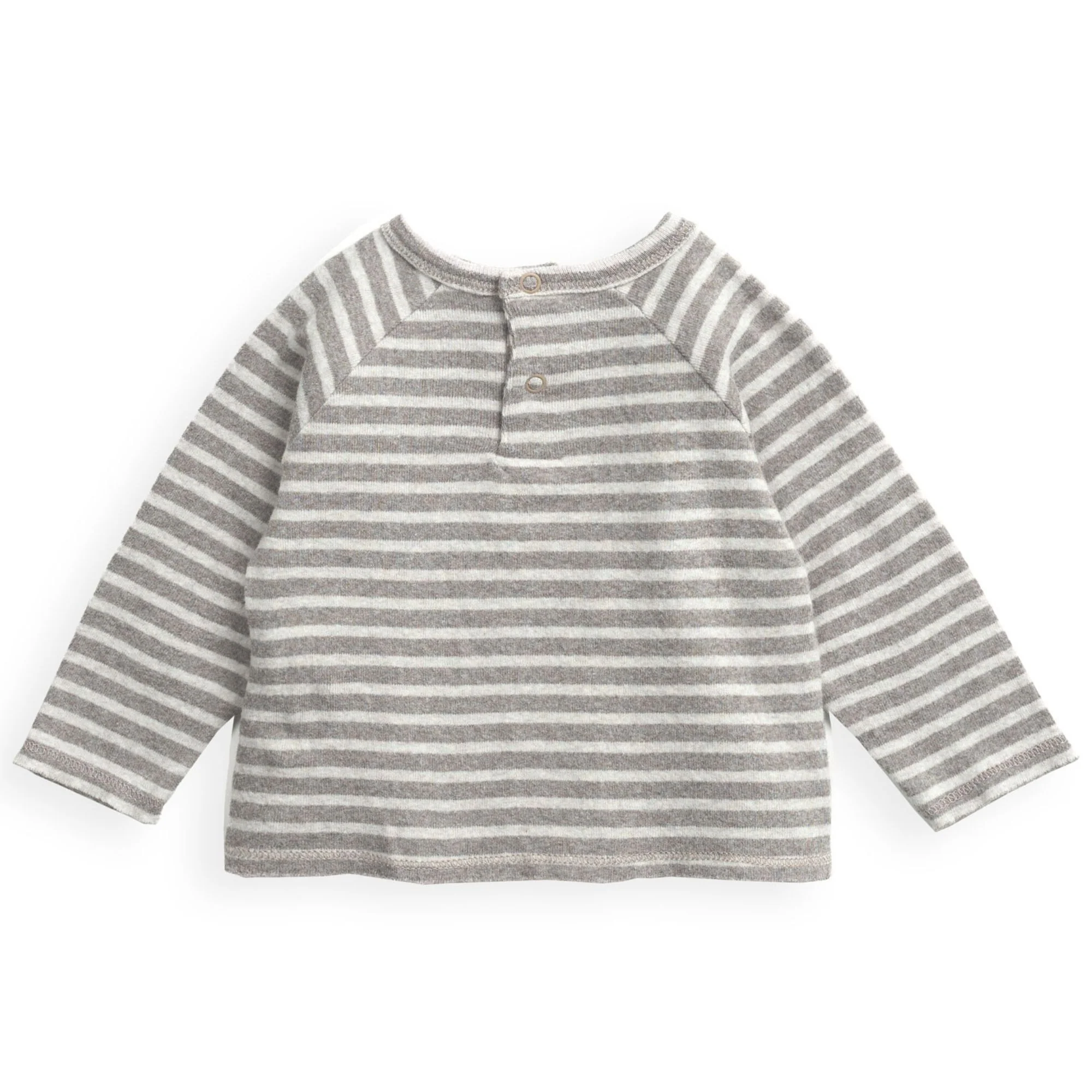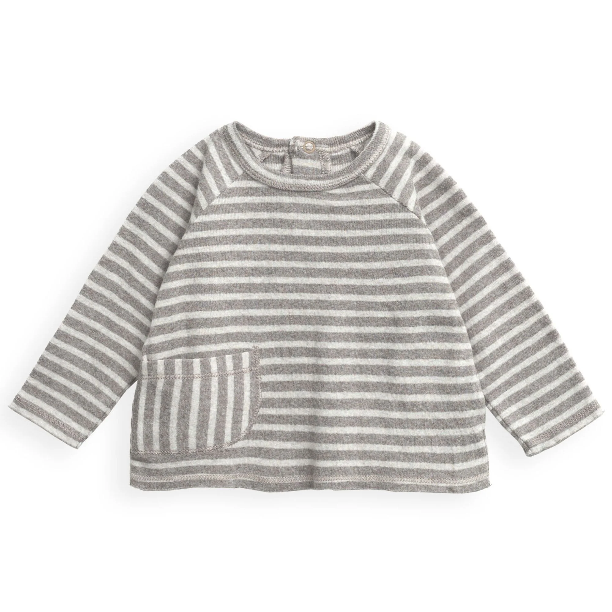 T-shirt di maglina, modello con collo rotondo e manica lunga, una tasca sul davanti, un’apertura sulla schiena con bottoni a pressione in metallo senza nichel e un motivo a righe.