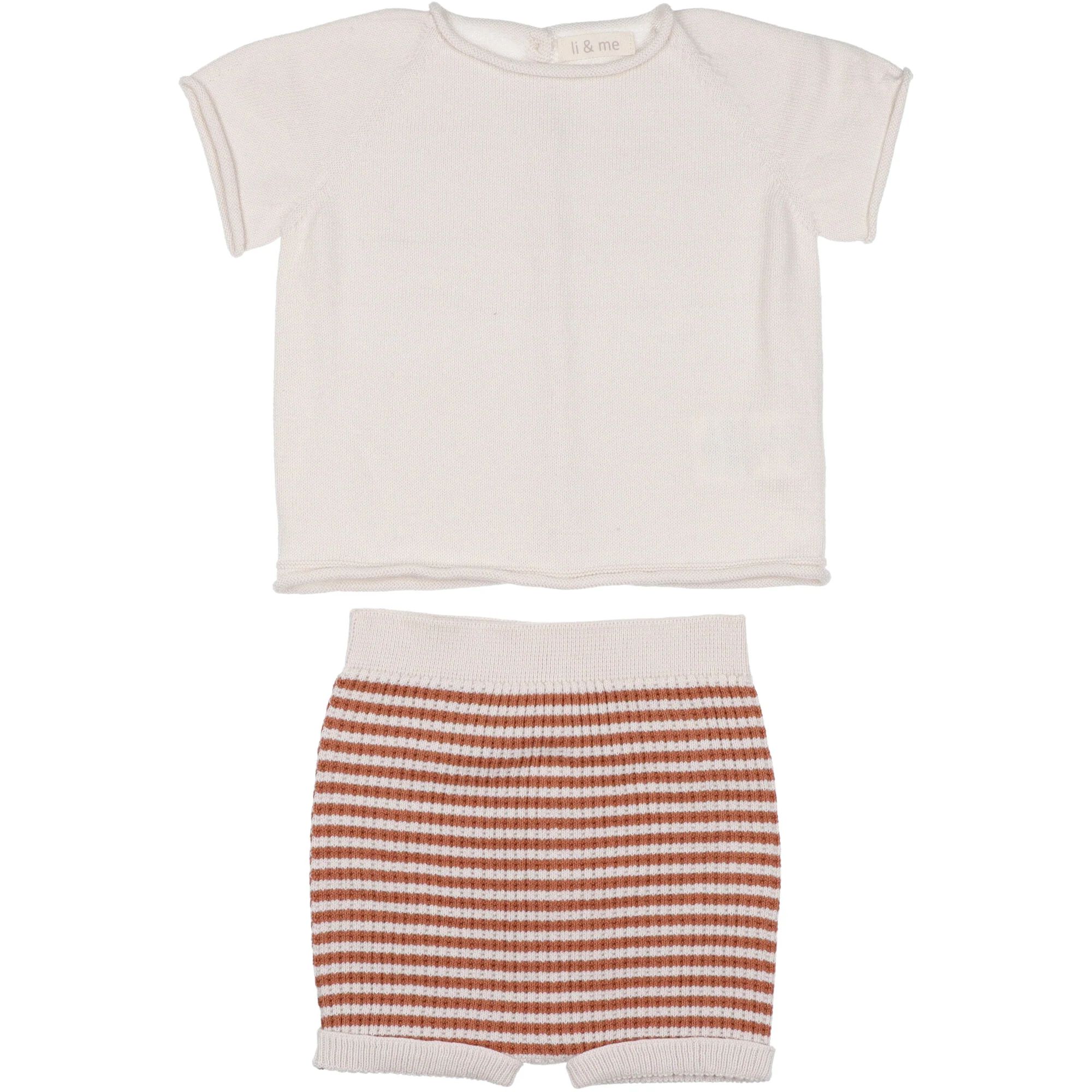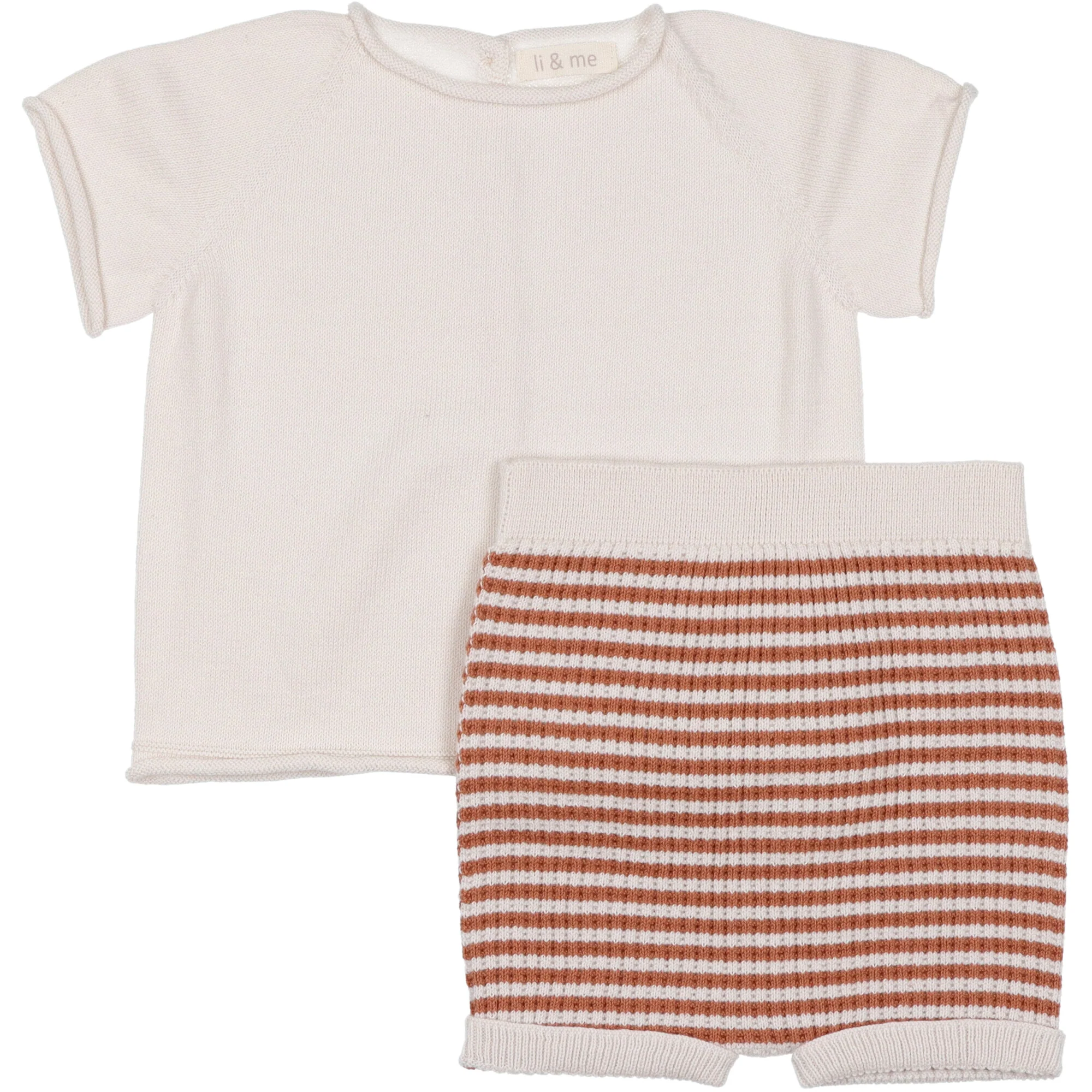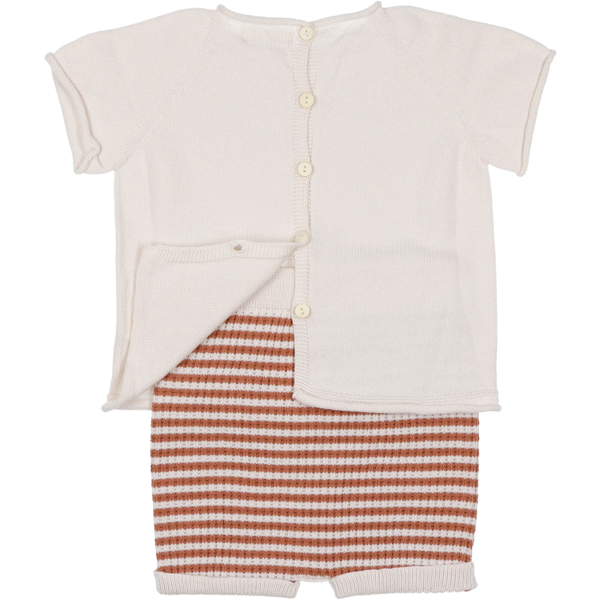 Completo in filo di cotone organico, maglia mezza manica in tinta unita chiusura dietro con bottoni, coulotte a righe con vita e giro gamba leggermente elasticizzata.