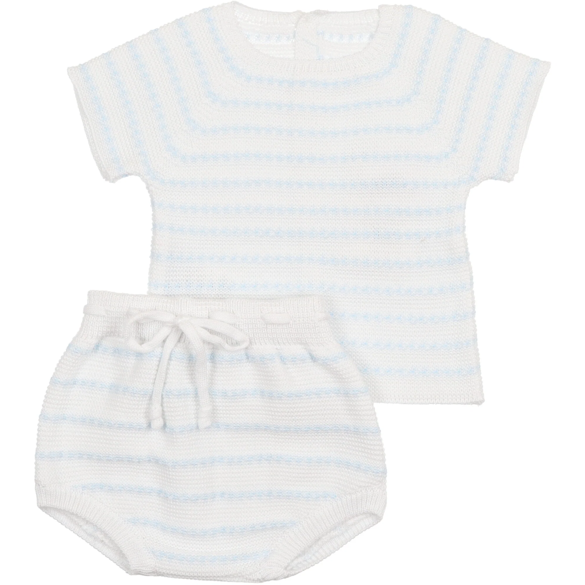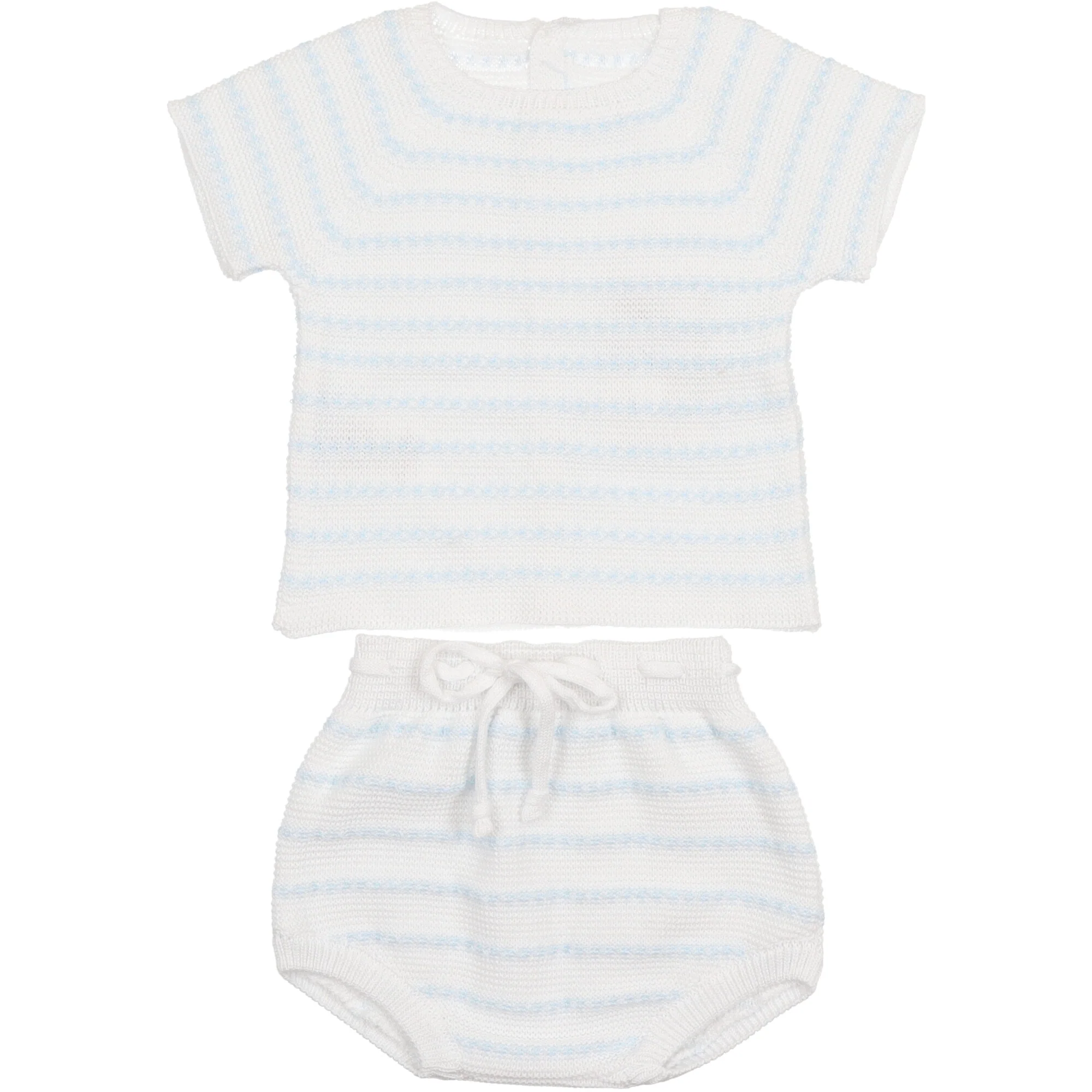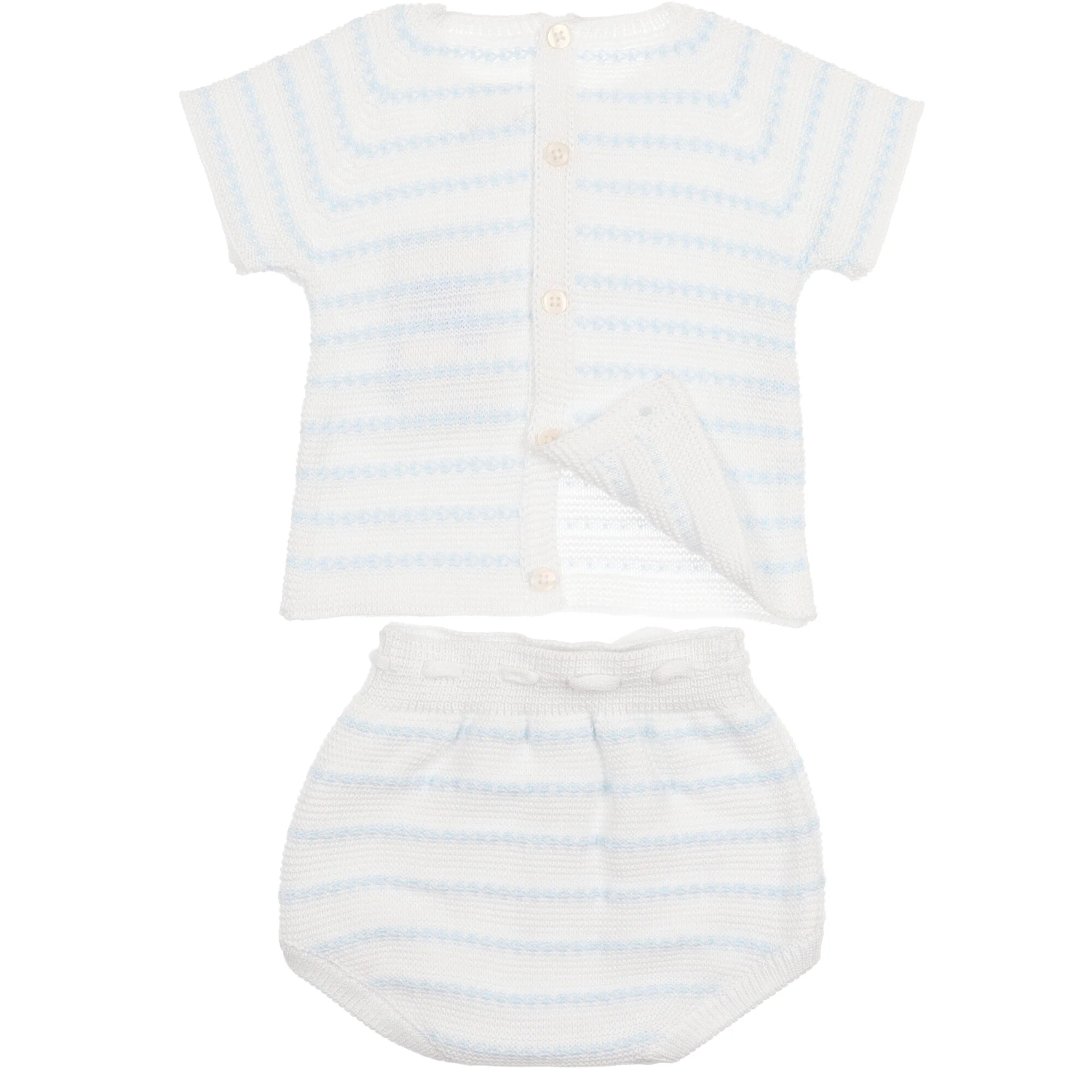 Maglione in filo di cotone bianco con delicata riga colore azzurra, mezza manica con scollo rotondo si chiude dietro con bottoni, coulotte abbinate vita morbida con nastro utile.