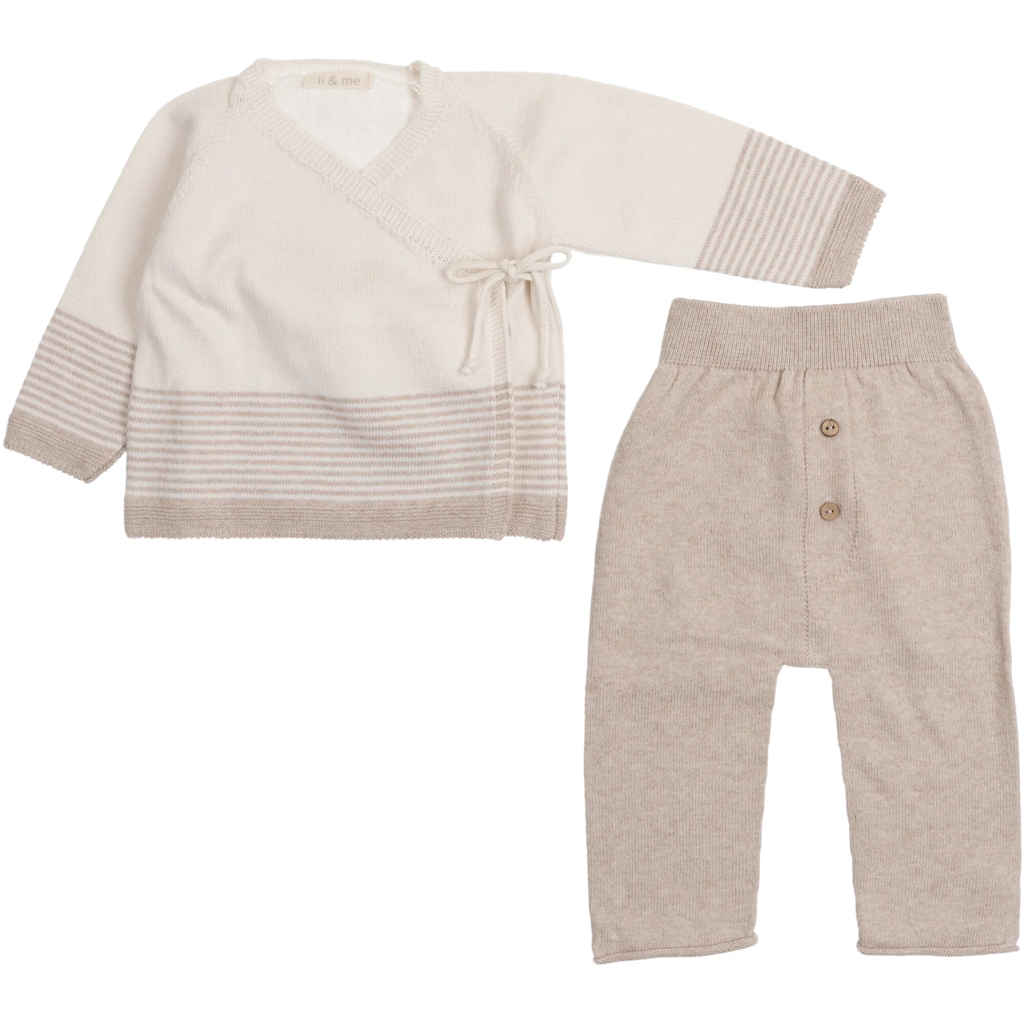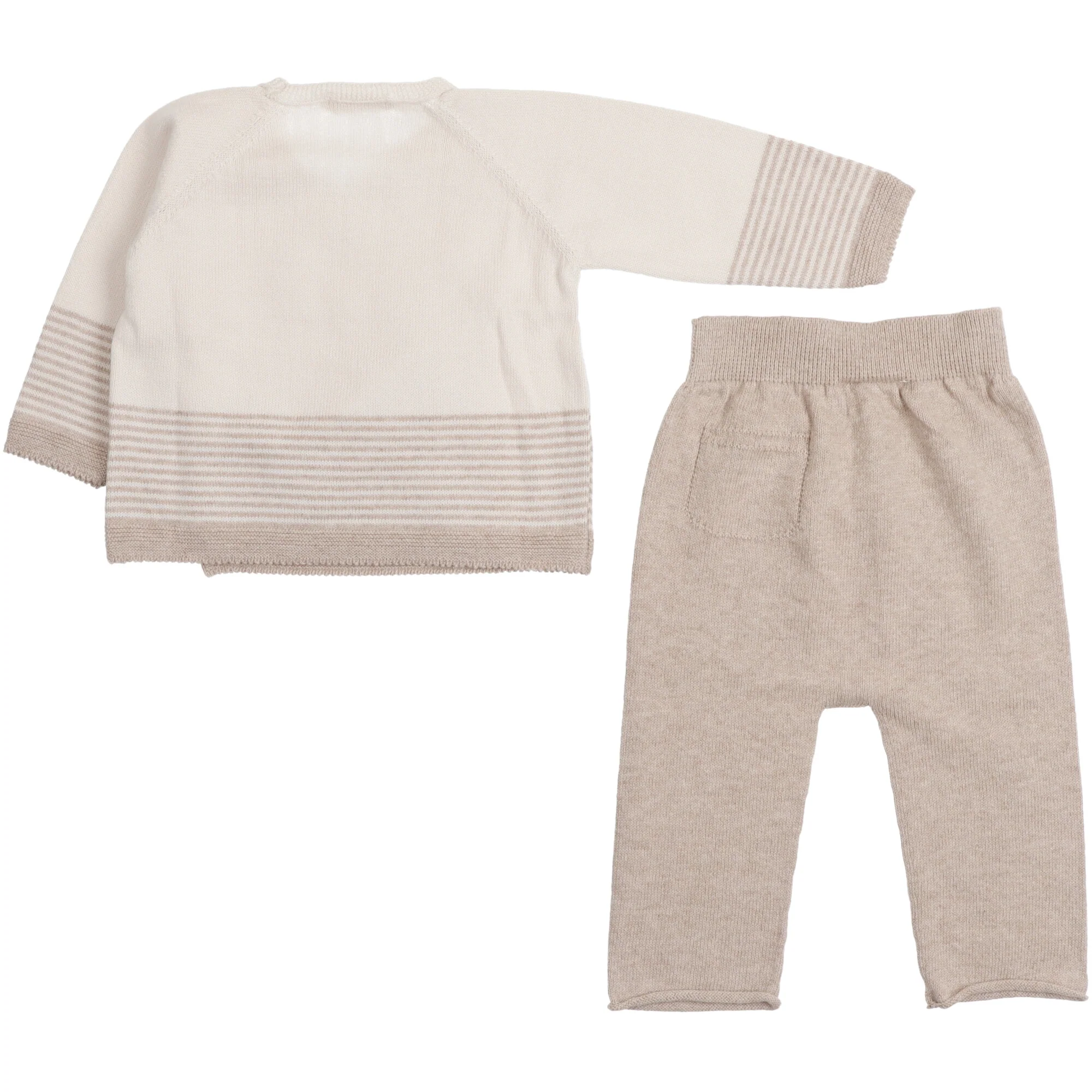 Completo in filo di cotone organico maglione a righe e pantalone tinta unita.