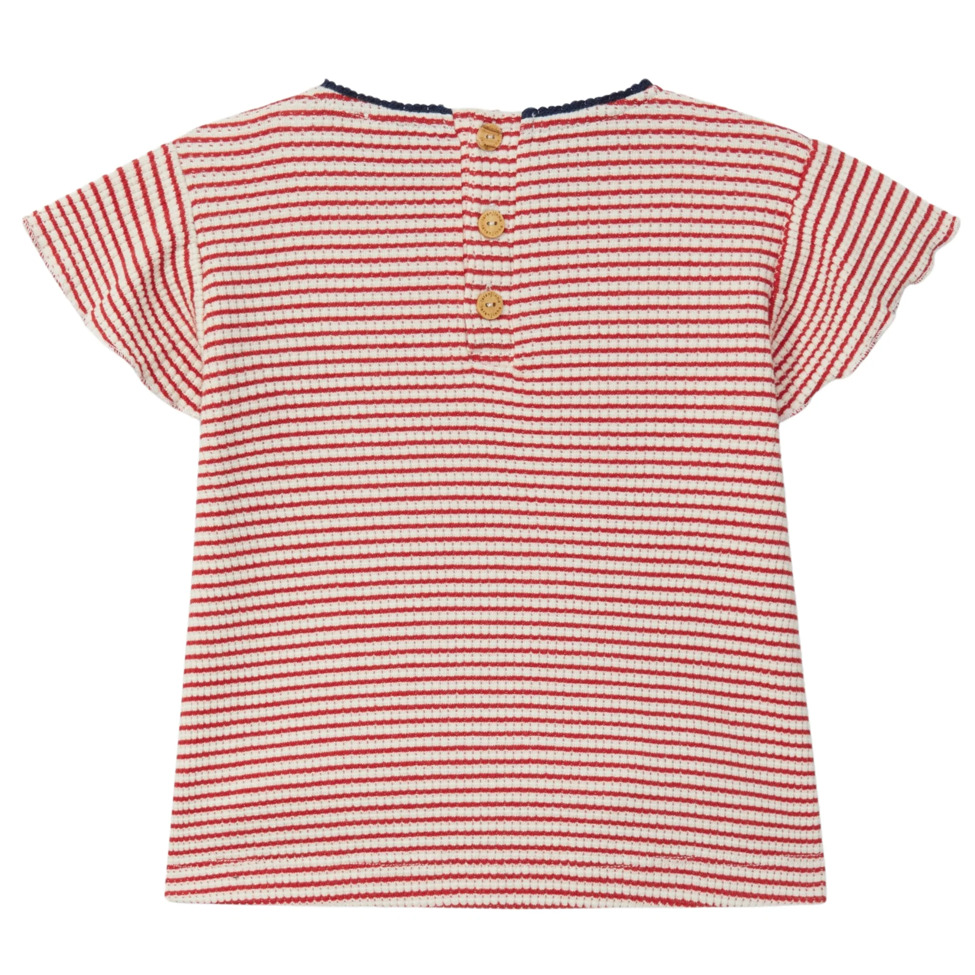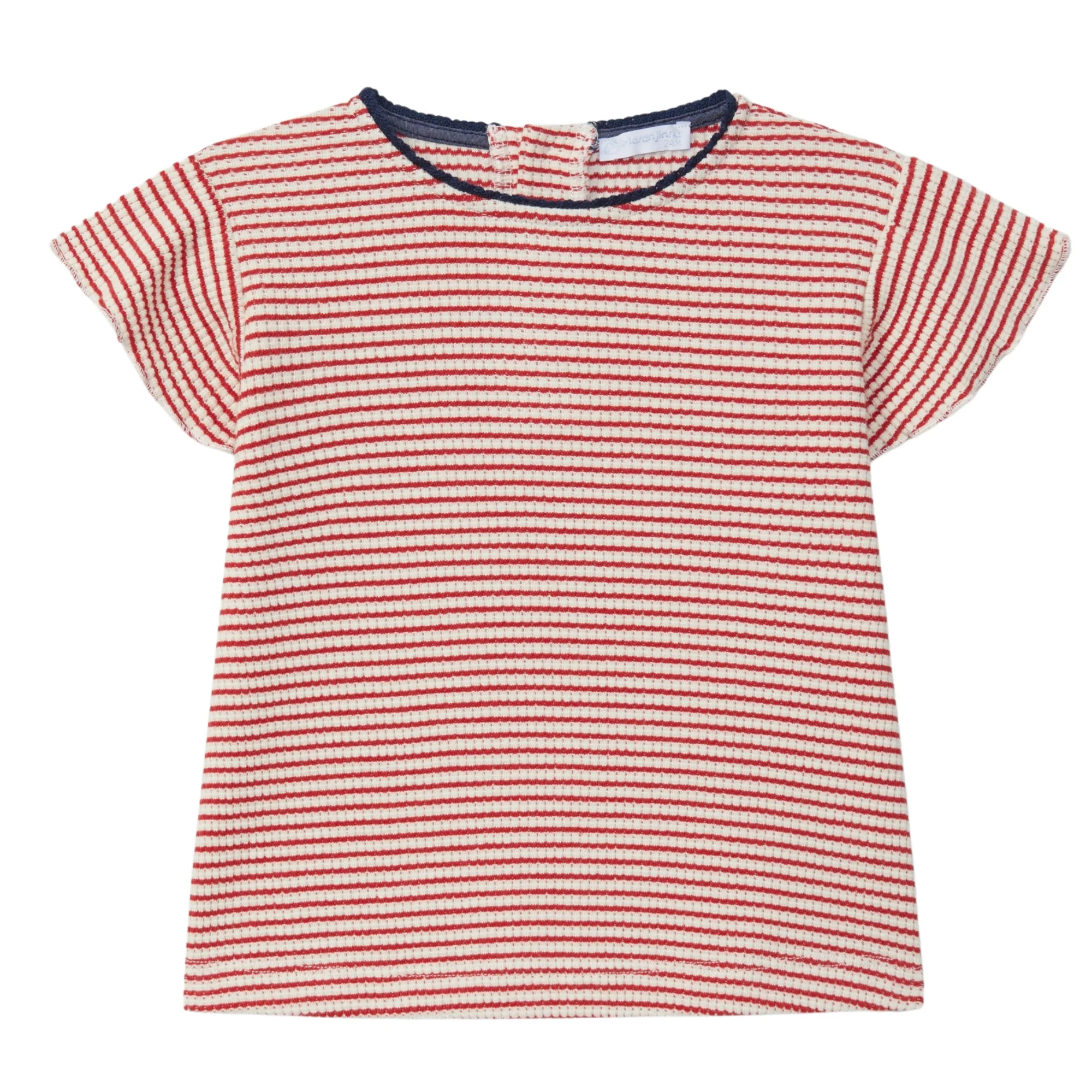 Maglia manica corta con volant, colletto bordato all’uncinetto, apertura dietro con bottoni.