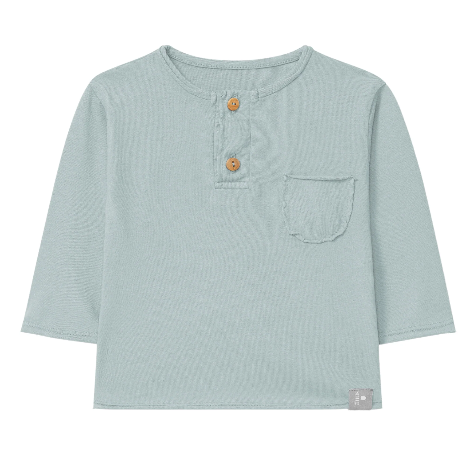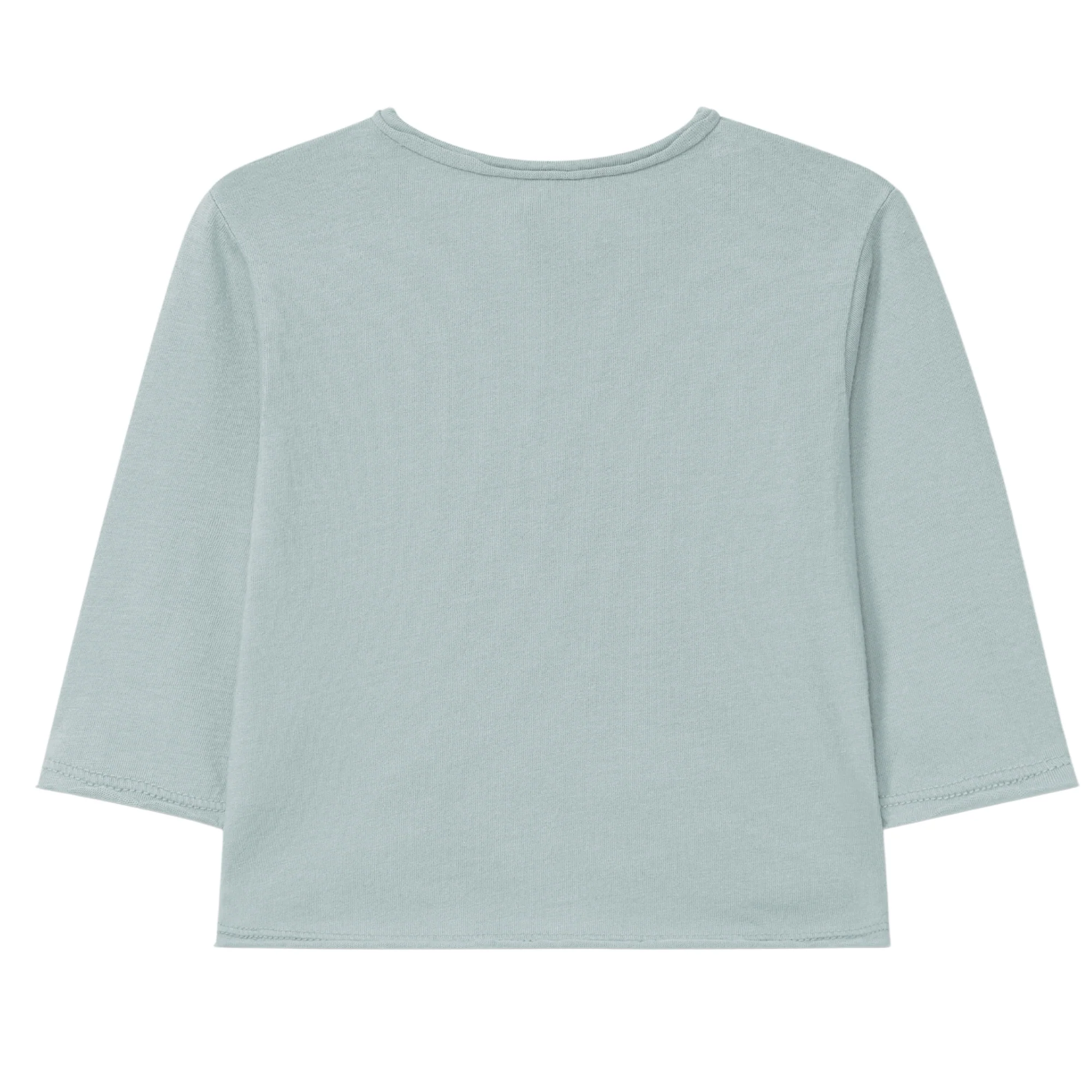 Manica lunga tinta unita in jersey di cotone riciclato e organico tasca sul davanti. Si chiude con bottoni in legno sul davanti.