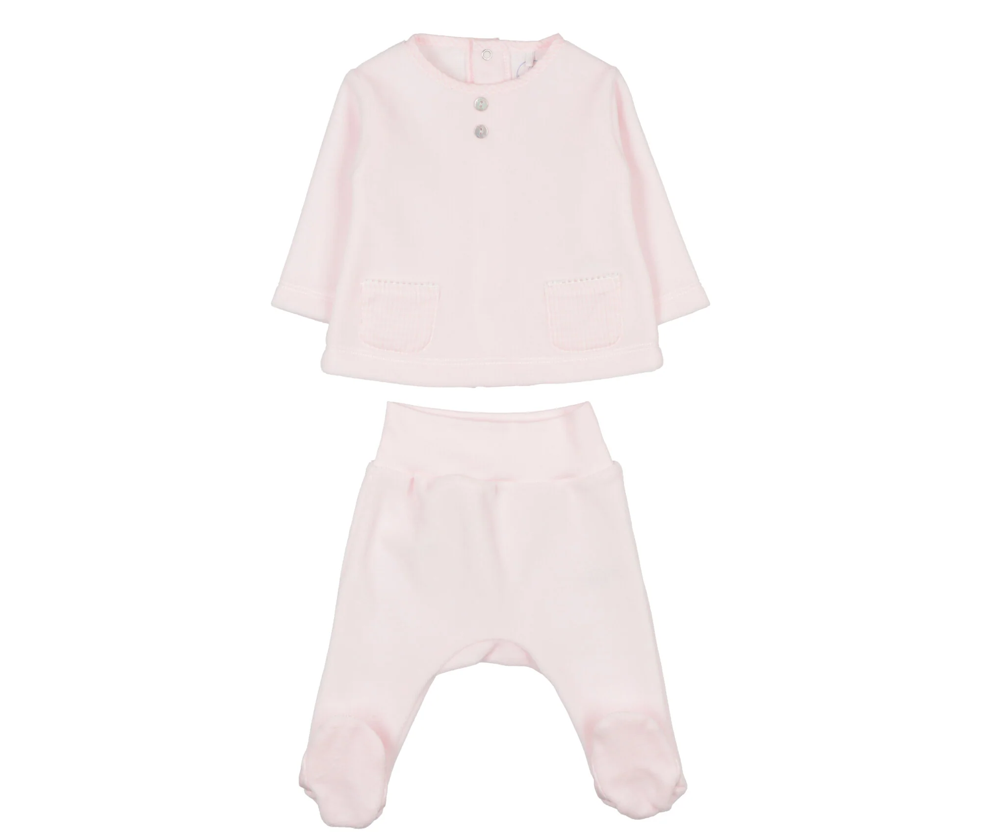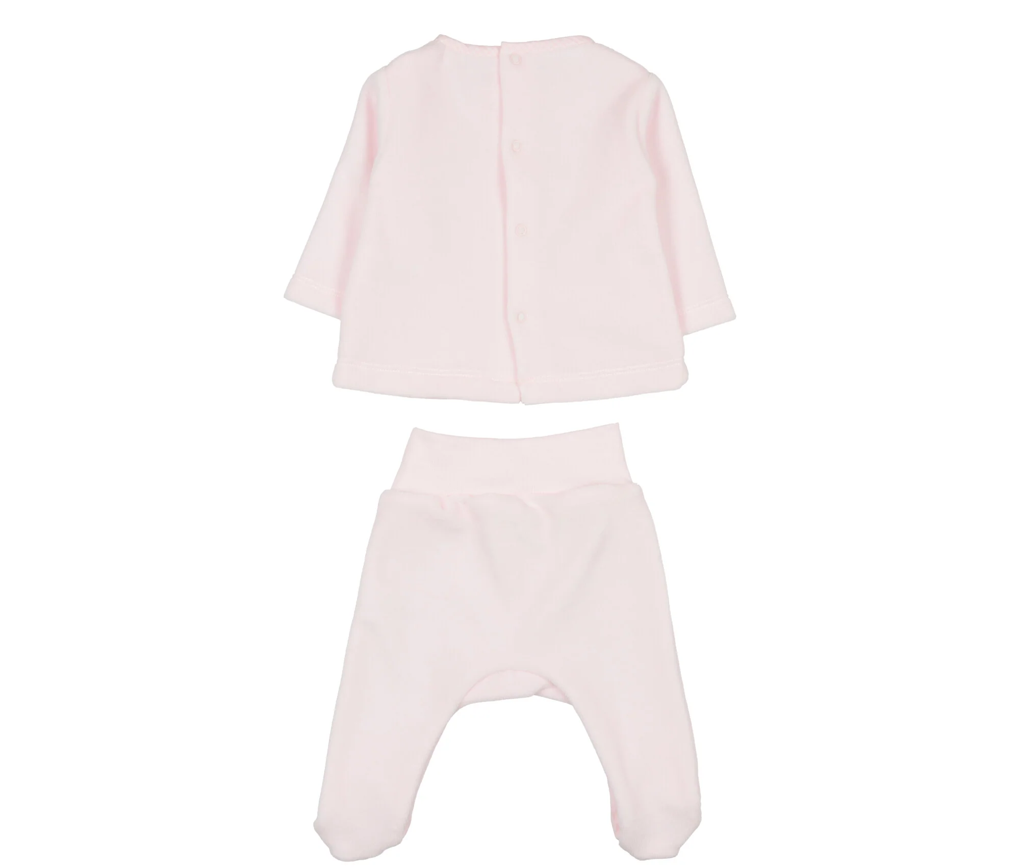 Dettaglio: maglia maniche lunghe, senza colletto bordato con viky, graziosa tonalitร di rosa arrichita con bottoncini in madreperla e due taschini davanti, apertura sul retro con bottoni a pressione. Ghettina con particolare tessuto viky sul piede.