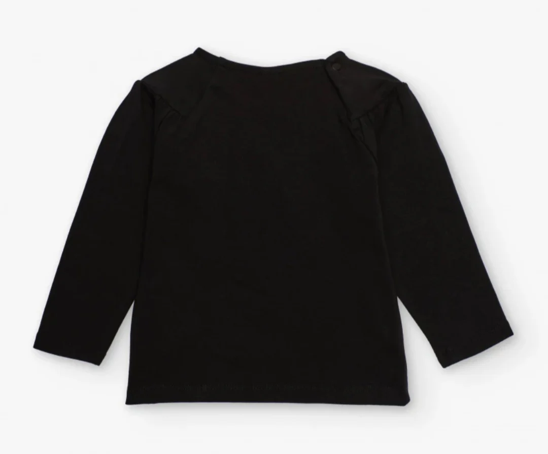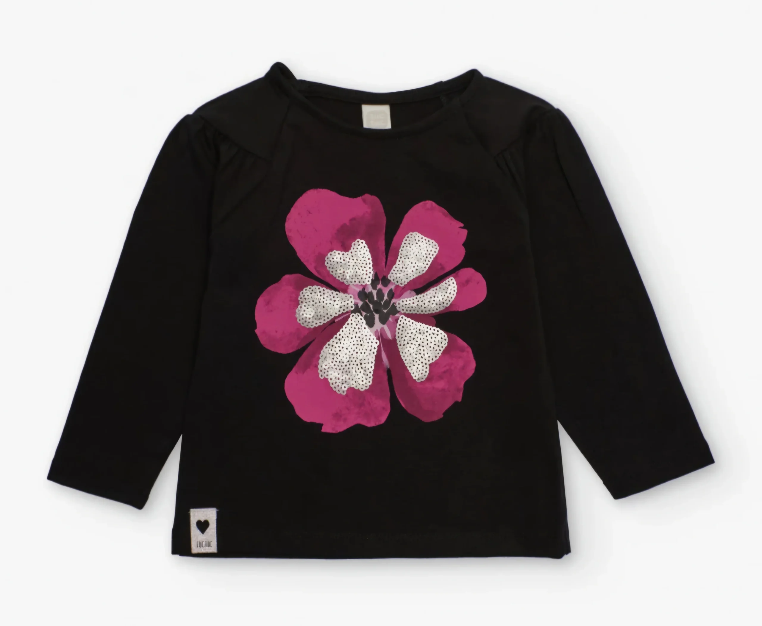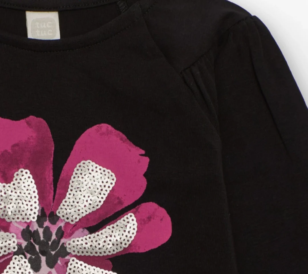 Maglietta nera per bambina con grande fiore fucsia e paillettes