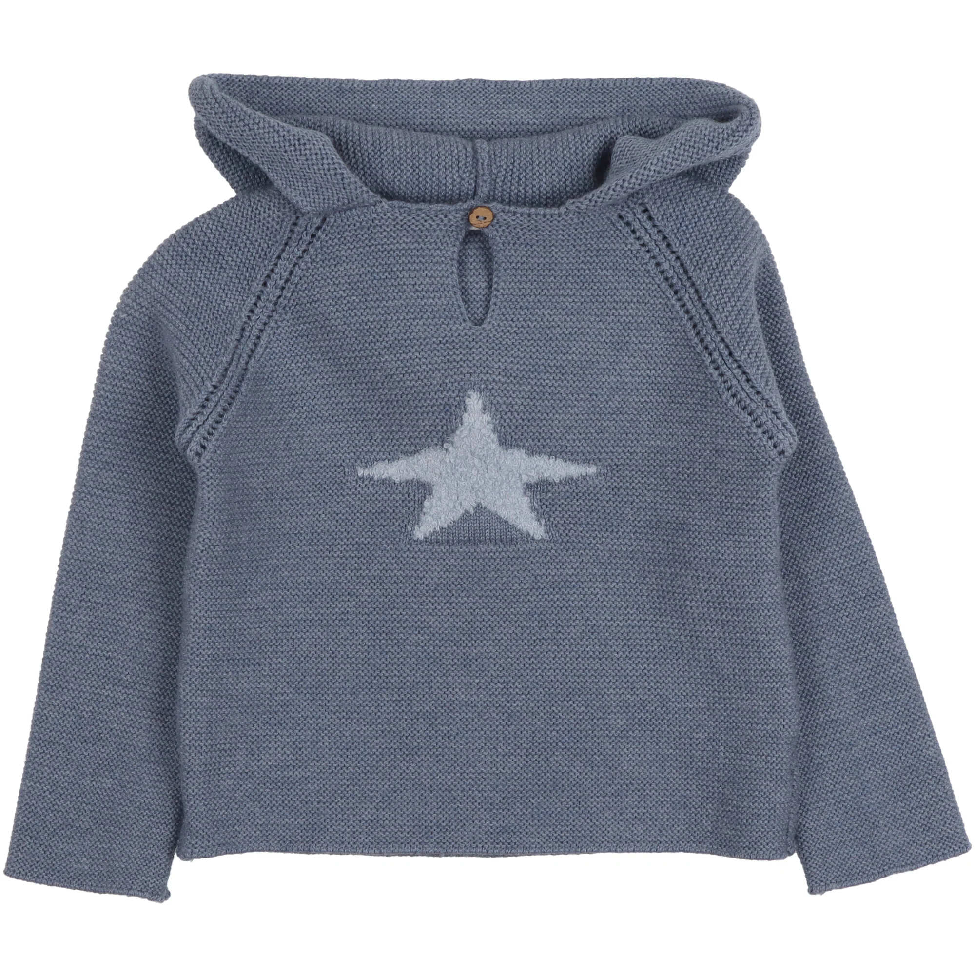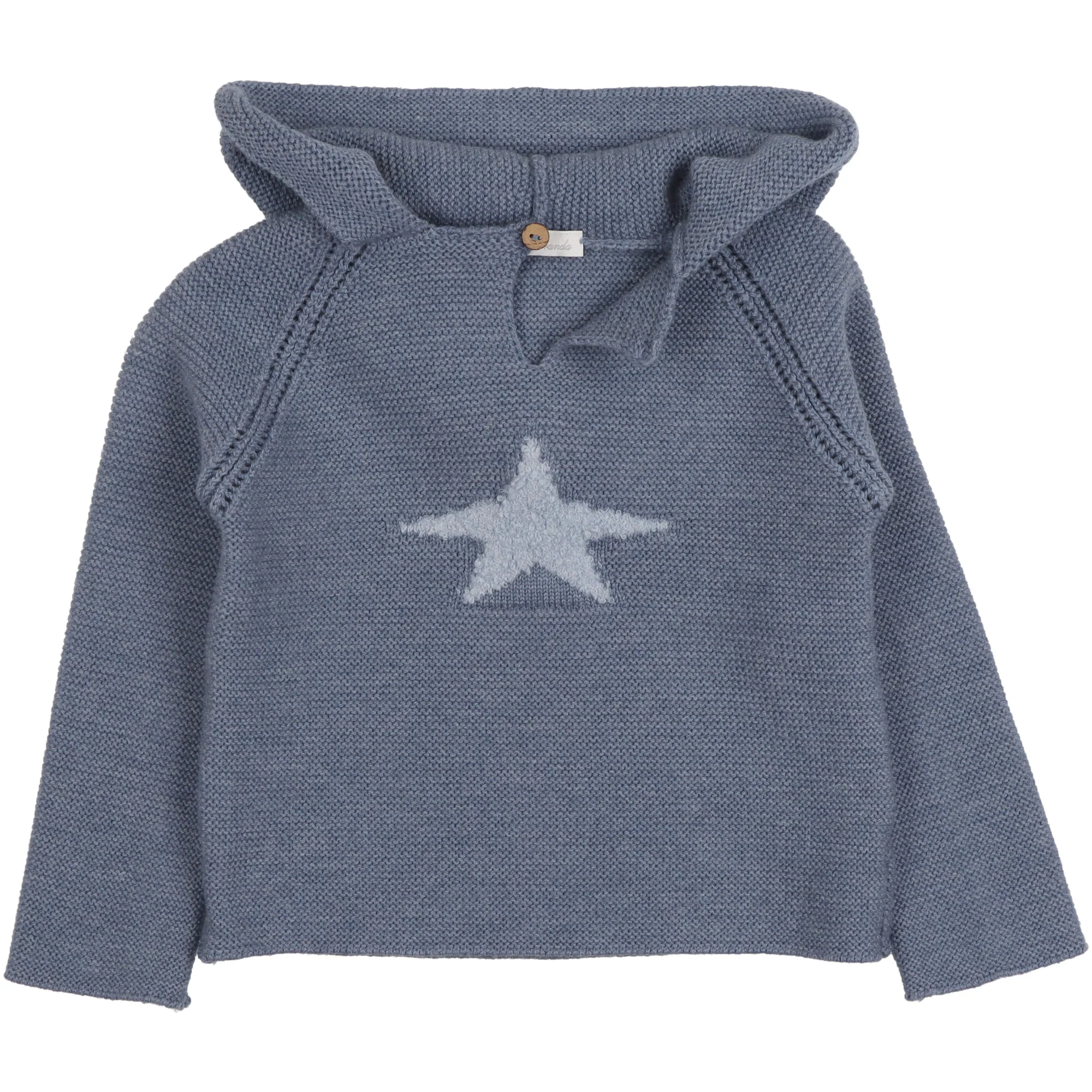 Realizzato in morbida lana blu melangรฉ, maniche lunghe, cappuccio con risvolto e bottone in legno davanti. Stella in azzurro polvere al centro in rilievo. Vestibilitร  slim e lunghezza sotto la vita. Variante unica.