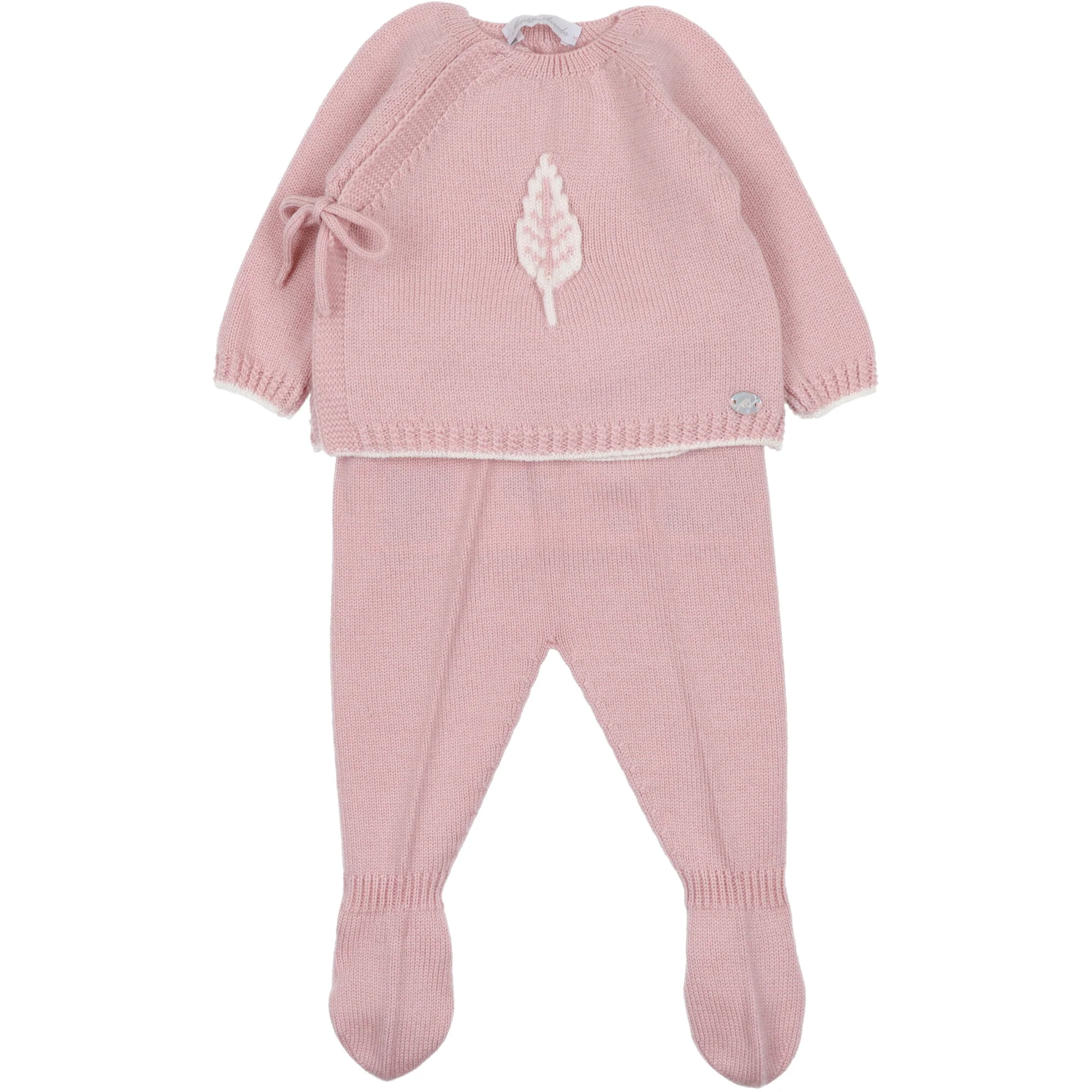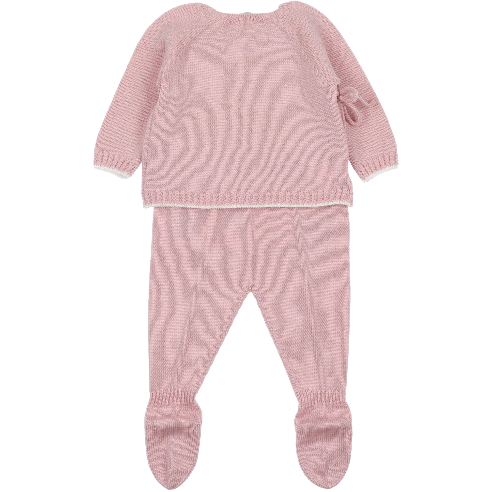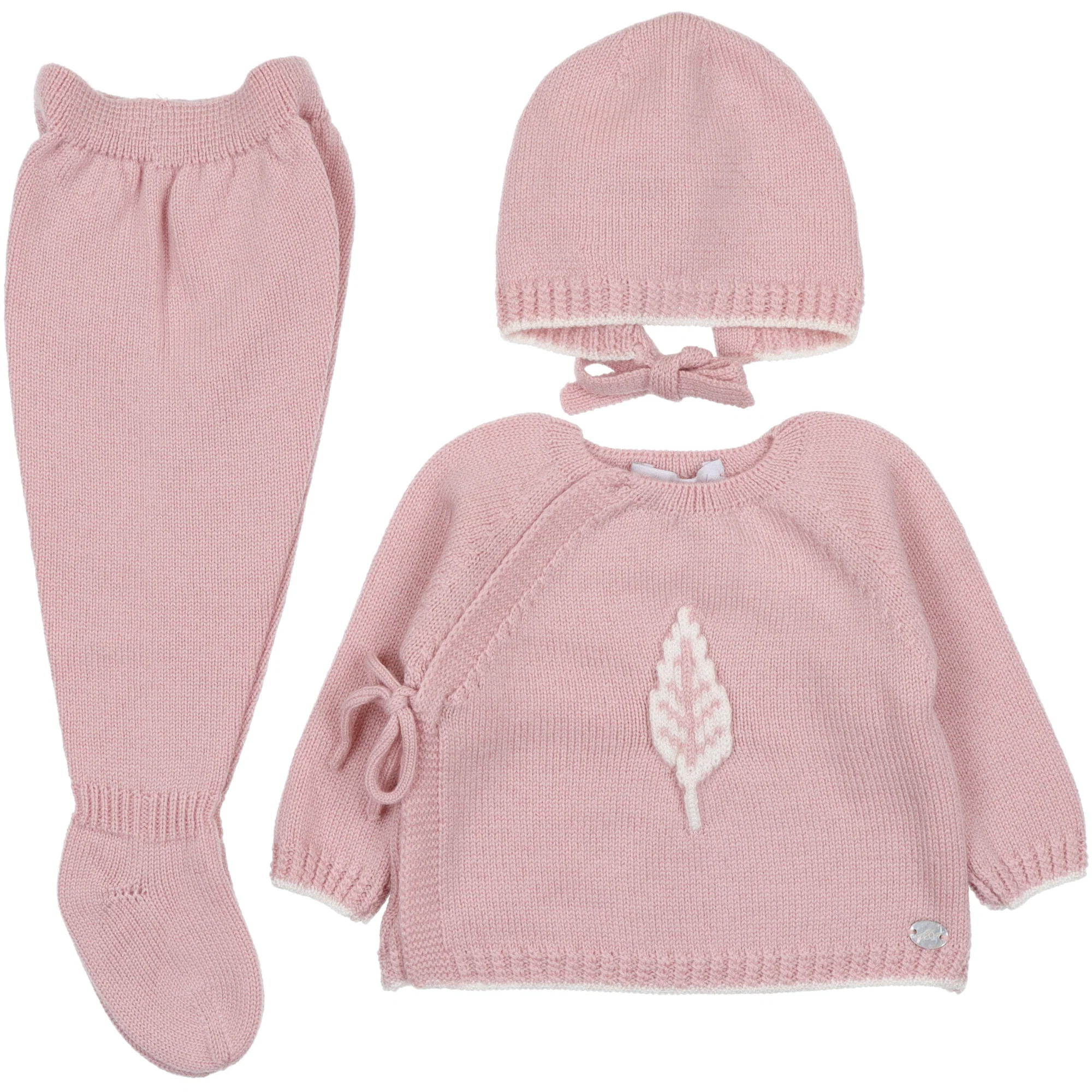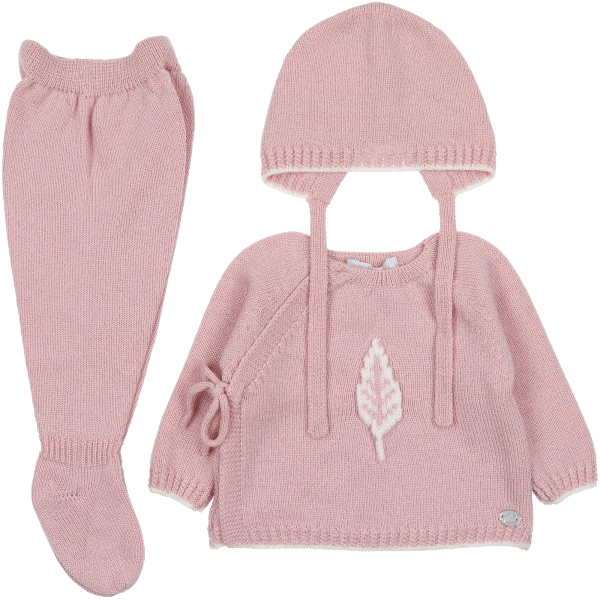 Completo per neonati, cardigan chiuso a chimono con laccetto applicazione in rilievo davanti completo di pantalone con piede, vita elastica e cappello a cuffietta abbinato. Composizione: 100% lana.Cura: si consiglia un lavaggio a mano con detersivo delicato, no candeggio, no asciugatrice, si puรฒ stirare a bassa temperatura.