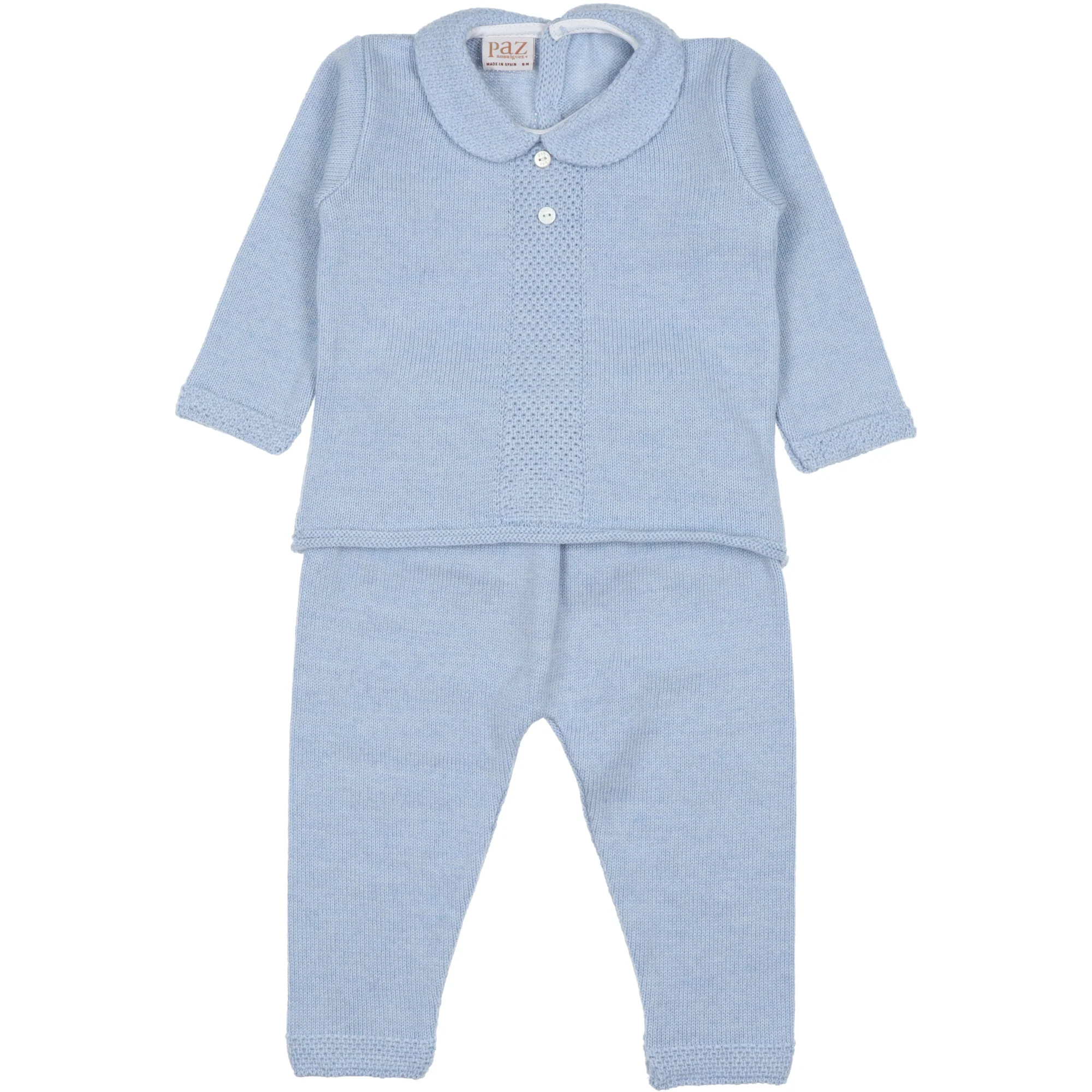 DESCRIZIONE Completo per neonato realizzato in morbida lana colore azzurro. Maglione con collo in lana foderato in cotone, chiusura dietro con bottoni ed asole. Pantaloni abbinate delicatamente elasticizzata.Composizione: 100% lana.Cura: lavaggio a mano, non candeggiare, non utilizzare l’asciugatrice, si puรฒ lavare a secco e si puรฒ stirare, asciugare in orizzontale.