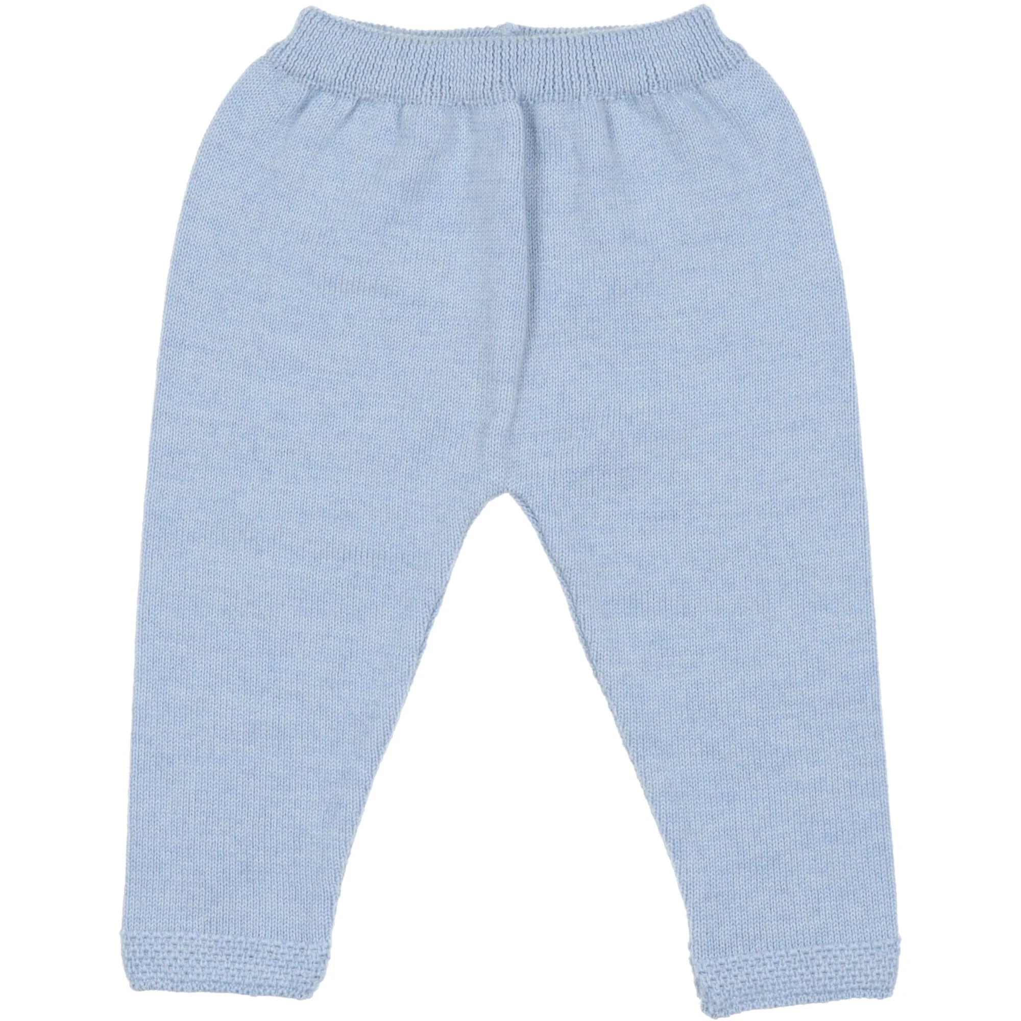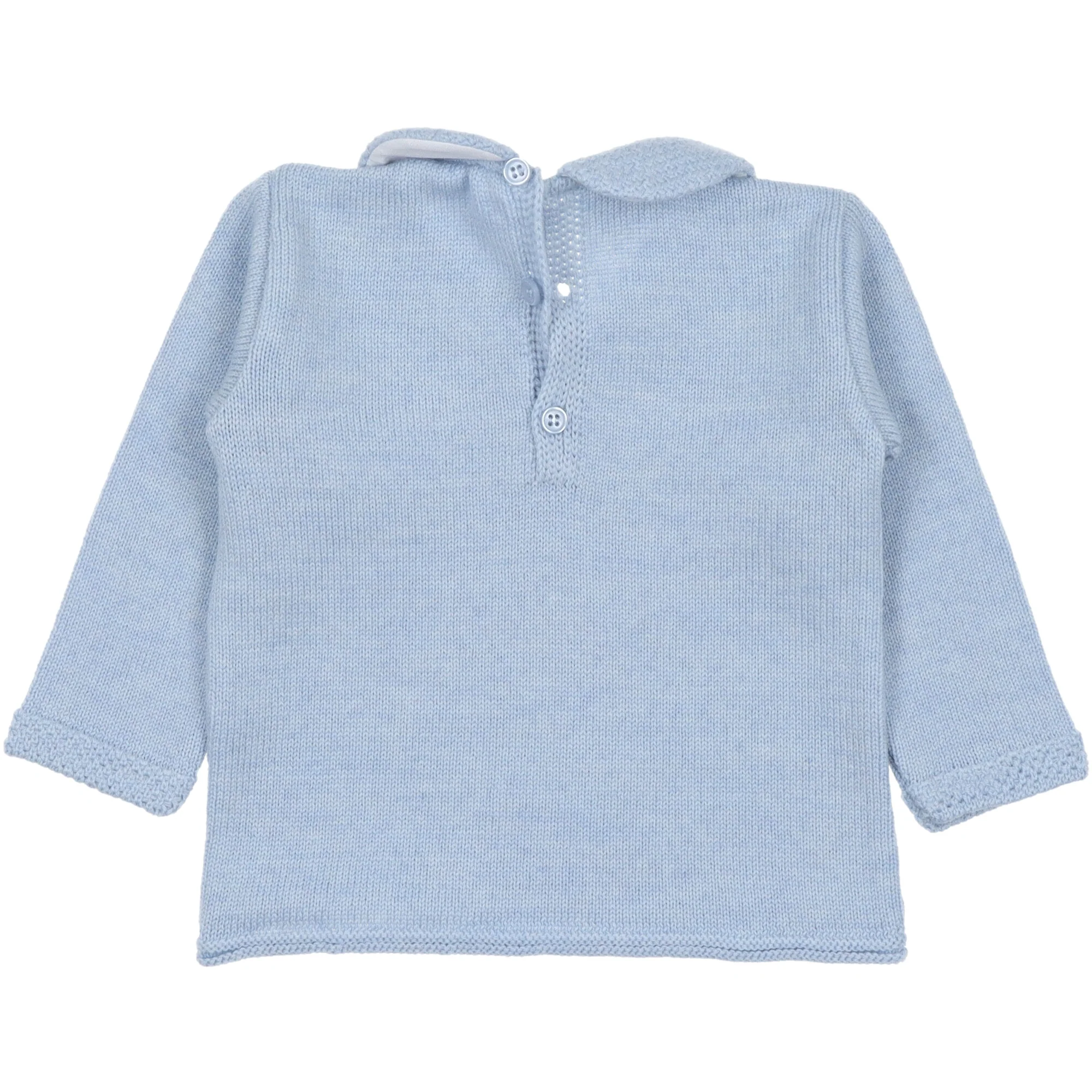 Completo per neonato realizzato in morbida lana colore azzurro. Maglione con collo in lana foderato in cotone, chiusura dietro con bottoni ed asole. Pantaloni abbinate delicatamente elasticizzata.