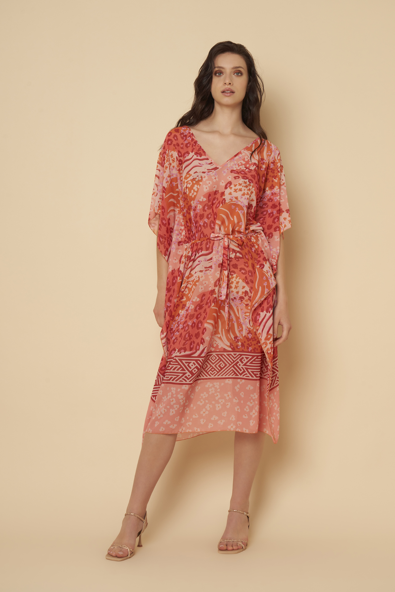 Abito caftano in voile di poliestere 100% con stampa animalier e balza geometrica sul fondo. Variante unica.