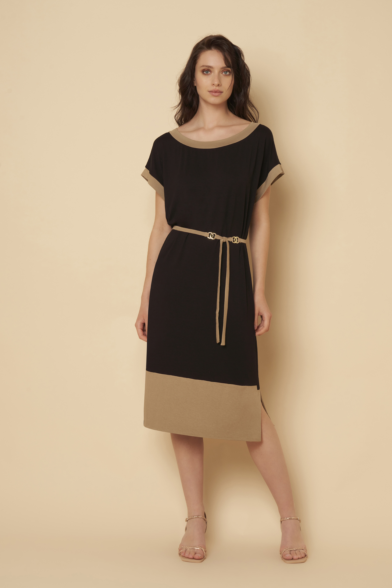 Abito in jersey di viscosa tinta unita bicolore con inserti su scollo, fondo della manica e orlo. Cintura in vita con passanti in metallo dorato nikel free e spacchi laterali.Variante unica.
