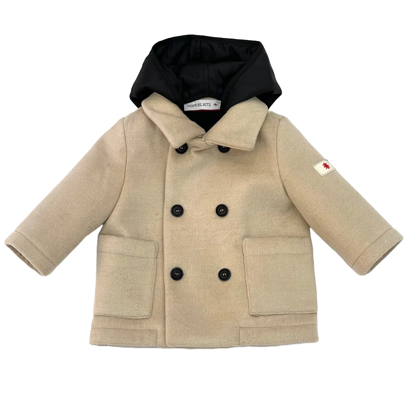 Manuel Ritz cappotto imbottito neonato in panno beige Cappuccio rimovibile Chiusura a doppiopatto con bottoni Tasche a toppa frontali Patch logo su manicaComposizione: 90% poliestere 8% viscosa 2% elastan Made in ItalyCollezione Autunno Inverno Vestibilitร :Taglia Etร