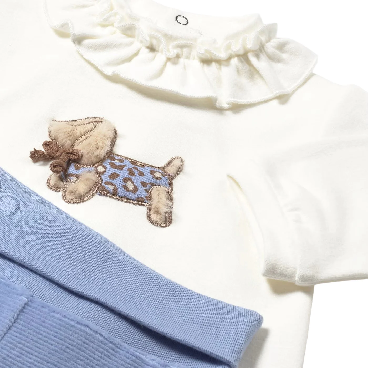 Mayoral completo due pezzi neonata in cotone caldo panna celesteCoprifasce collo arricciato Ricami frontali Ghettina con piedini Vita elasticaComposizione: 95% cotone 5% elastanMade in CinaCollezione Autunno Inverno Vestibilitร :Taglia Etร