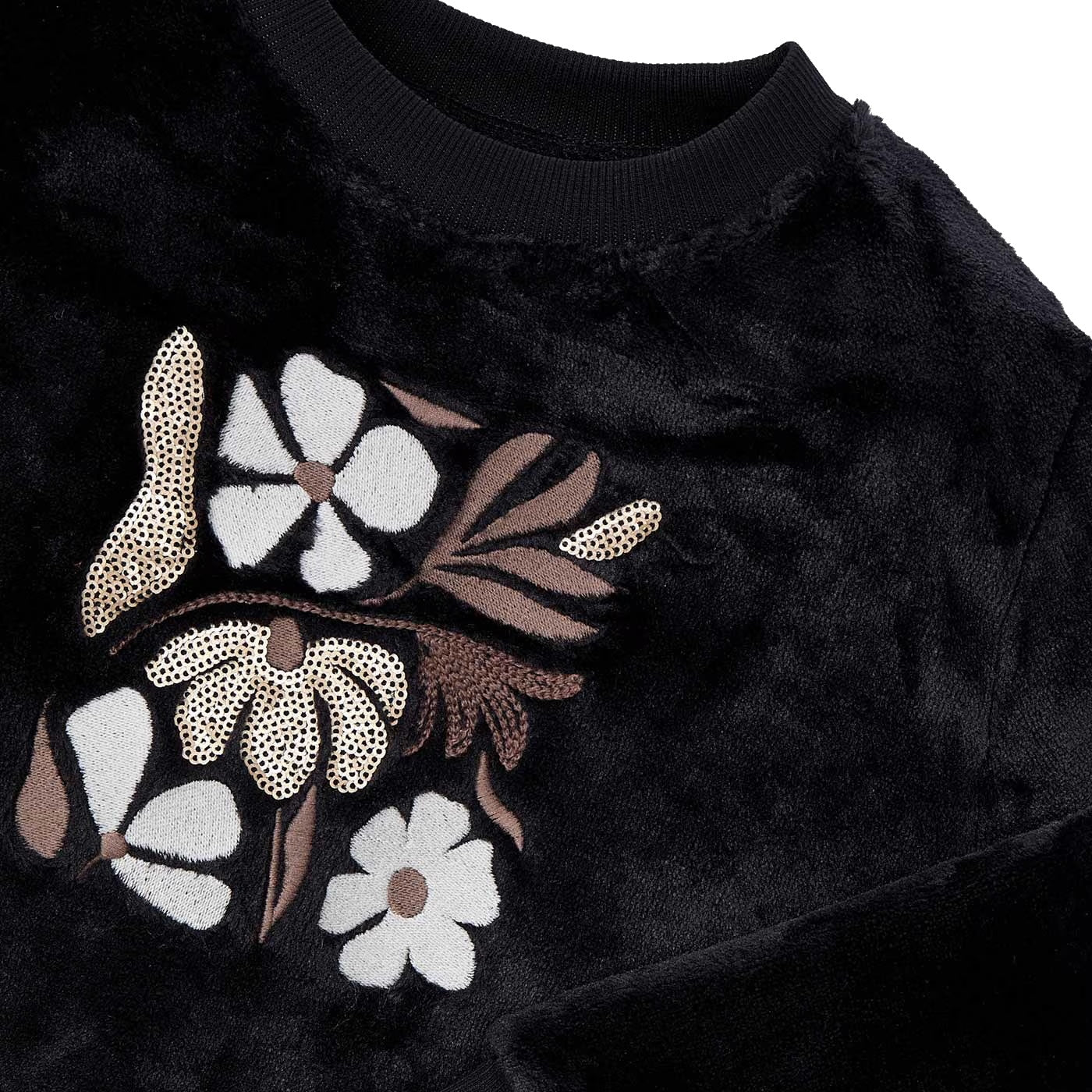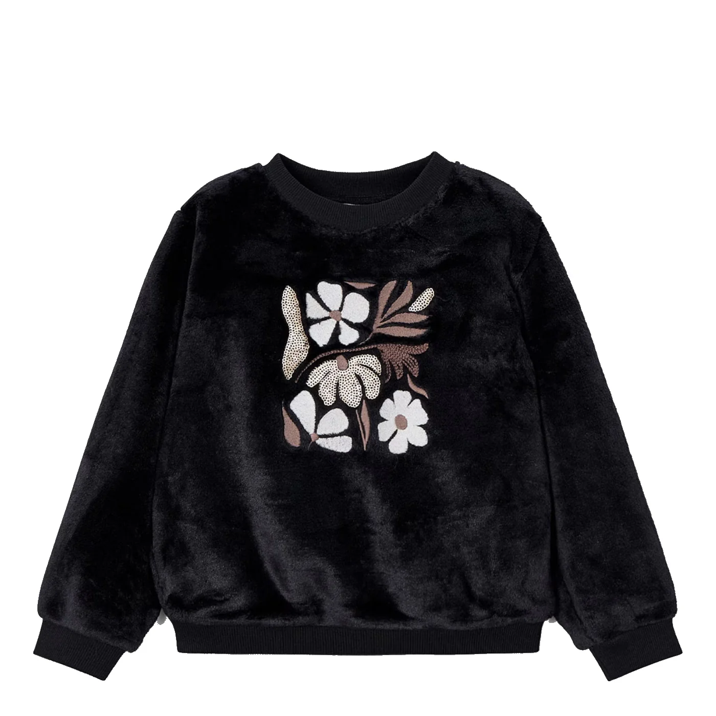 Mayoral fepa girocollo bambina in ciniglia nera Ricami con paillettes frontali Collo polsini e fondo a costeComposizione: 80% poliestere 19% cotone 1% elastanMade in Cina Collezione Autunno Inverno Vestibilitร :Taglia Etร