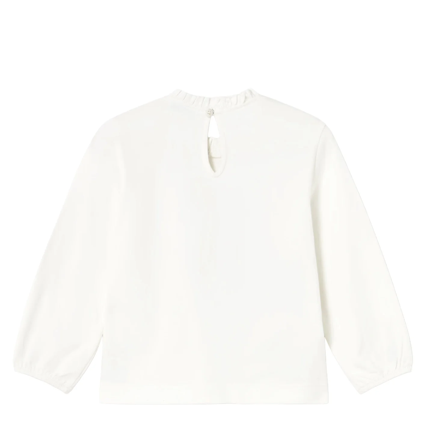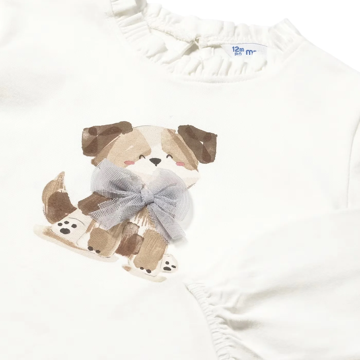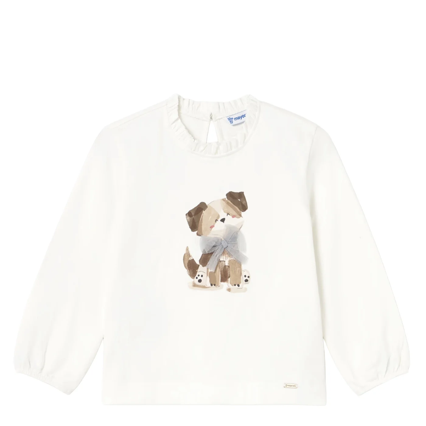 Mayoral t-shirt girocollo neonata in cotone panna Collo arricciatoManiche lunghe Stampa frontale con fiocco in tulleChiusura sul retro con bottoni a pressioneConmposizione: 95% cotone 5% elastanMade in IndiaCollezione Autunno Inverno Vestibilitร :Taglia Etร