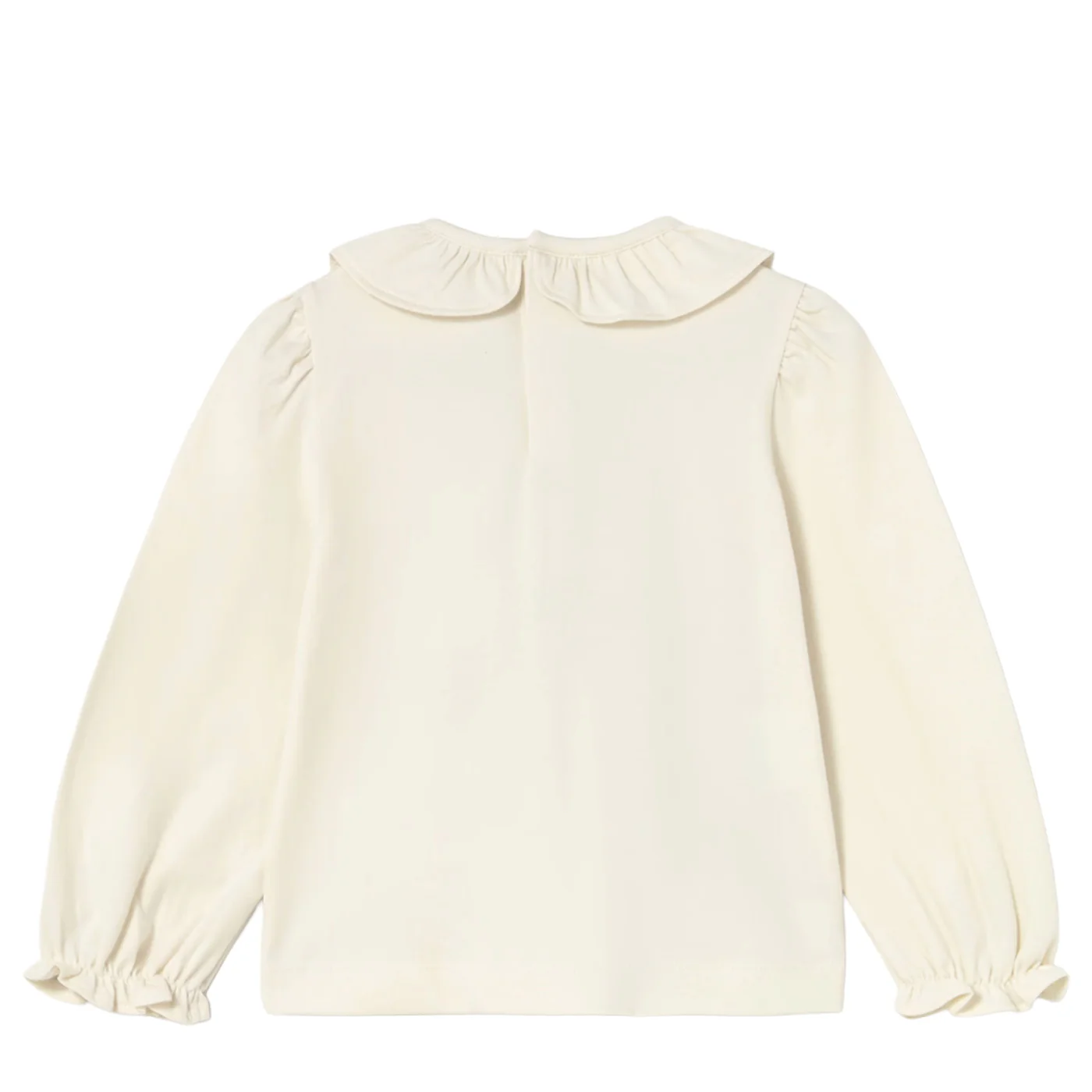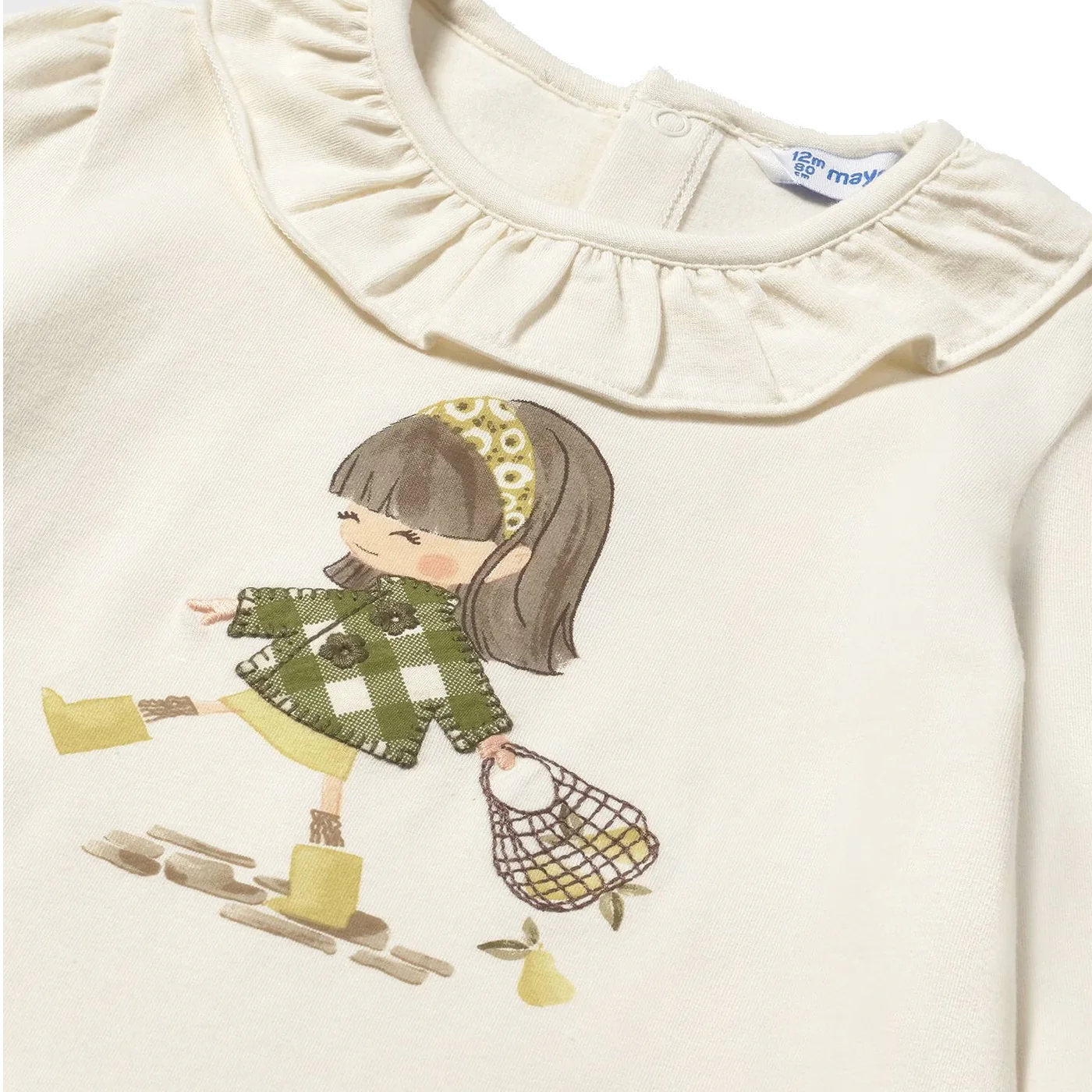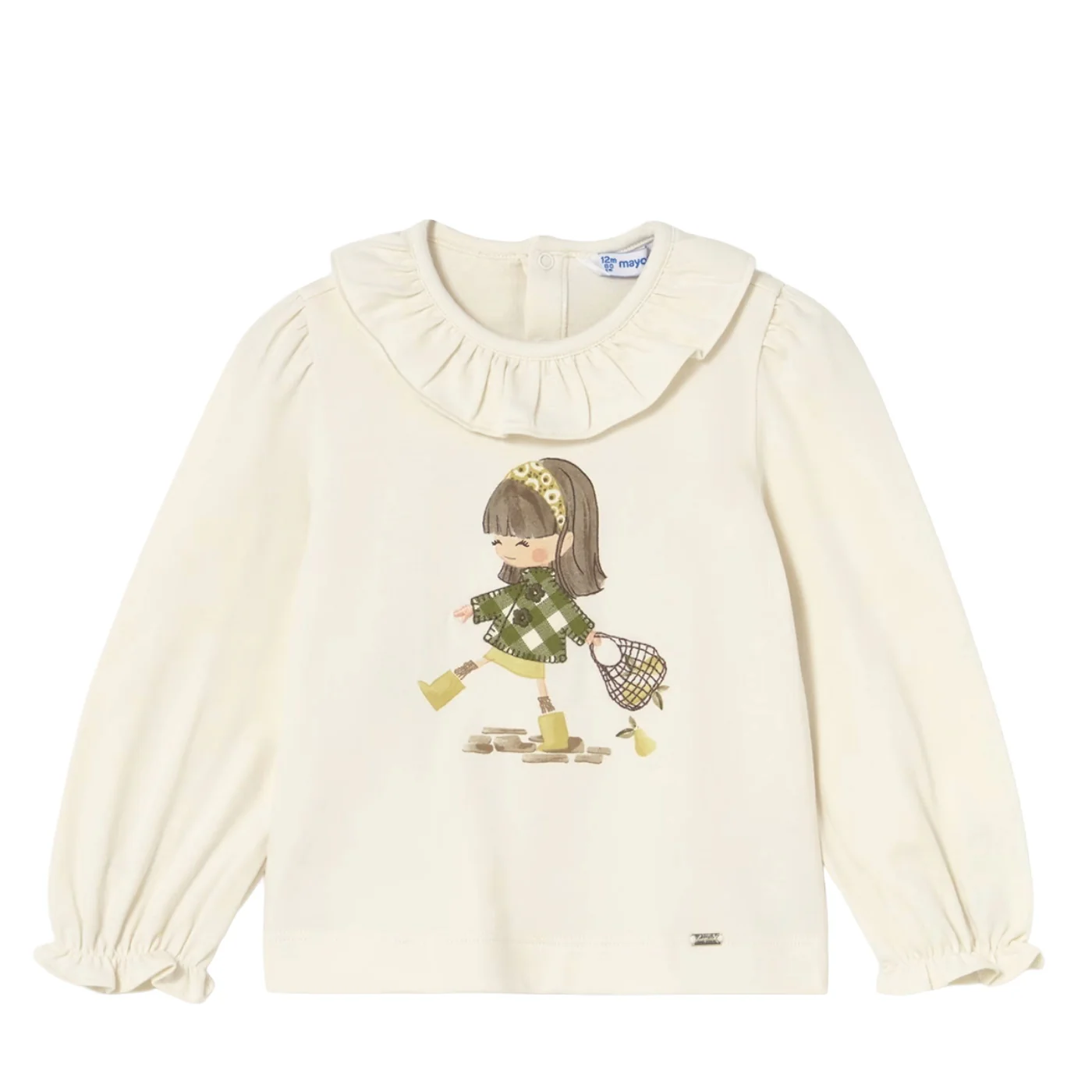 Mayoral t-shirt girocollo neonata in cotone ecrรนCollo arricciatoManiche lunghe con balzeStampa frontale con glitter Chiusura sul retro con bottoni Conmposizione: 95% cotone 5% elastanMade in IndiaCollezione Autunno Inverno Vestibilitร :Taglia Etร