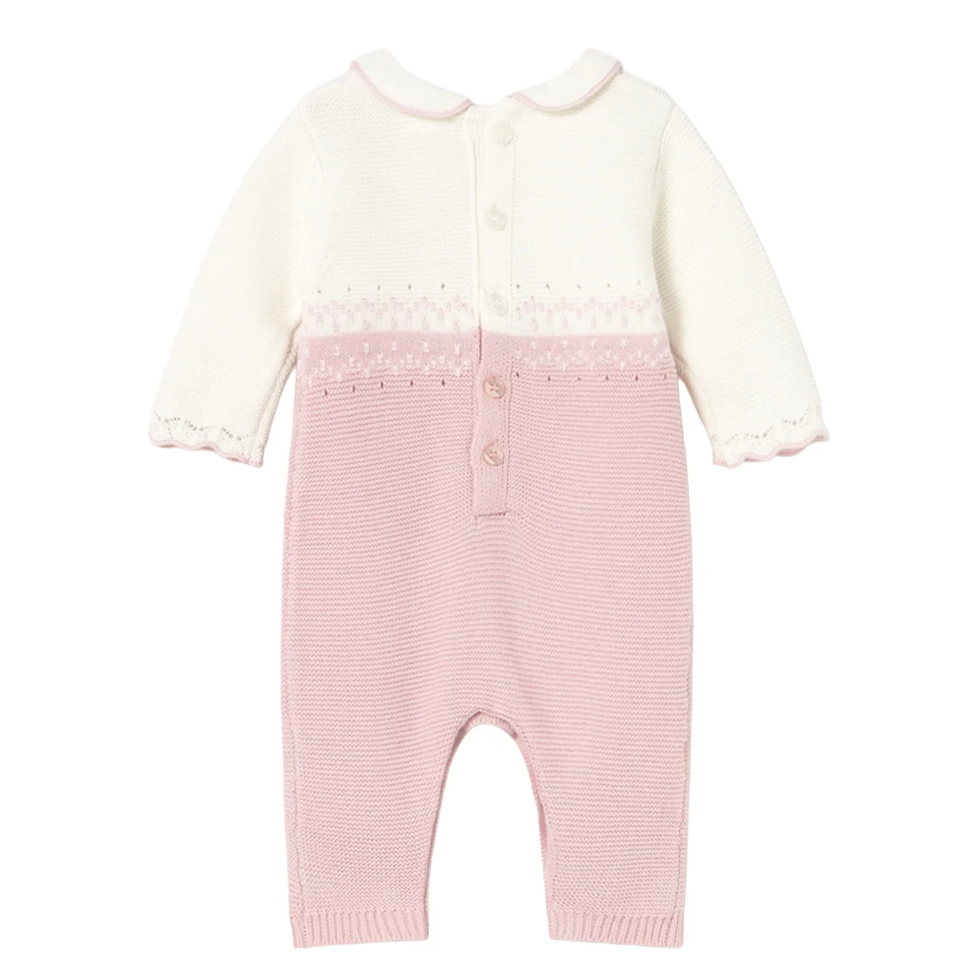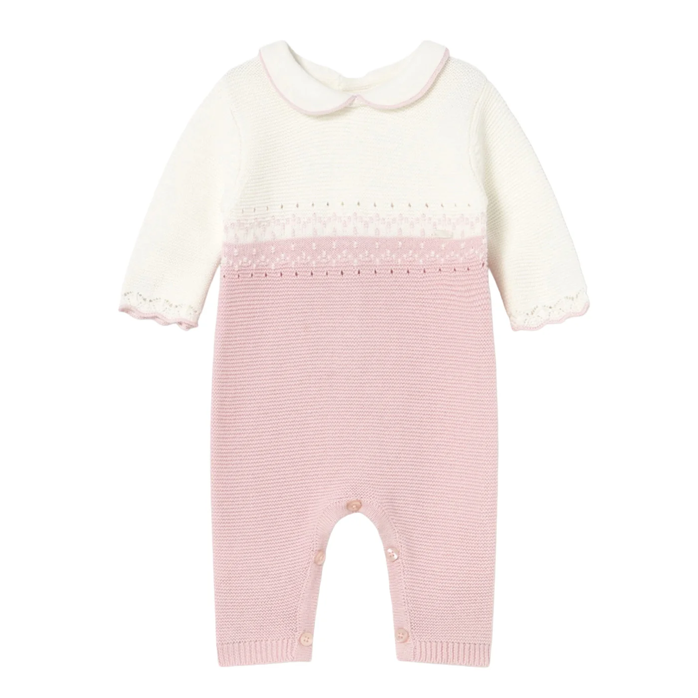 Mayoral tutina neonata in tricot rosa panna Maniche lunghe Collo peter pan Dettagli ricami Chiusura entrogamba e sul retro con bottoniComposizione: 100% cotoneMade in CinaCollezione Autunno Inverno Vestibilitร :Taglia Etร