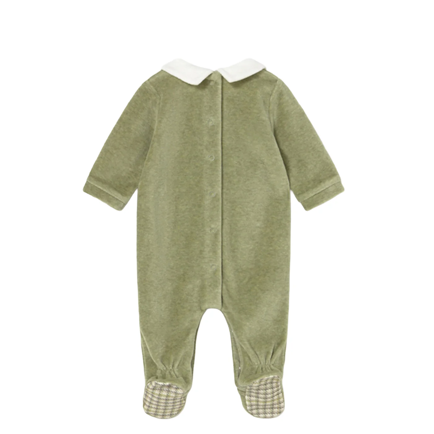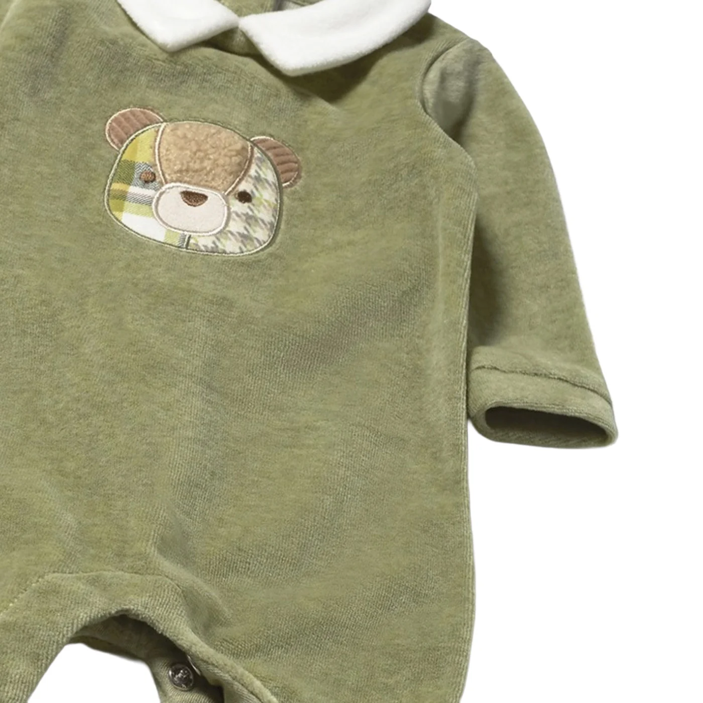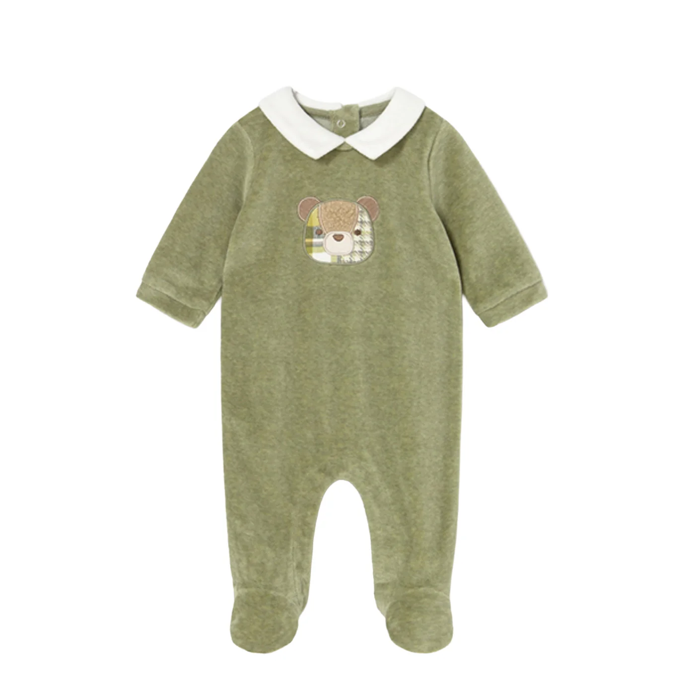 Mayoral tutina neonato con piedini in ciniglia verde Collo a camicia Ricamo frontale Chiusura entrogamba e sul retro con bottoni a pressionePiedini fantasiaComposizione: 75% cotone 25% poliestereMade in CinaCollezione Autunno Inverno Vestibilitร :Taglia Etร
