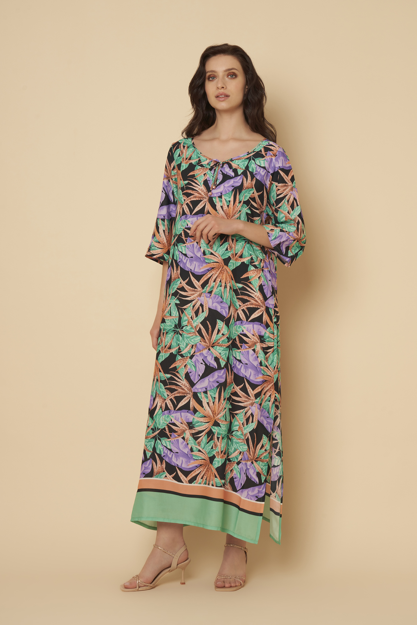 MIAMI Abito caftano lungo in tela di viscosa 100% in fantasia foliage e cornici sul fondo