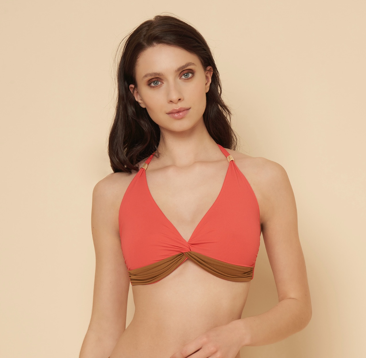 Reggiseno a top double-face in microfibra tinta unita con accessori dorati in metallo nikel free sulle spalline. Senza coppe interne. Disponibile nella varianti colore CORALLO/TABACCO, VERDE/GLICINE e NERO/BIANCO.