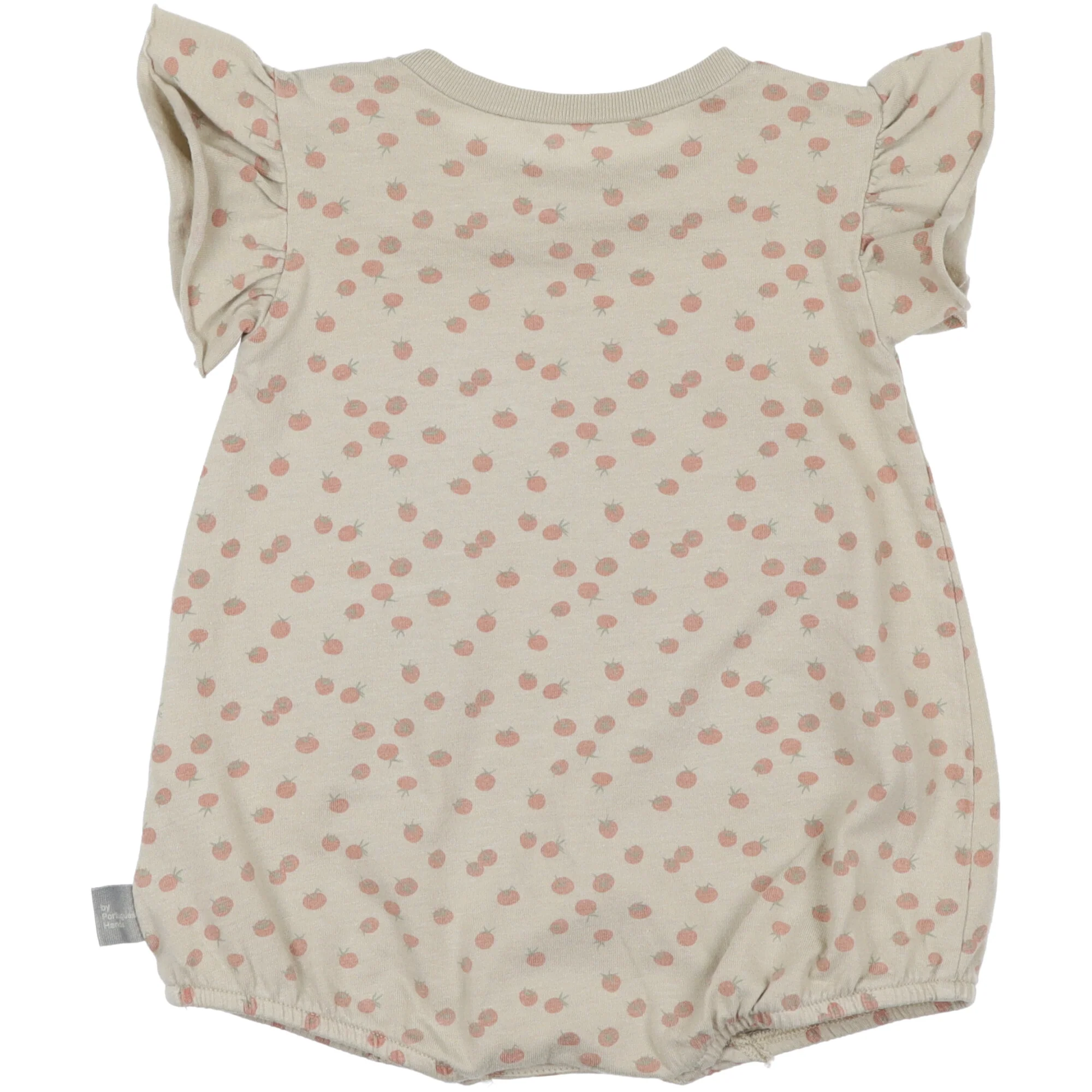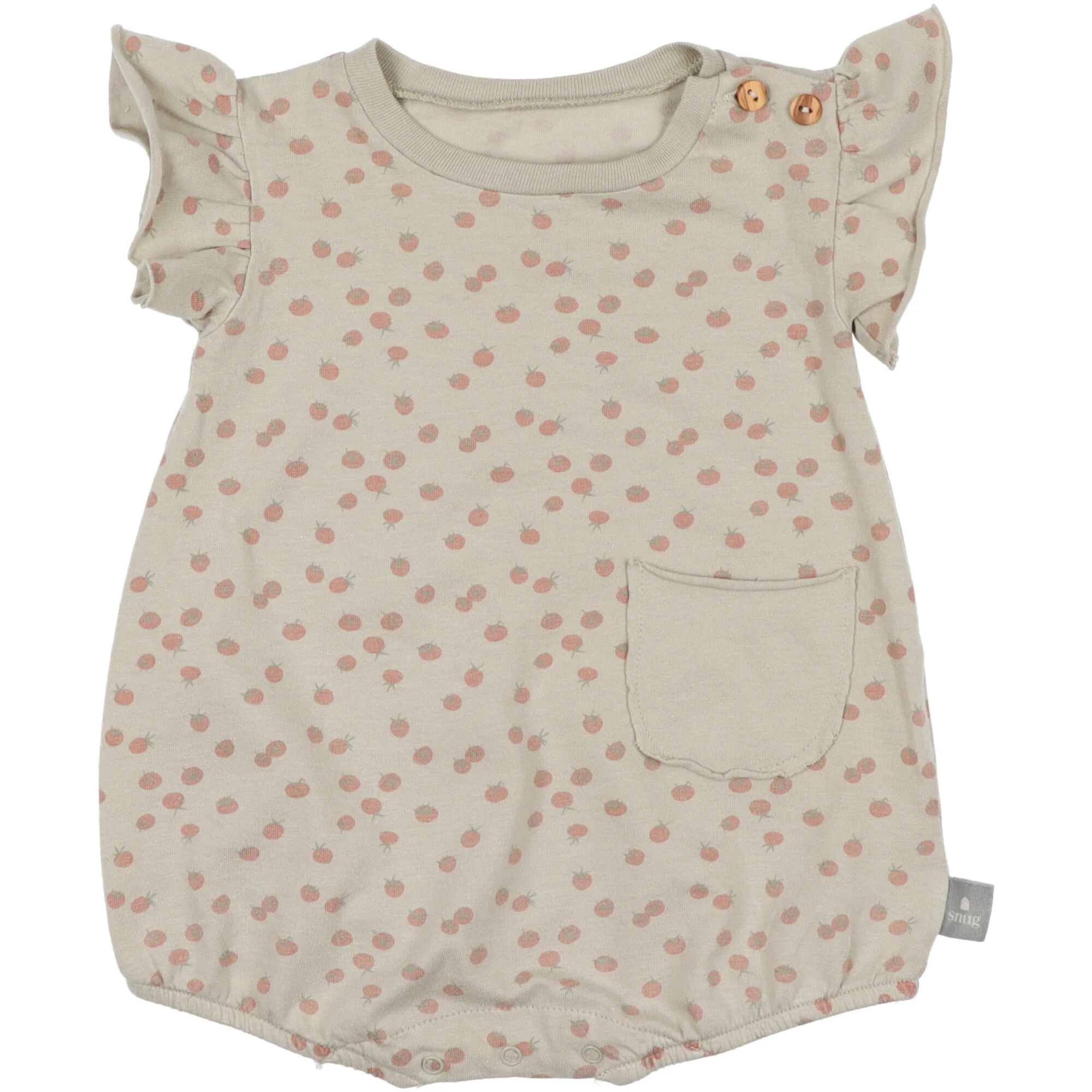 Realizzato in cotone organico e riciclato con tasca sul davanti e volant sulle maniche. Chiusura sulla spalla con bottoni in legno e con bottoni a pressione tra le gambe. Morbido elastico sulle gambe.