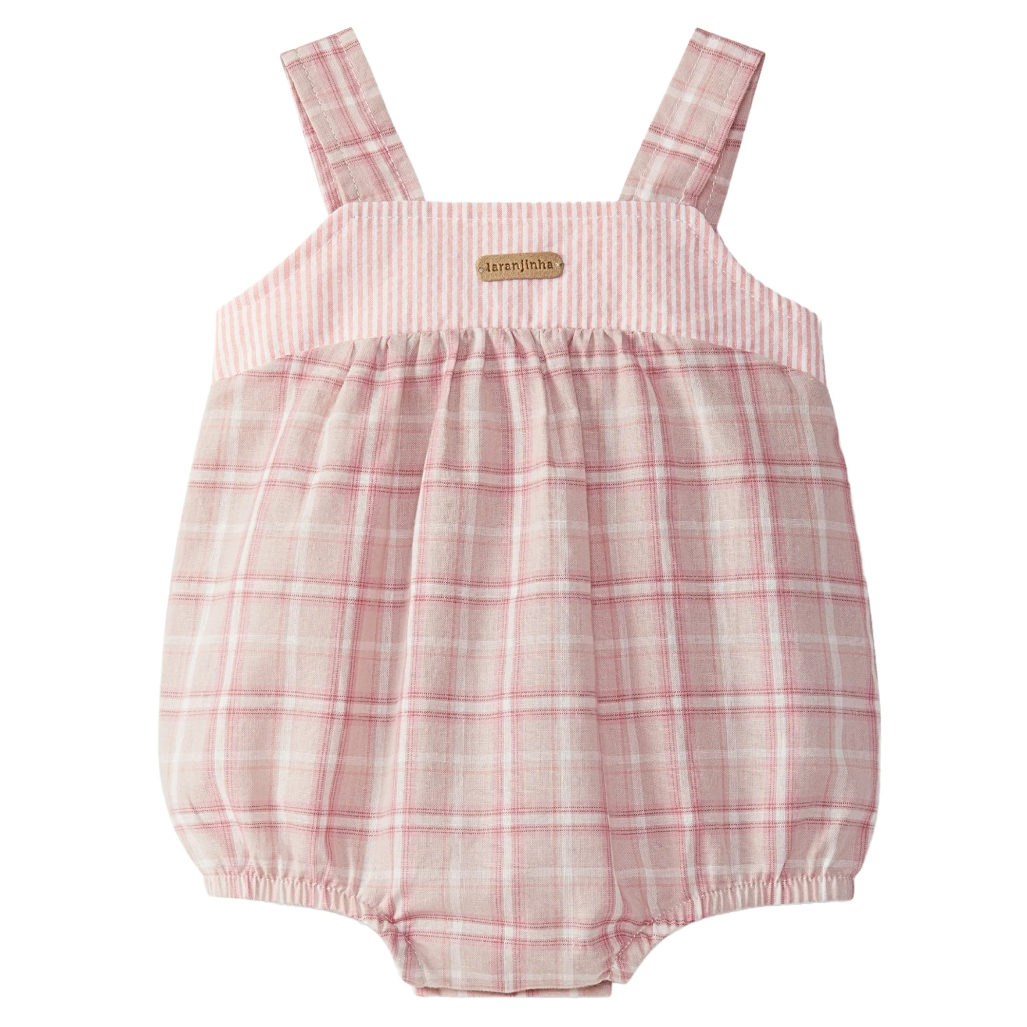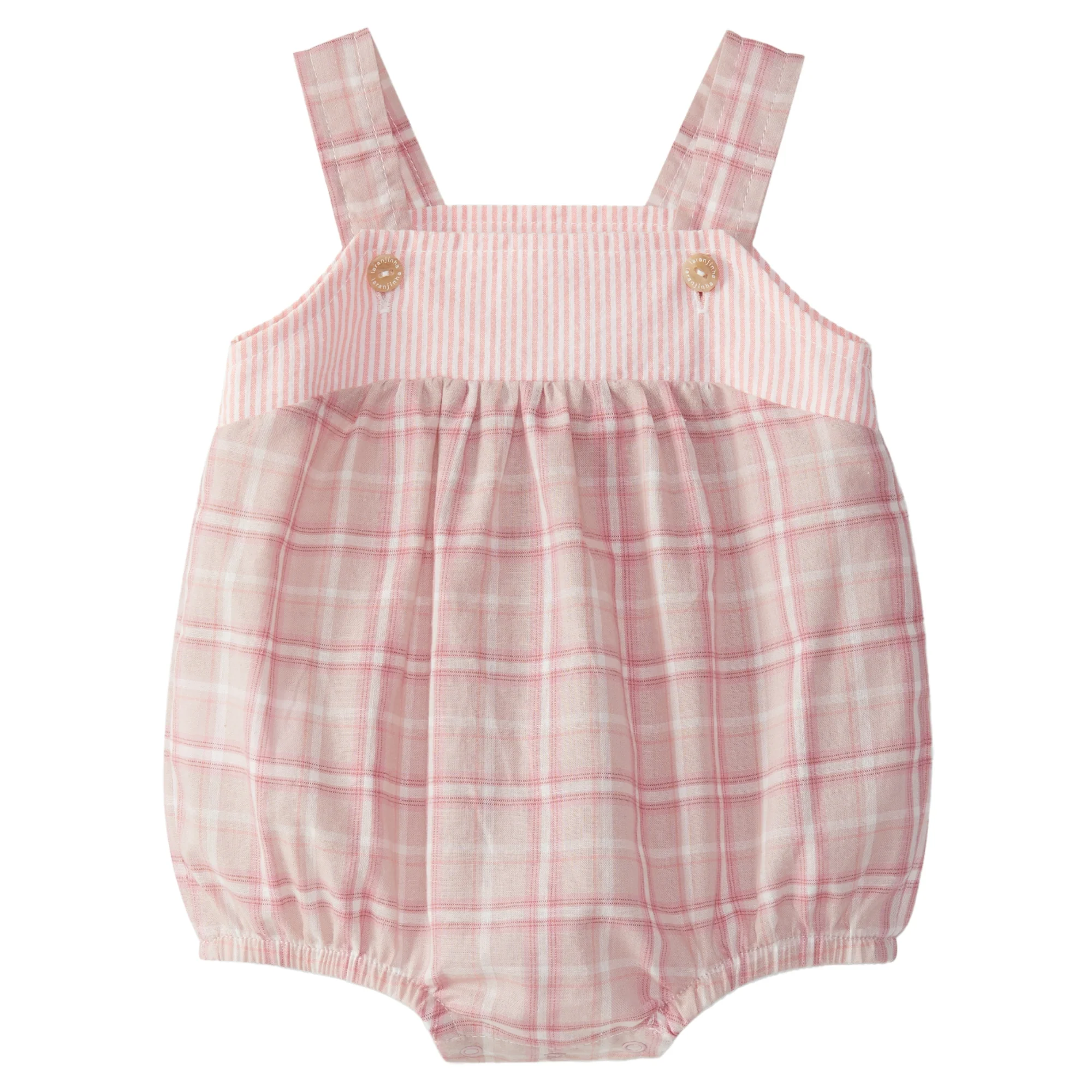 Pagliaccetto in morbido tessuto scozzese con carrรฉ sul petto in tessuto rigato. Si chiude con bottoni sulle spalline regolabile in due posizioni e bottoni a pressione tra le gambe fino a 12 mesi.