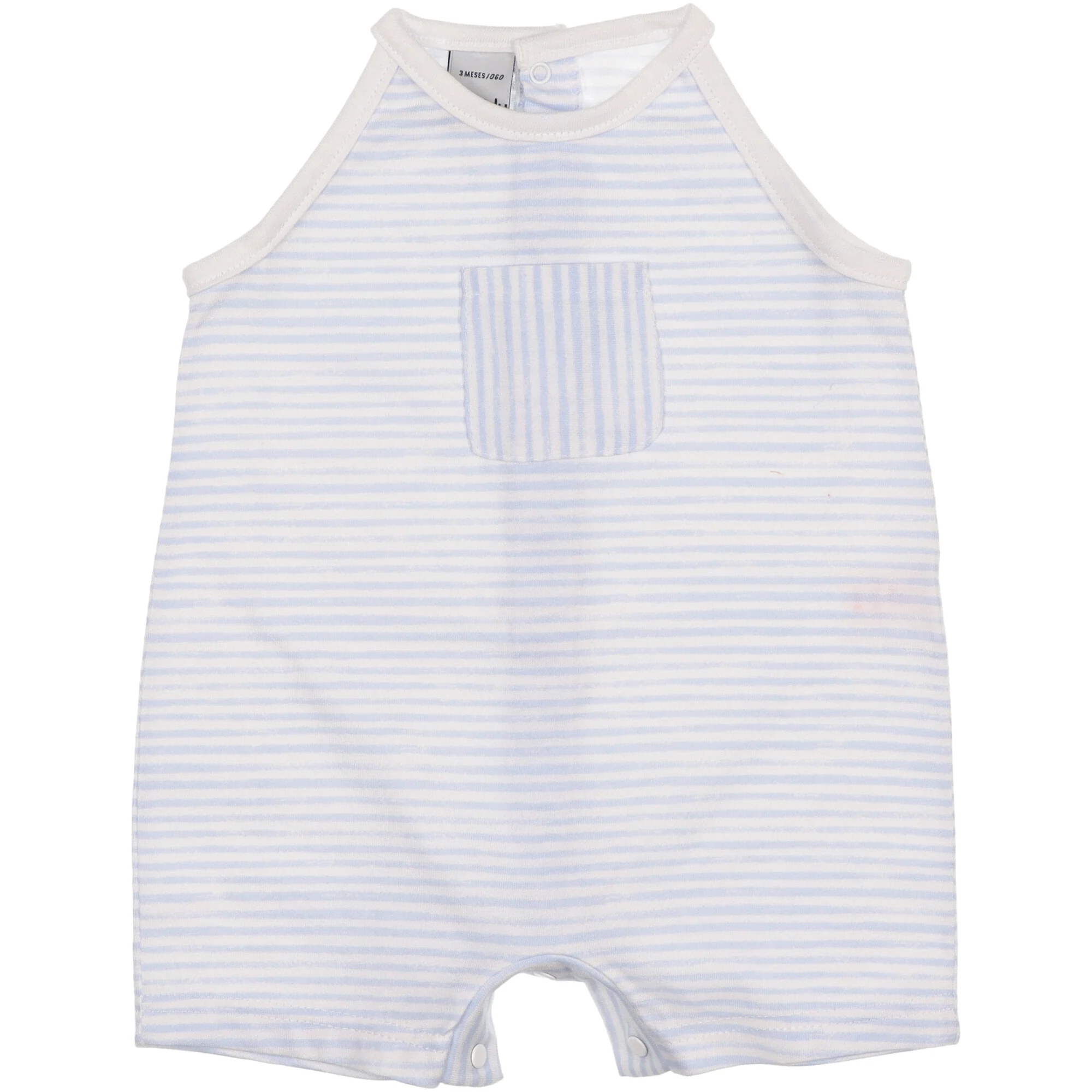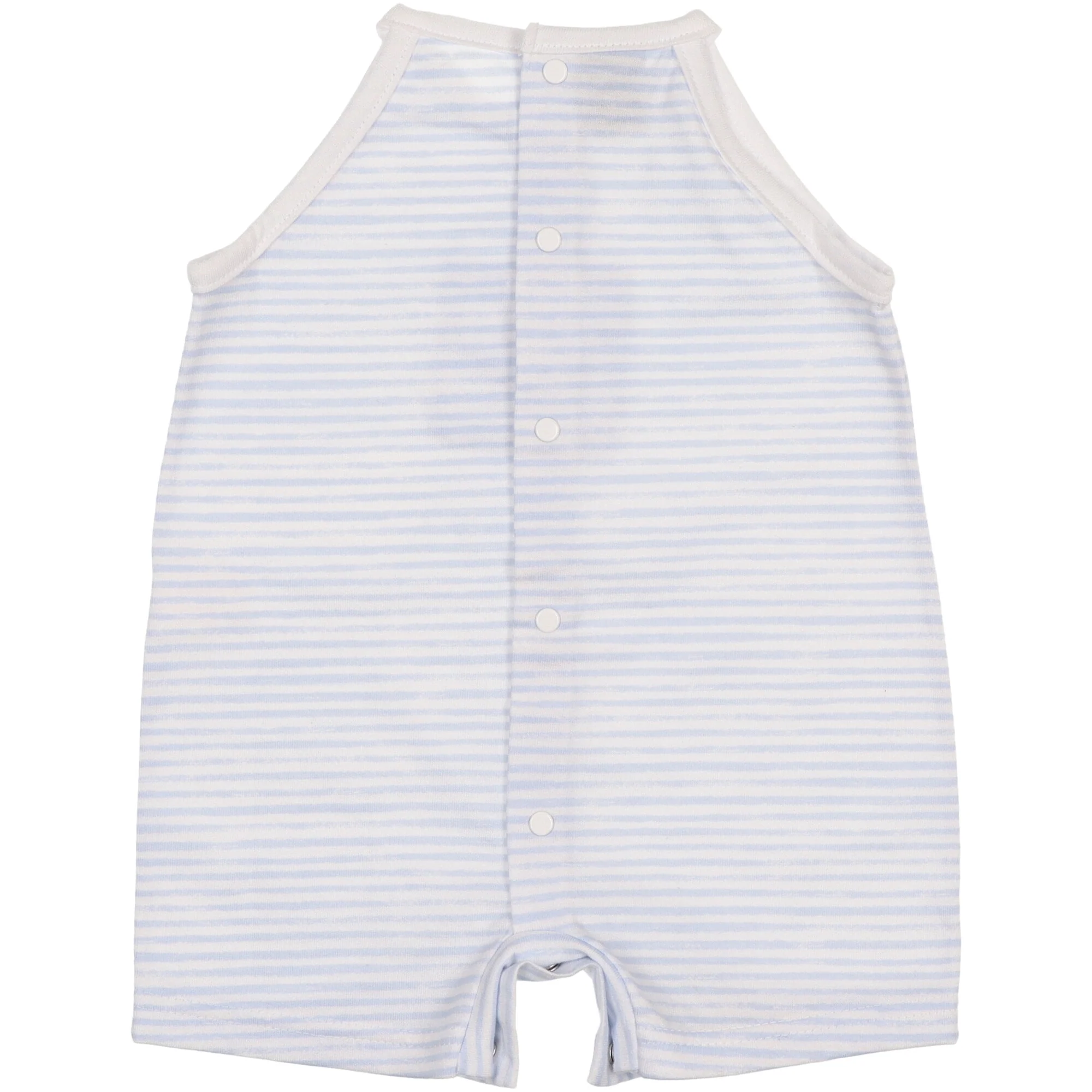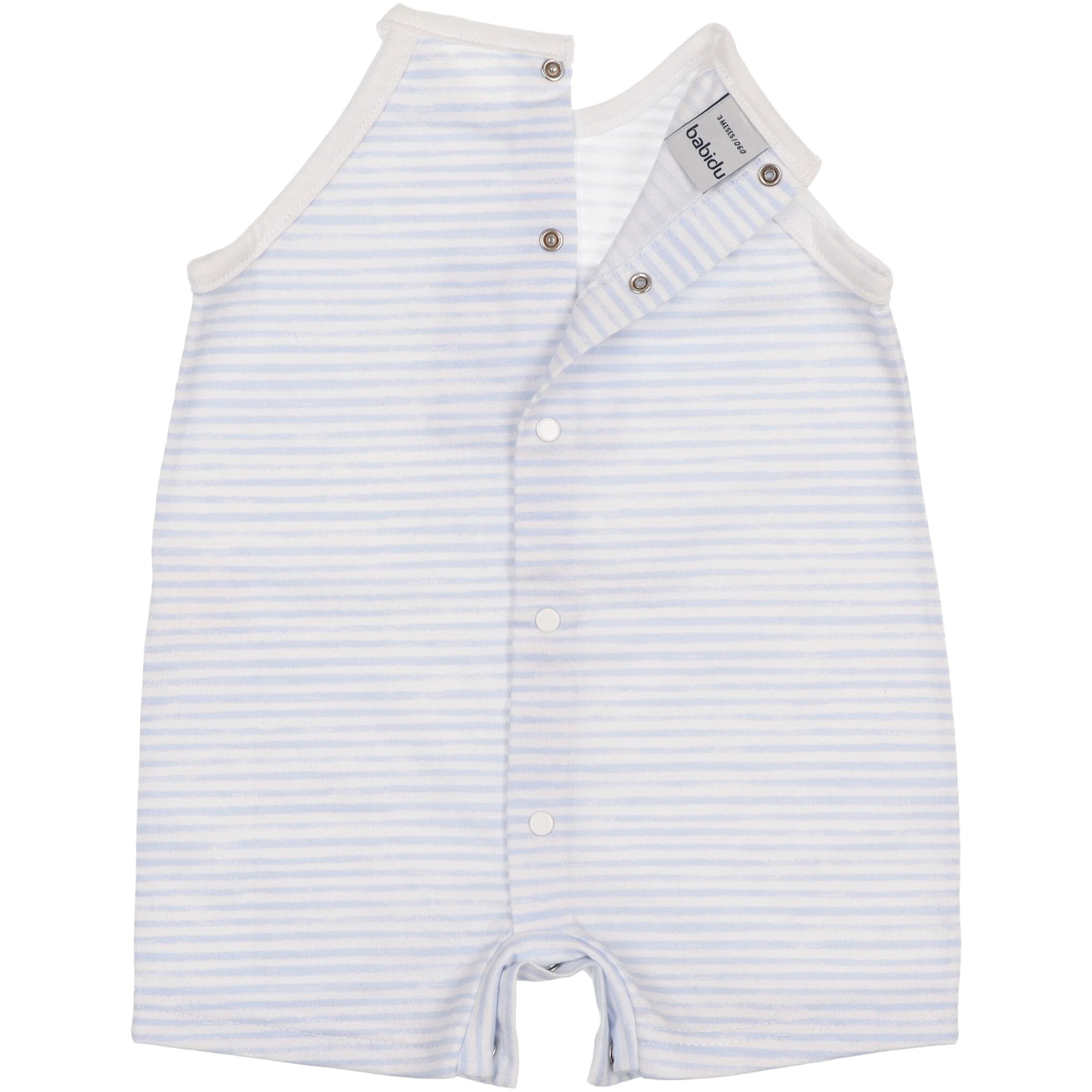 Morbido jersey fantasia riga azzurra e bianca apertura completa dietro con bottoni a pressione e sul cavallo.Composizione: 100% cotone.Cura: lavaggio ad acqua, non candeggiare, si puรฒ stirare, si lavaggio a secco, no asciugatrice.
