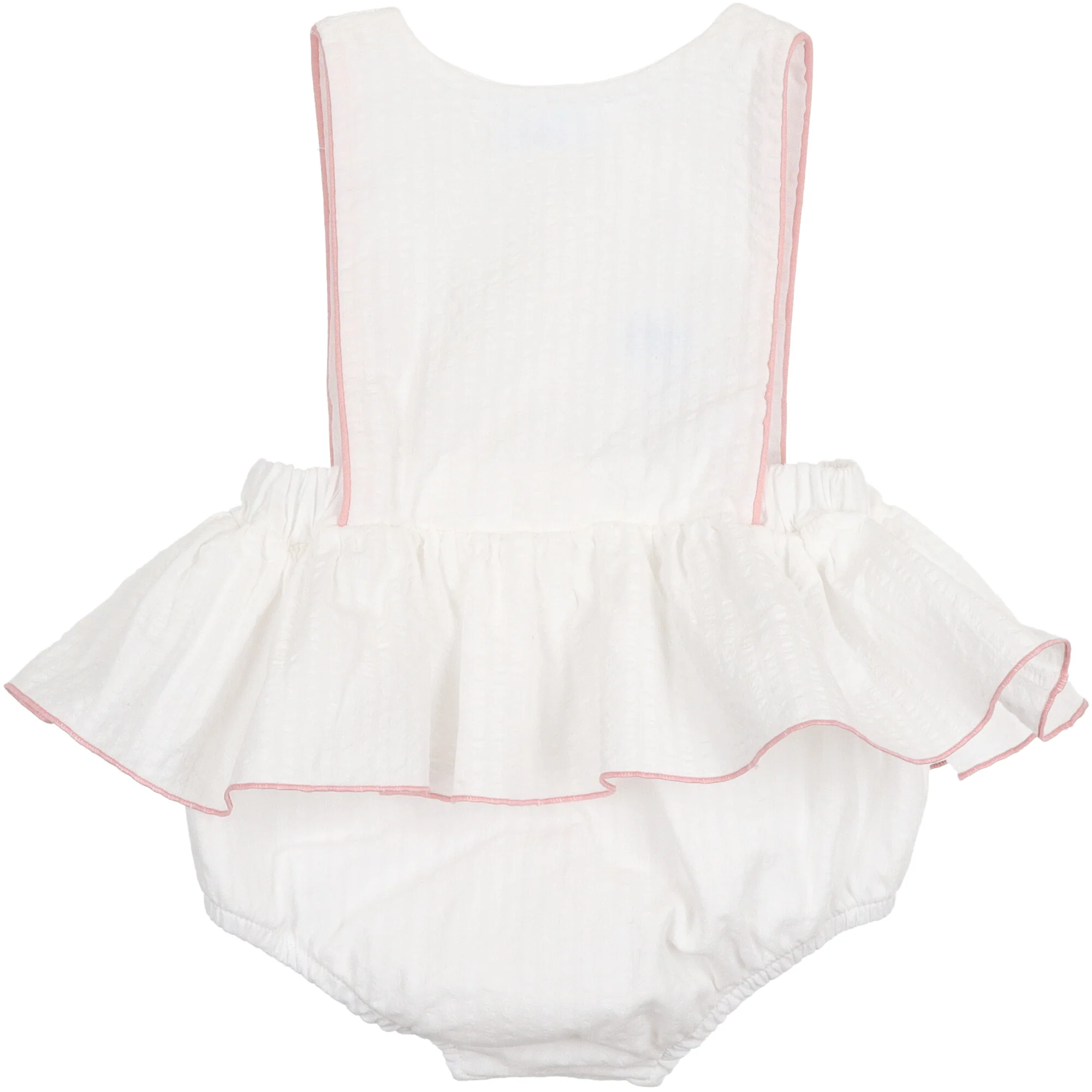 Pagliaccetto realizzato in leggera e morbida mussola foderato, elastico in vita e sulle coscie e ampio volant su tutta la vita apertura davanti con bottoni. Delicato profilo a contrasto.