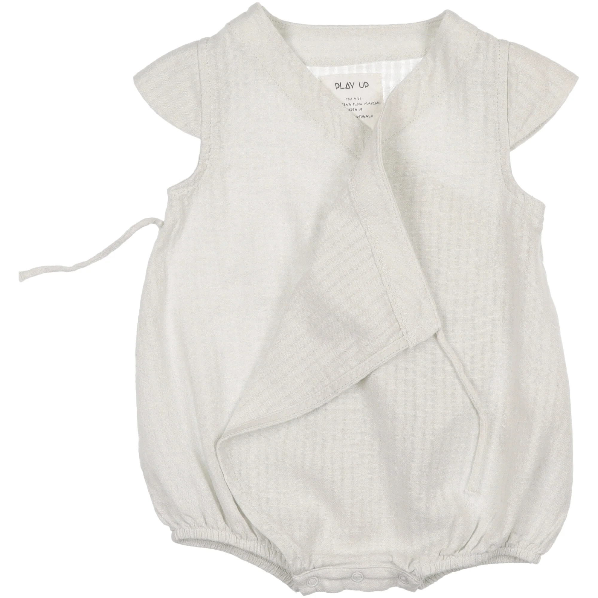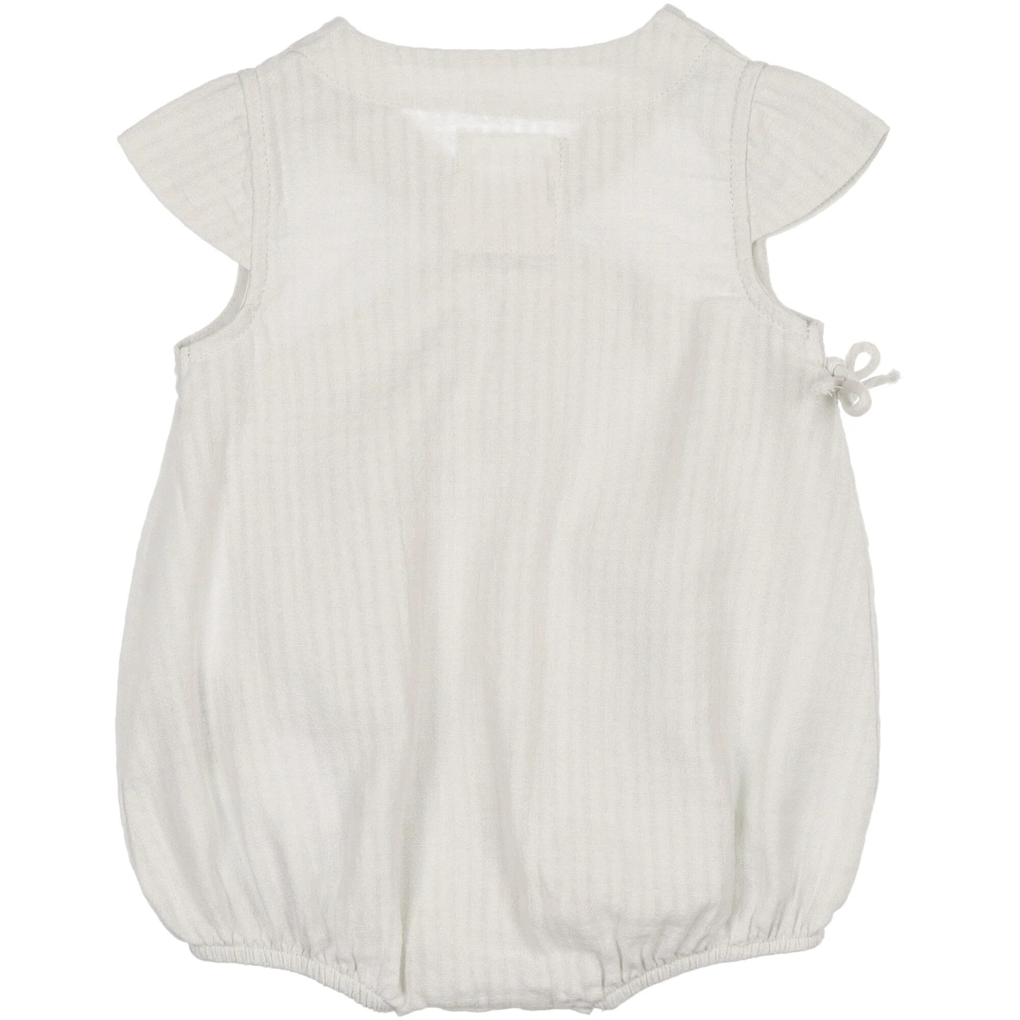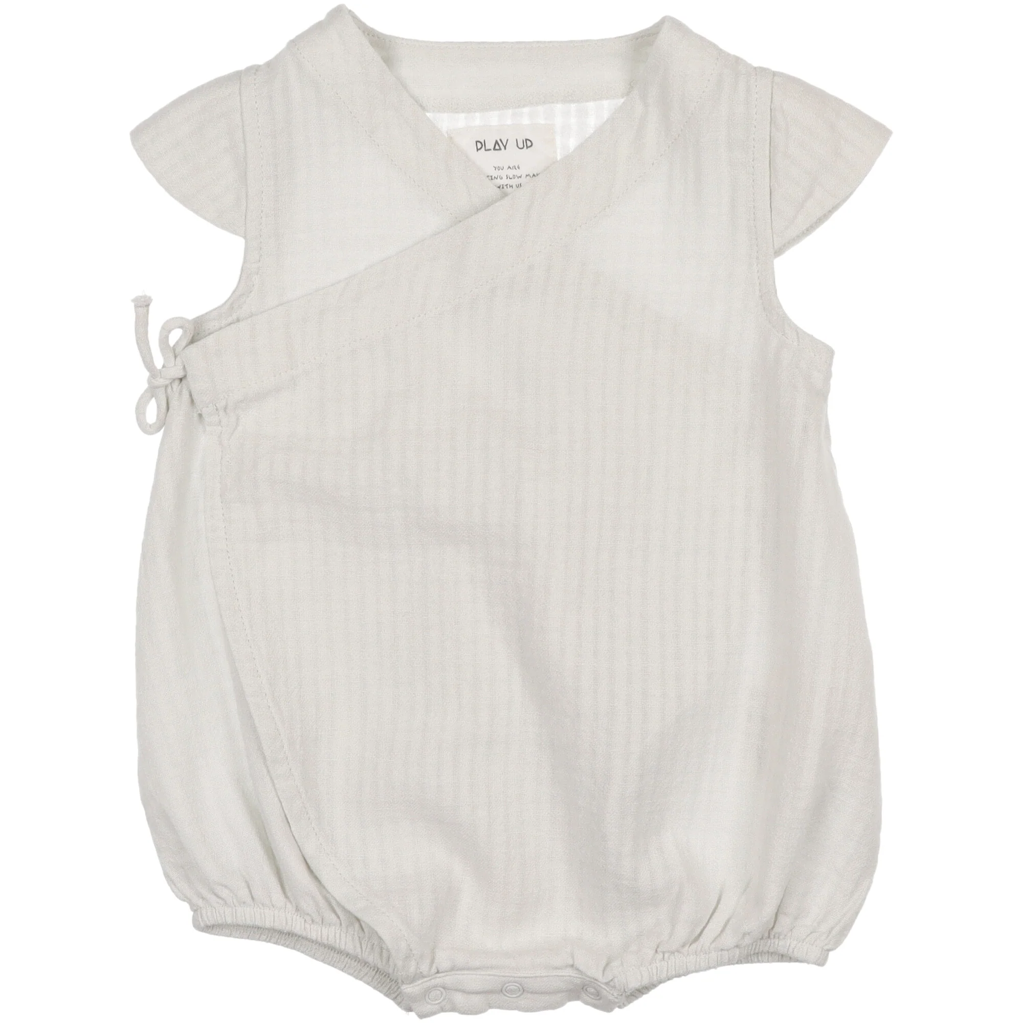 Pagliaccetto in tessuto di cotone morbido e leggero, scollo a V e maniche corte, apertura a portafoglio con bottone a pressione all’interno e laccetto sull’esterno. Morbido elastico sulle gambe e apertura sul cavallo con bottoni a pressione in metallo senza nichel.