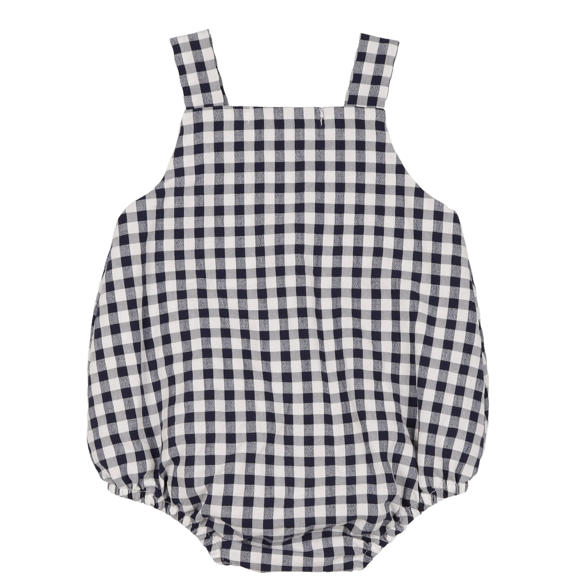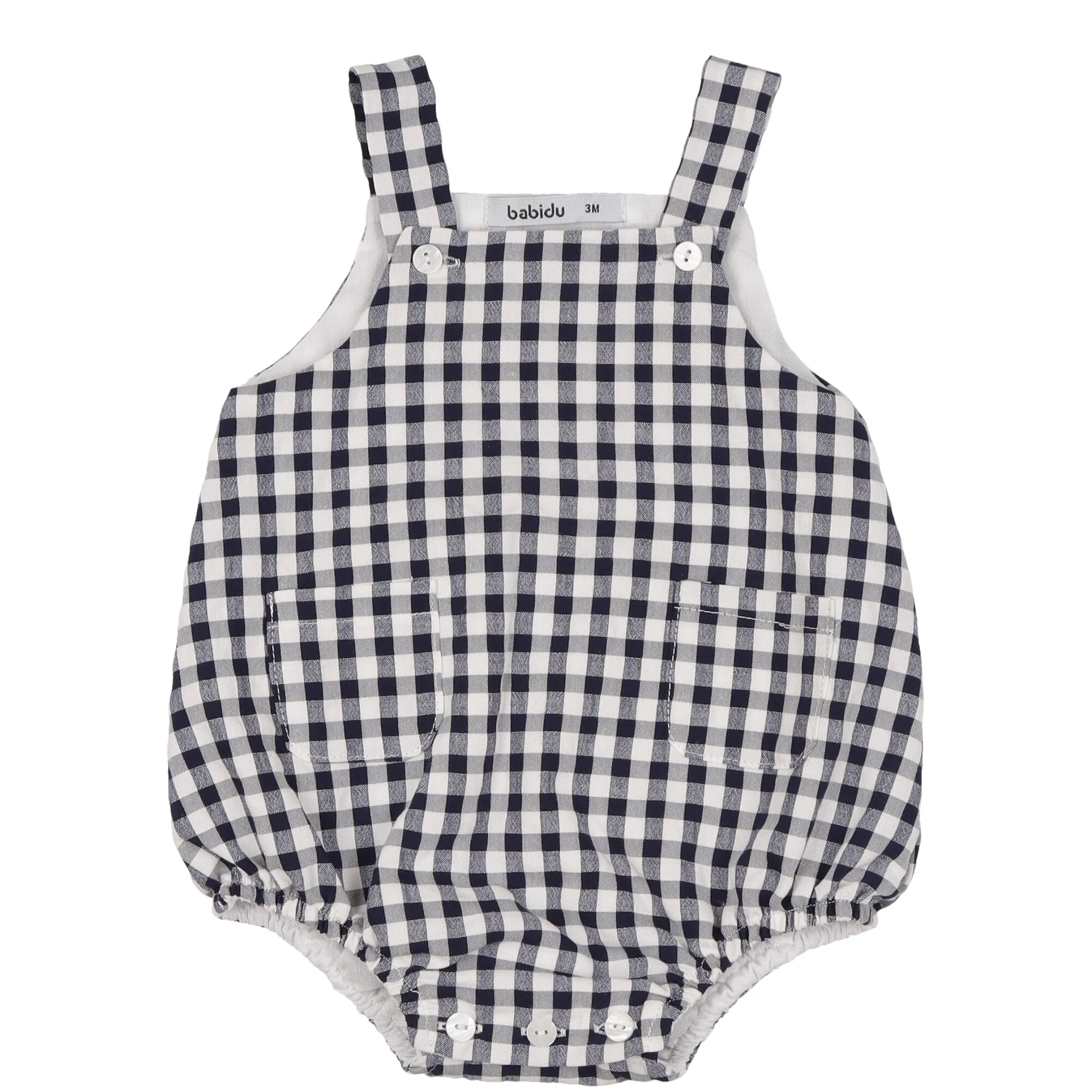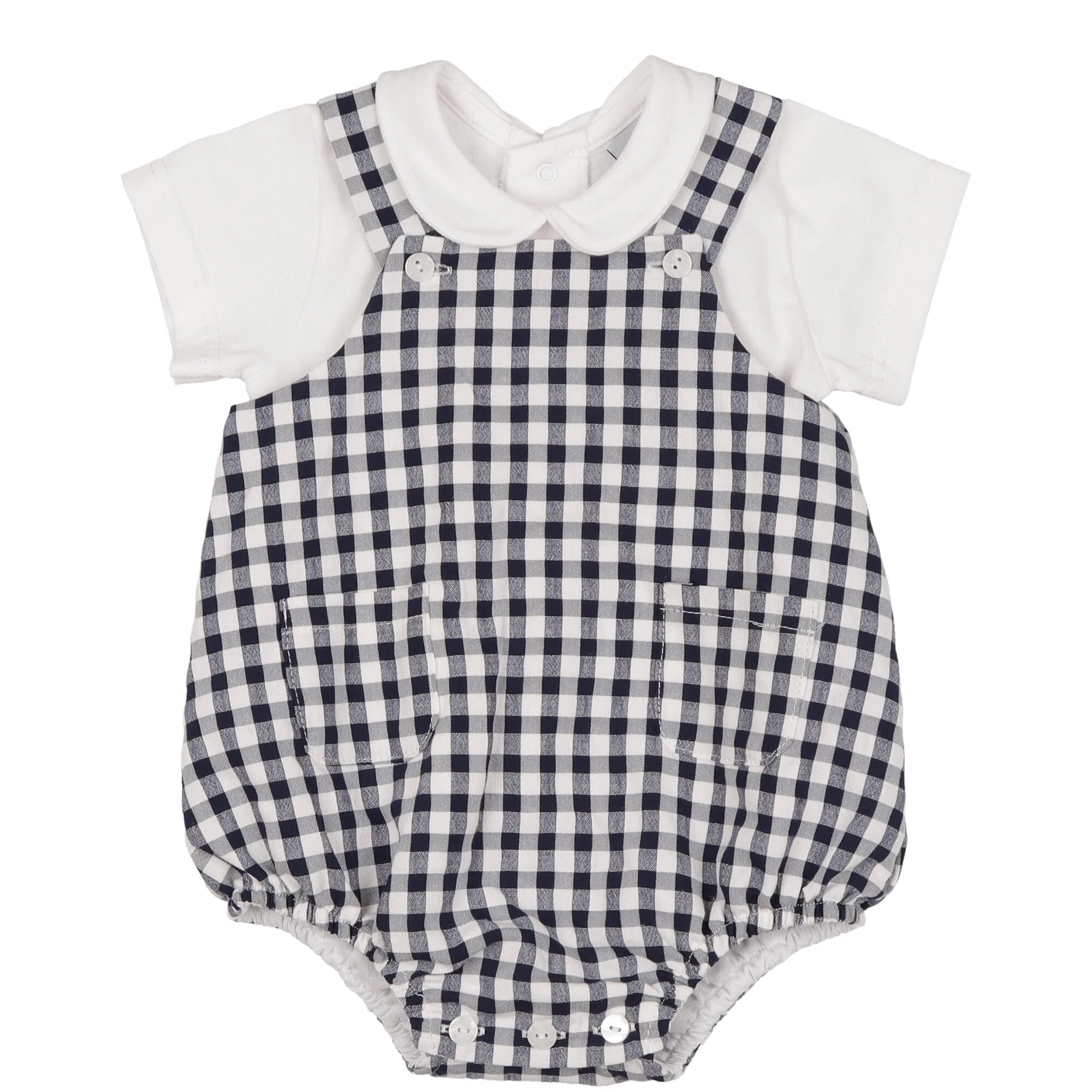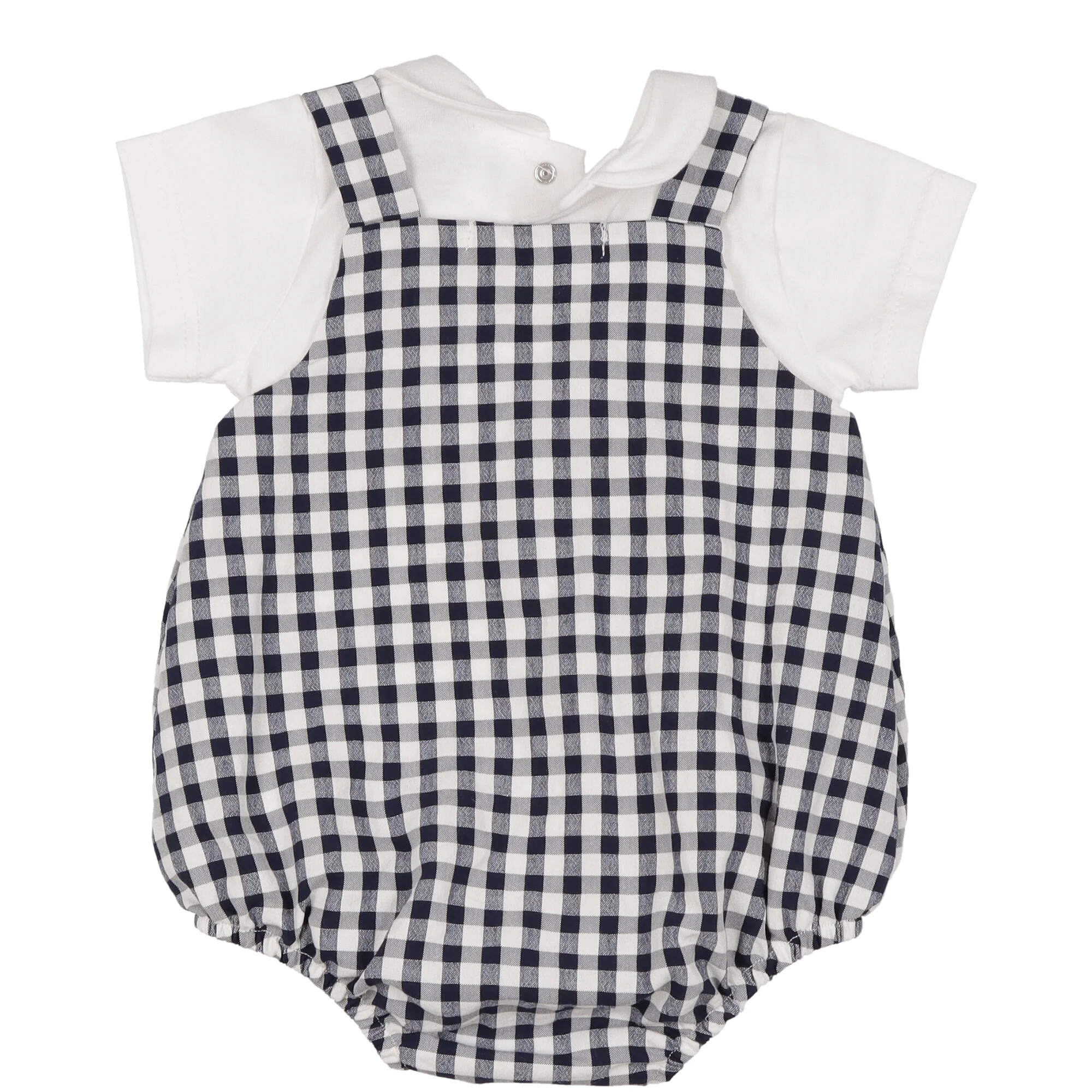 Dettaglio: pagliaccetto realizzato in morbido e leggero cotone fantasia quadri blu e bianco con bottoni ed asole sul cavallo e sulle bretelle, completamente foderato. T-shirt realizzata in morbido jersey bianca mezza manica con colletto arrotondato, chiusura dietro con bottoni a pressione.