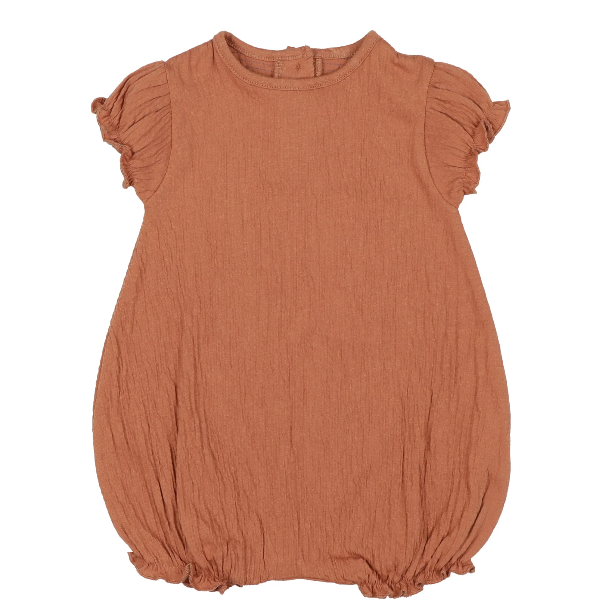 Realizzato in garza di cotone biologico, collo rotondo e maniche corte con elastici, apertura sulla schiena con bottoni ad asola e sul cavallo con bottoni a pressione in metallo senza nichel, morbido elastico giro coscia. Tutte le materie prime utilizzate in questo capo vantano una certificazione