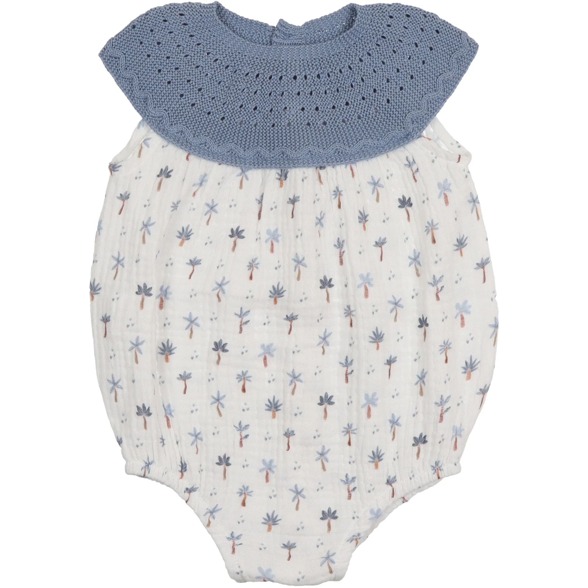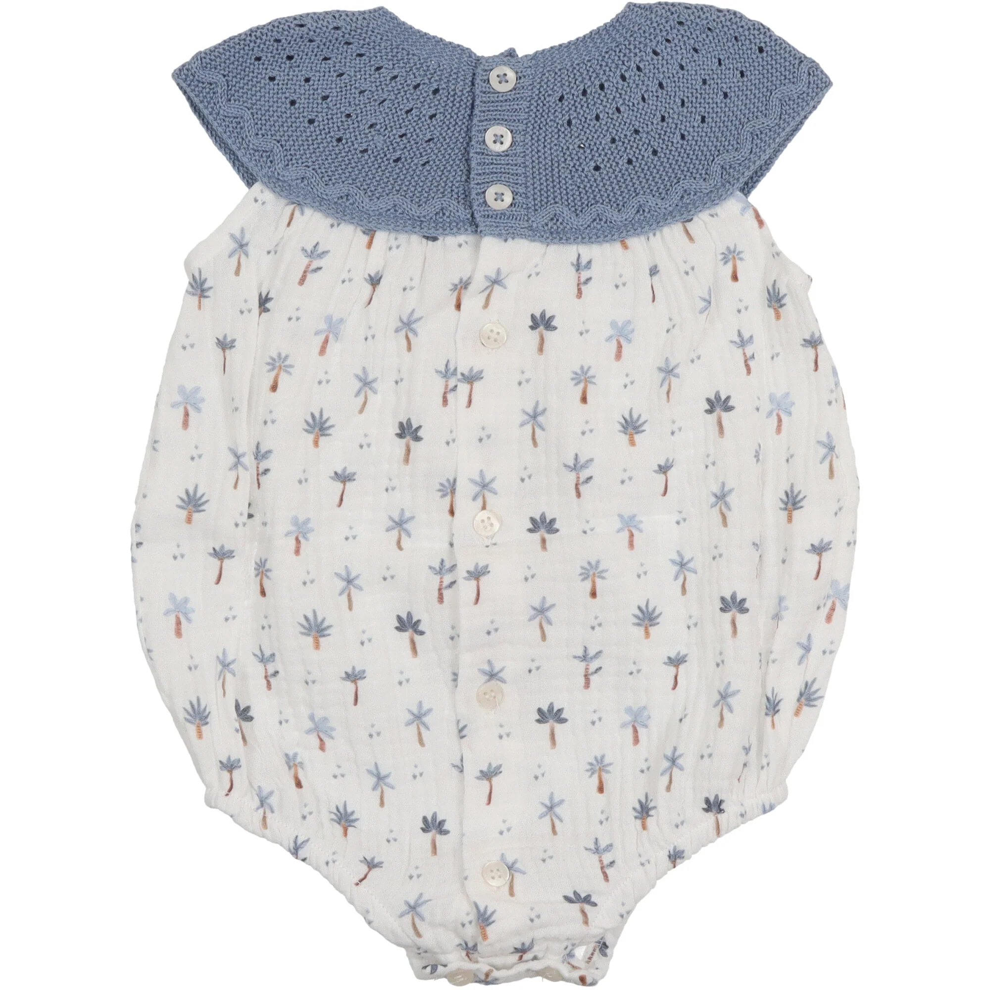 Pagliaccetto realizzato in leggera e morbida mussola, delizioso collo in filo di cotone colore carta da zucchero, morbido elatico sulle coscie, apertura dietro con bottoni.