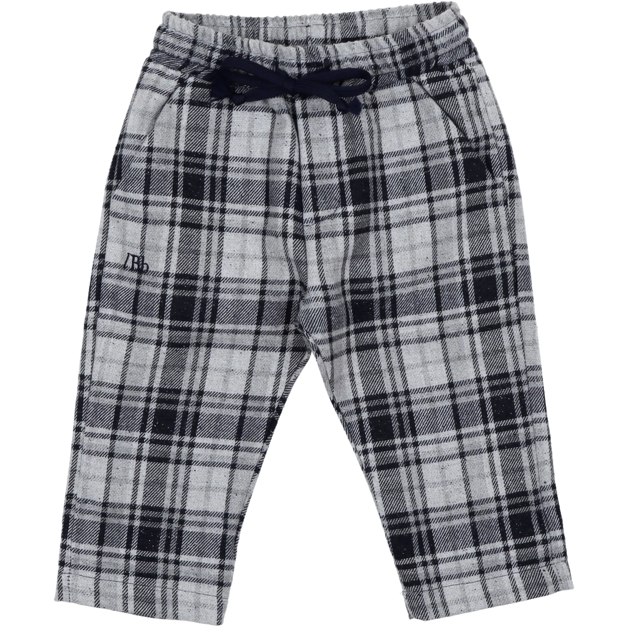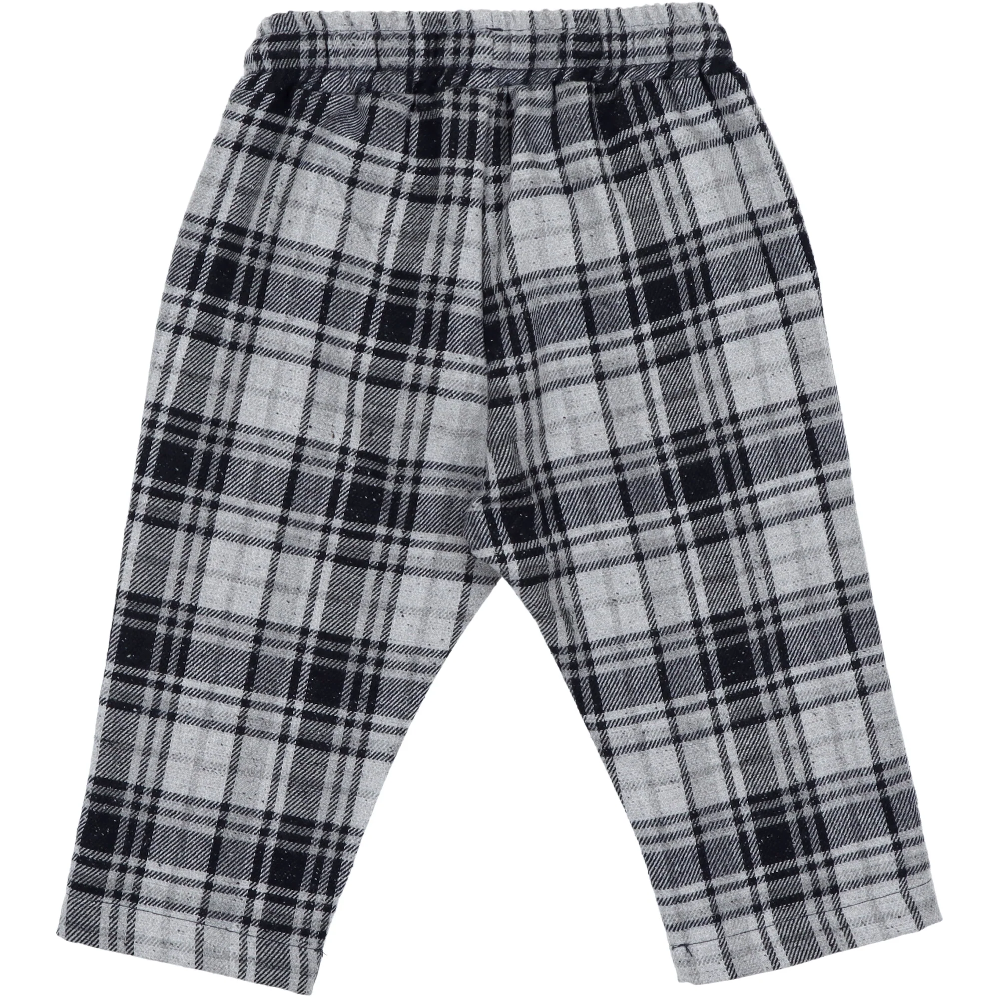Pantalone a quadri grigio e blu, modello sportivo con vita elasticizzata e cordino per regolare la larghezza.