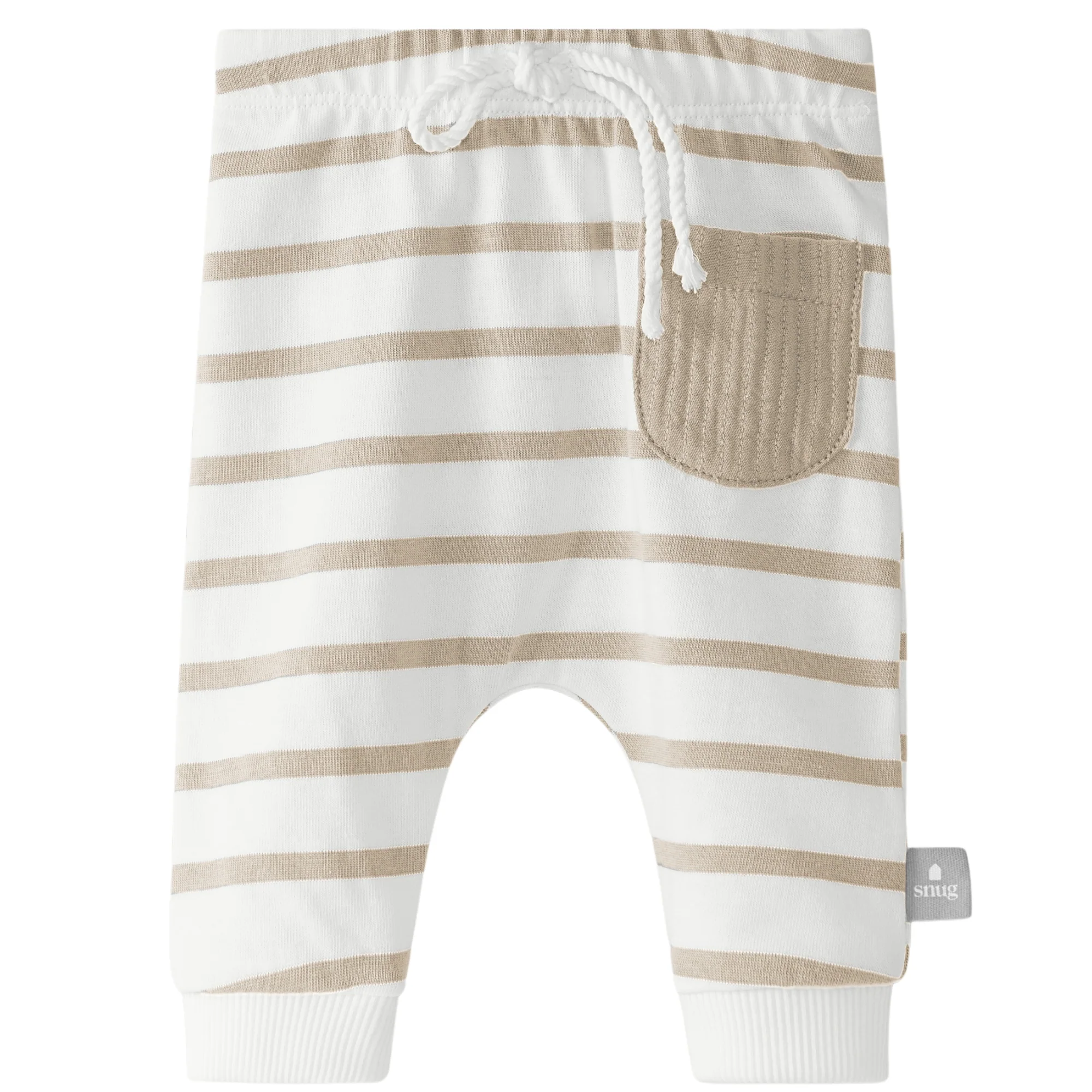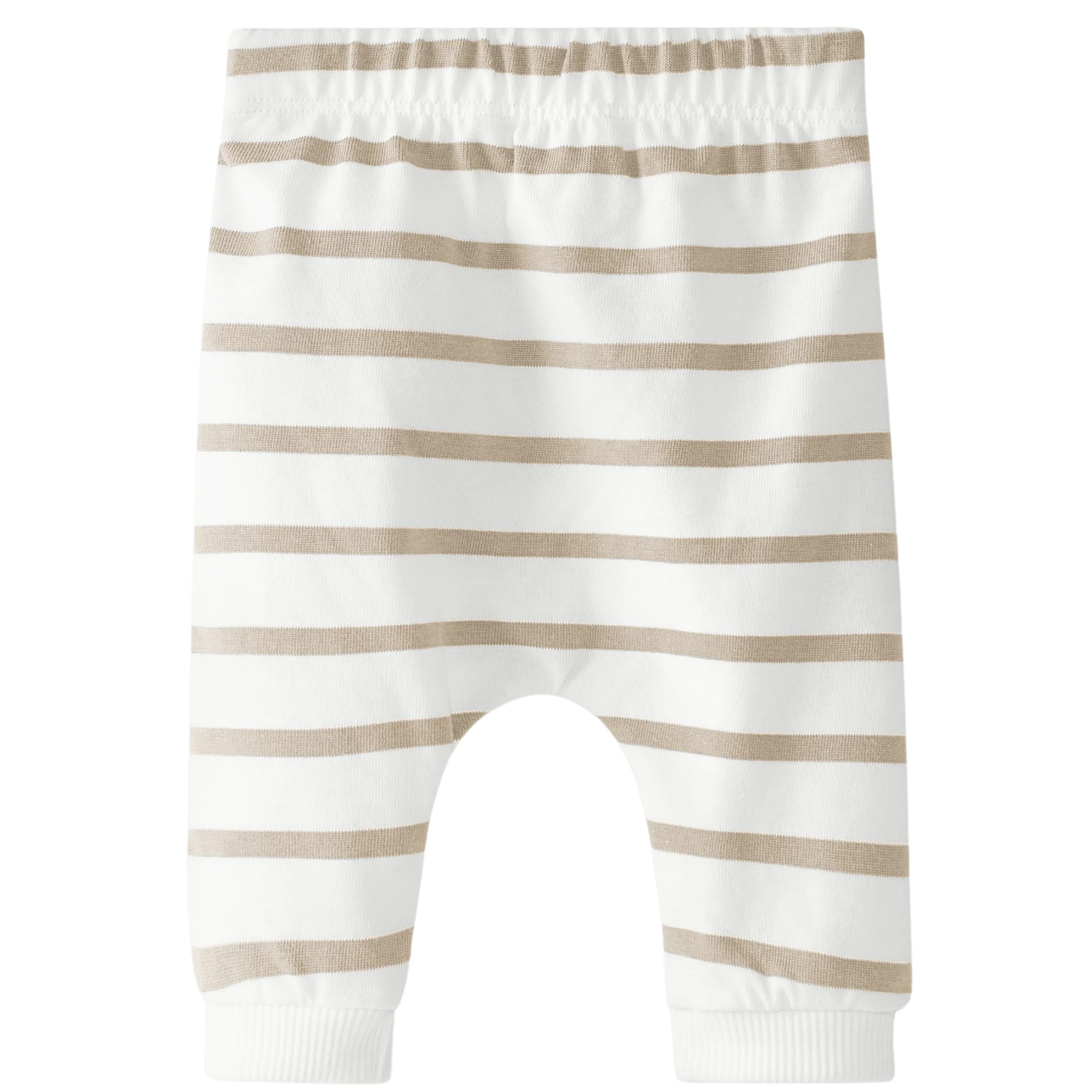 Pantaloni in jersey di cotone riciclato e organico con stampa a righe. Tasca in garza cucita utilizzabile. Elastico in vita con coulisse decorativa.