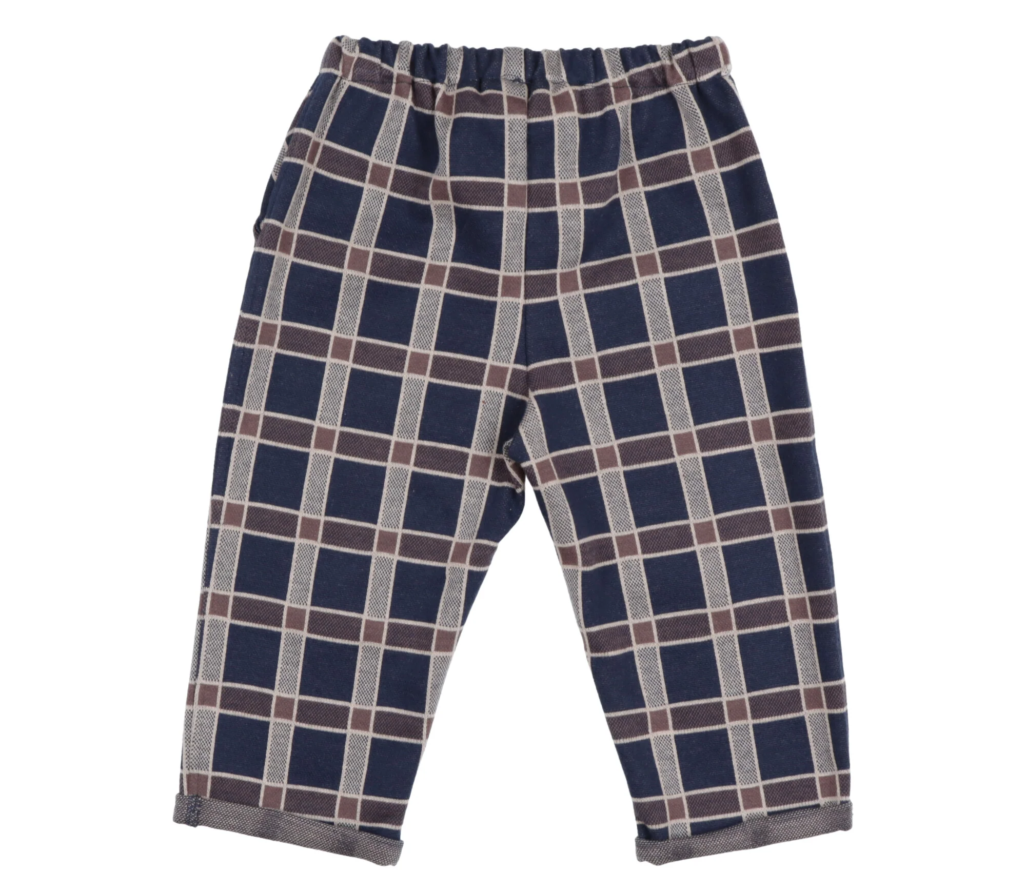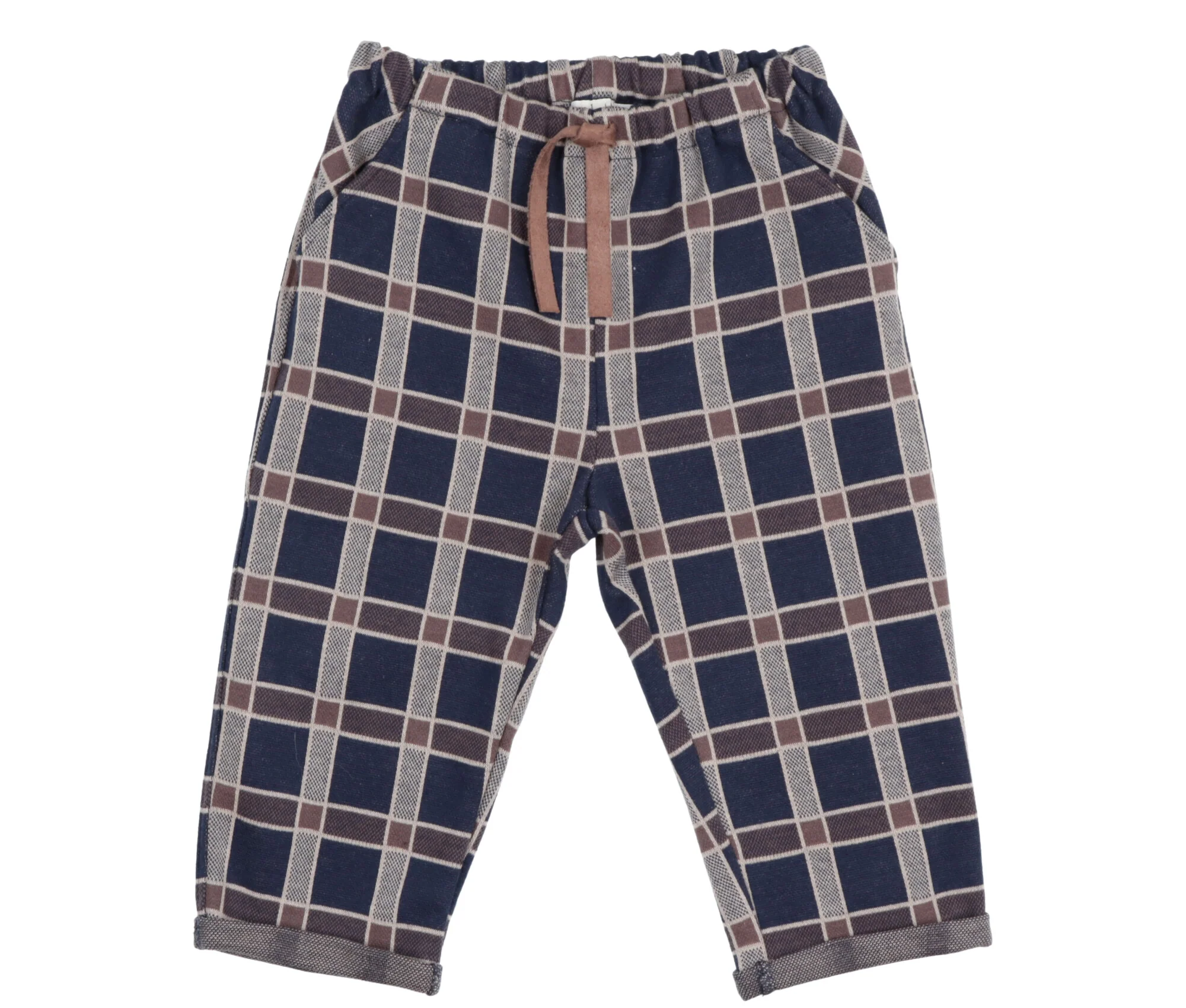 ๏ปฟRealizzato in caldo cotone a quadri blu e marrone, tasche all’americana cucite, decorati in vita con fiocco in camoscio vestibilitร morbida con cintura elastica in vita e risvolto sul fondo. Variante unica. Autentica manifattura italiana.