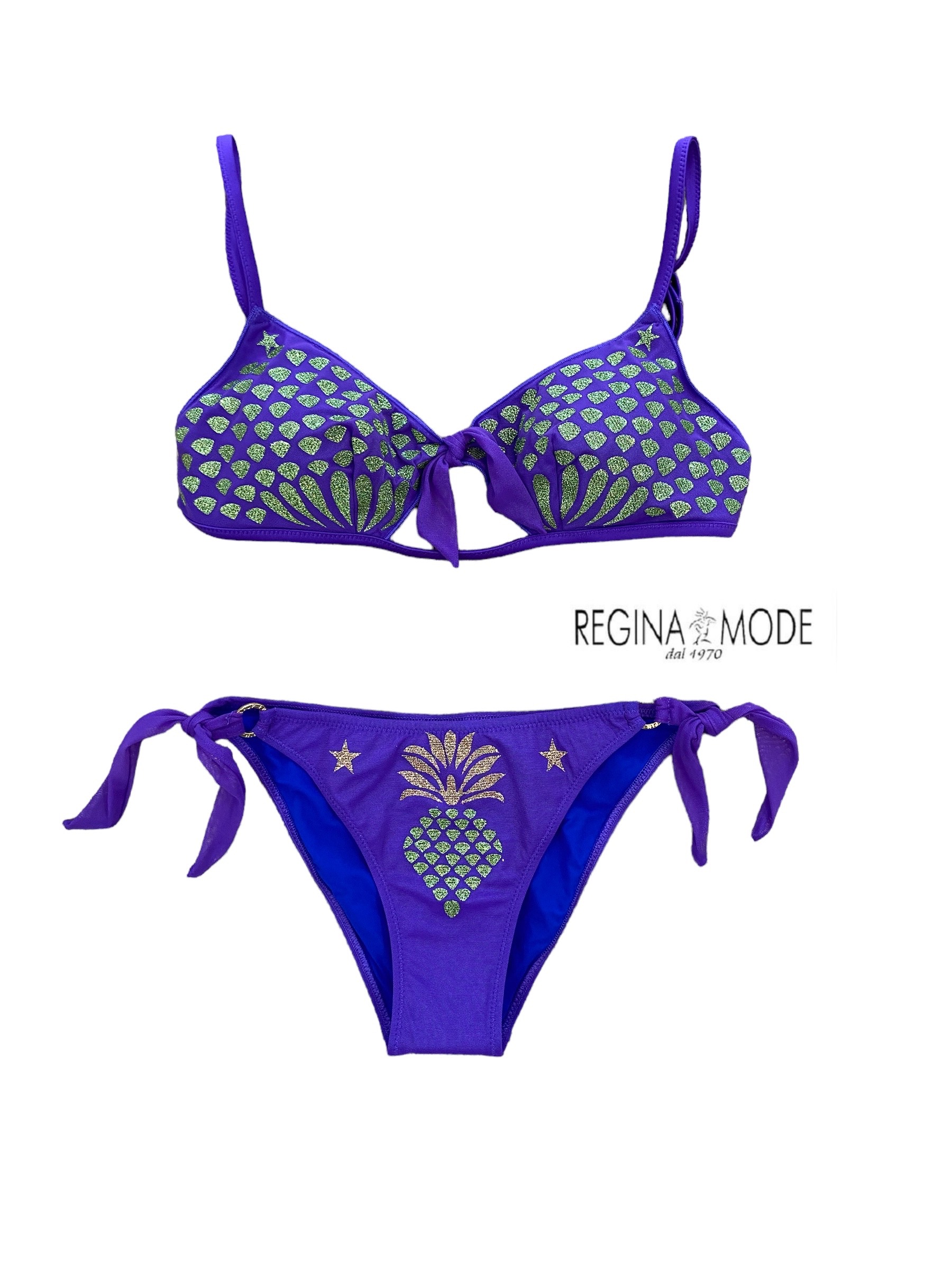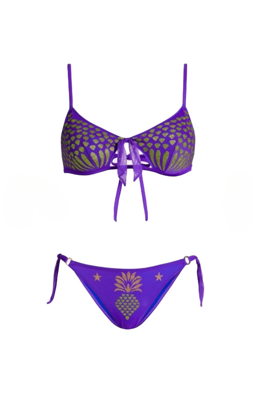 Bikini brassiere tulle con disegno lurex e slip fiocchi.