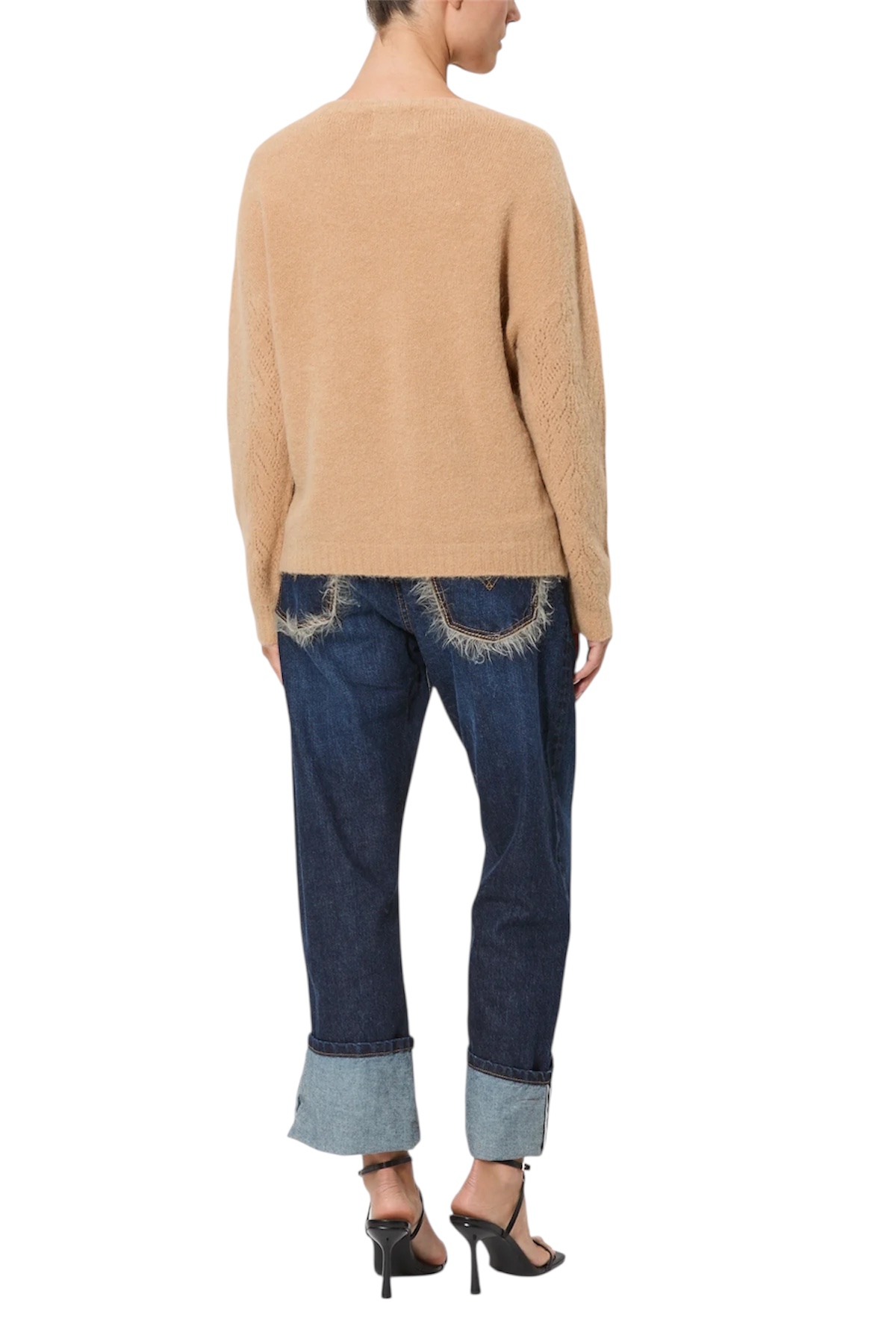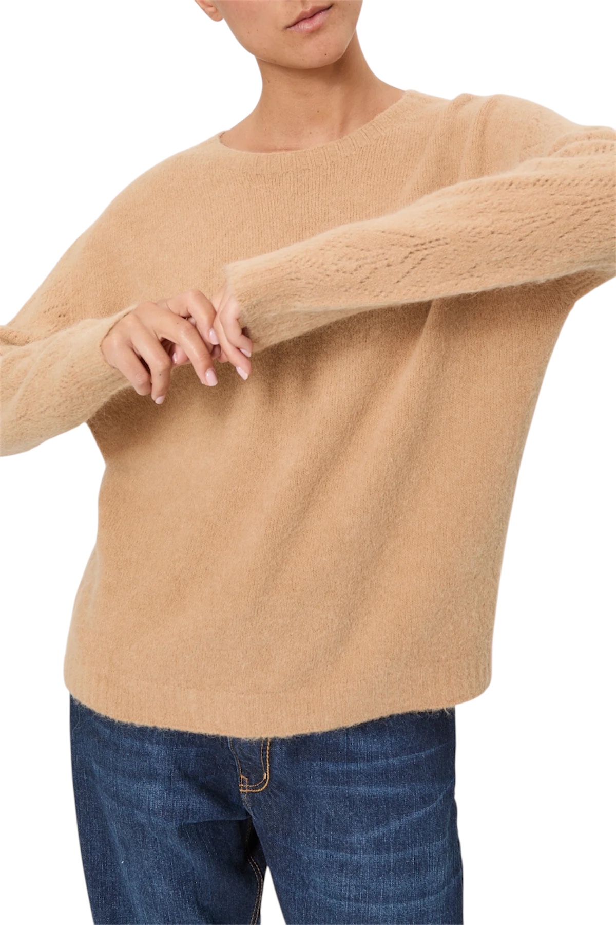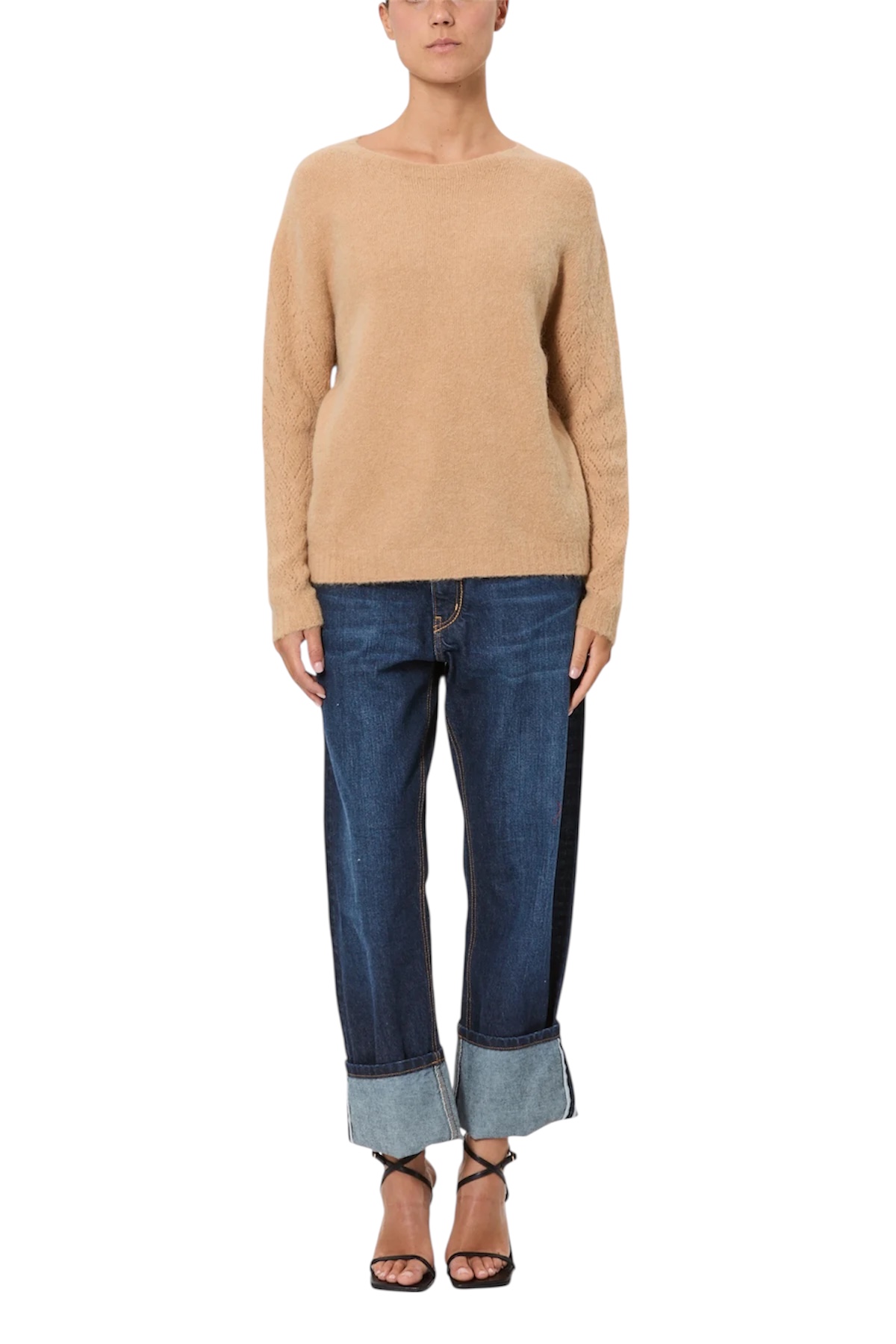 Maglia color cammello in alpaca elasticizzata, girocollo con maniche leggermente traforate effetto pizzo.