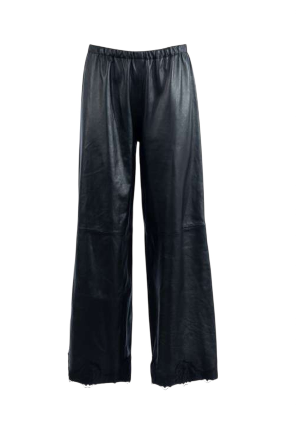 Pantalone pelle nera con elastico in vita e dettagli di pizzo sul fondo. Modello largo.